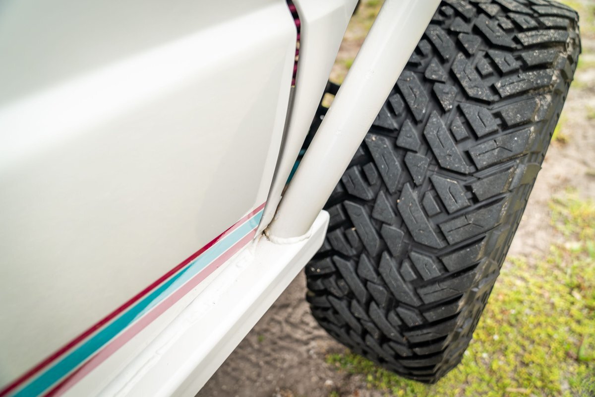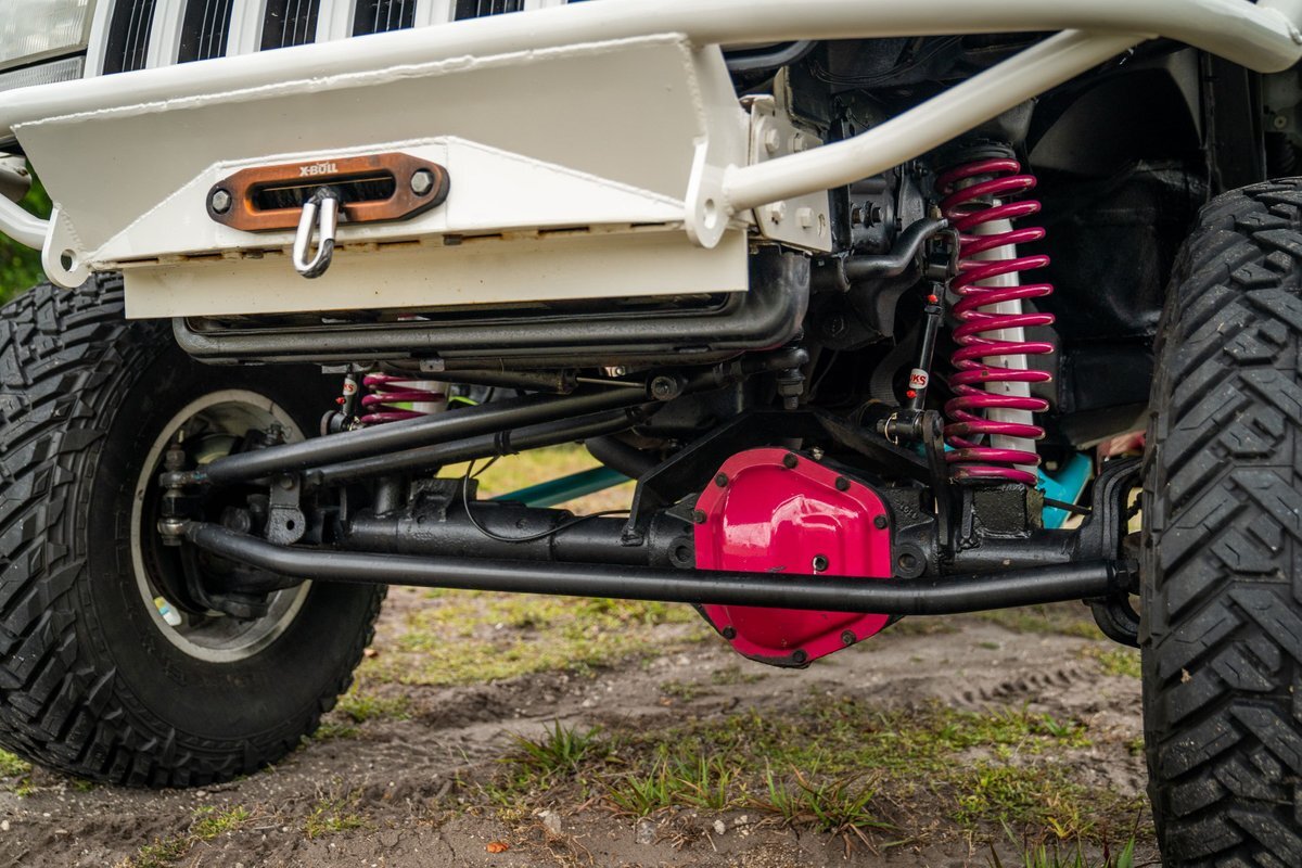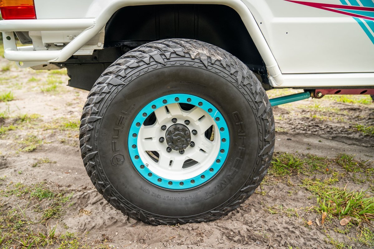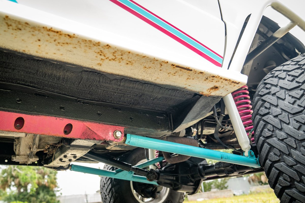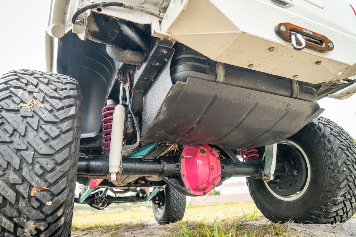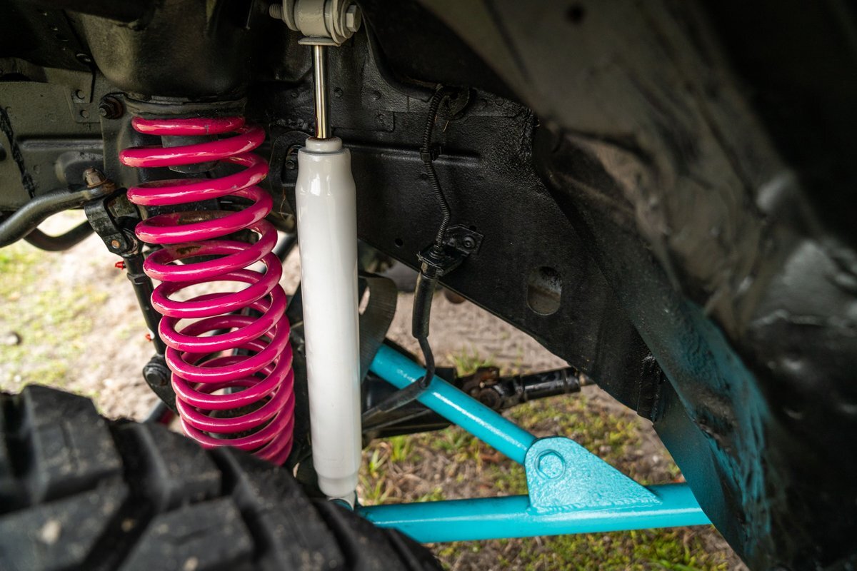 The 5.2-liter V8 was factory rated at 220 horsepower and 300 lb-ft of torque and is equipped with a K&N dual air intake. Power is sent to the rear or all four wheels via a four-speed automatic transmission and an NP242 dual-range transfer case. The truck is also equipped with a Dana 60 front and Dana 80 rear axle with ARB locking differentials and 5.13:1 gearing. Underbody components have been painted teal and pink. The white-finished 17" Fuel Off-Road wheels feature teal accents and are mounted with 37x13.5" Fuel Off-Road Gripper M/T tires. The truck rides on a 5" long-arm suspension lift.