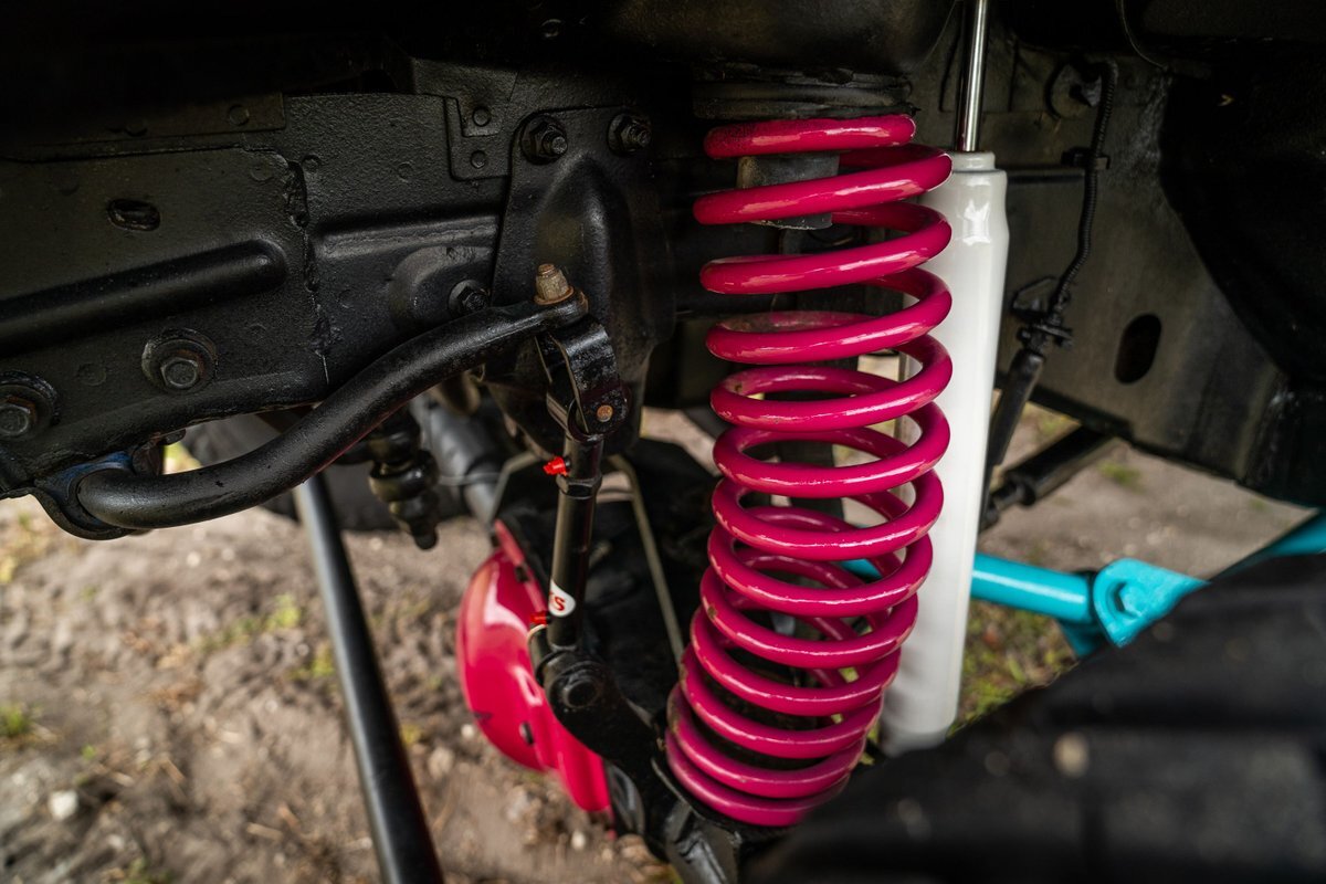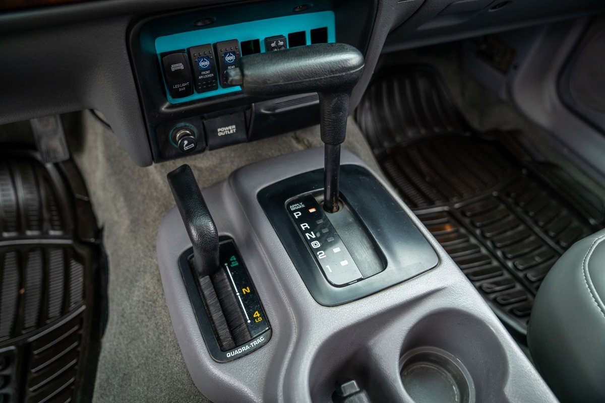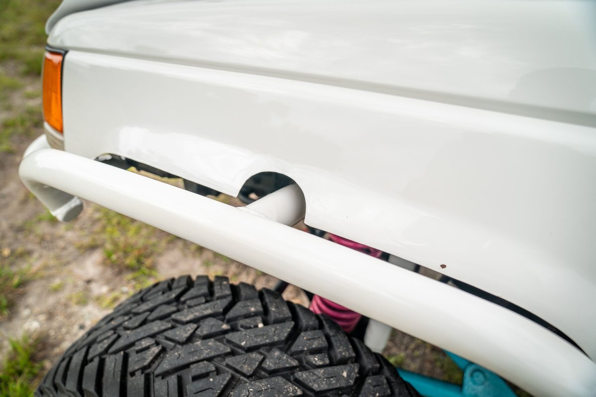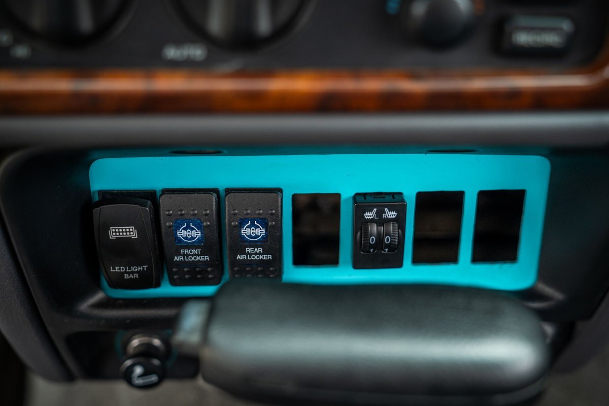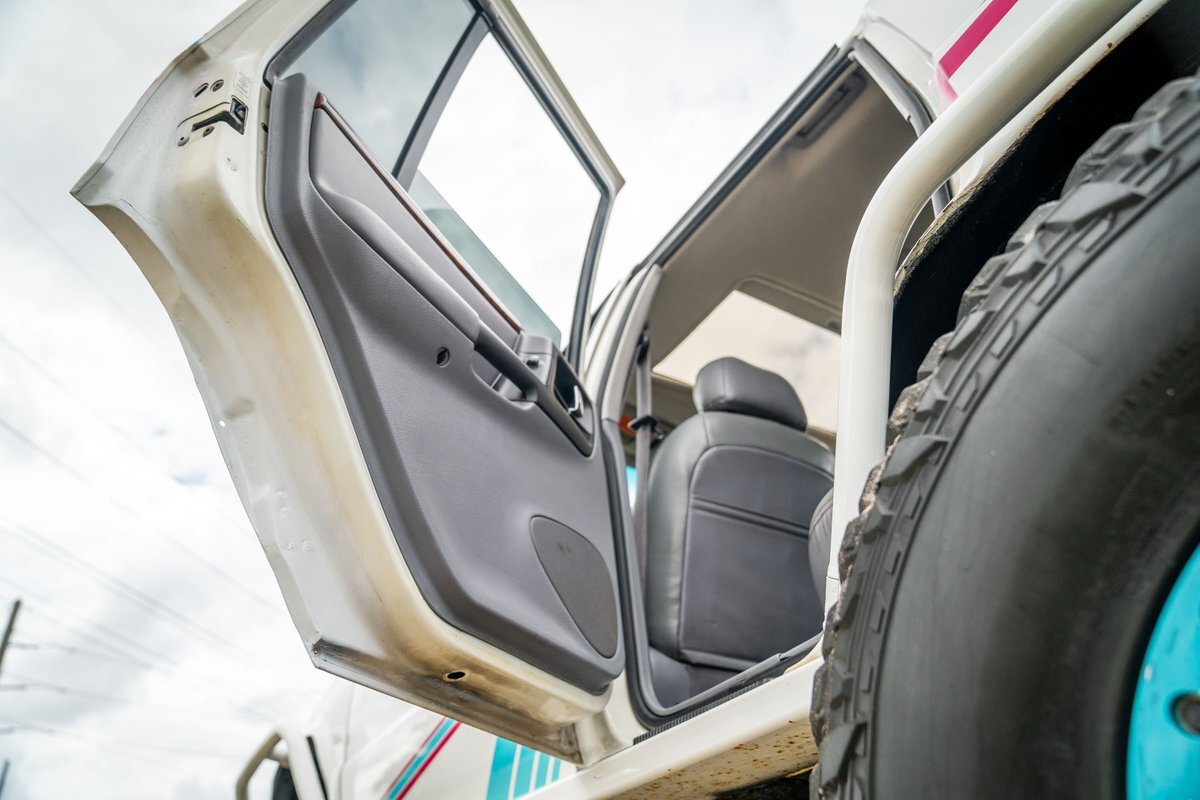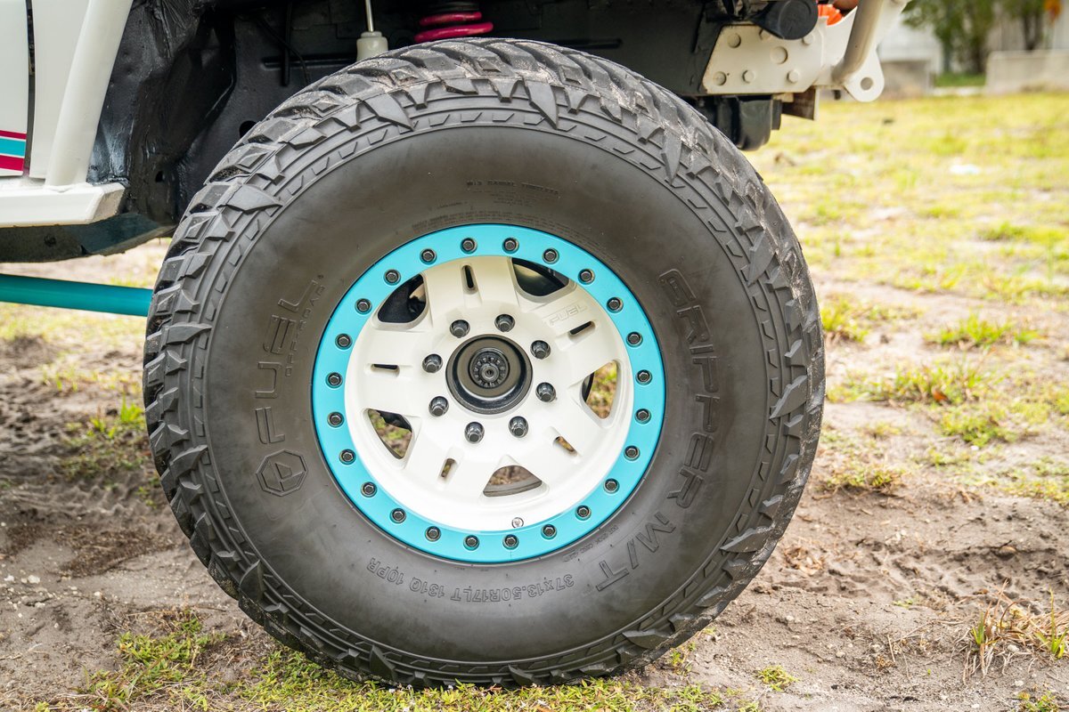 The 5.2-liter V8 was factory rated at 220 horsepower and 300 lb-ft of torque and is equipped with a K&N dual air intake. Power is sent to the rear or all four wheels via a four-speed automatic transmission and an NP242 dual-range transfer case. The truck is also equipped with a Dana 60 front and Dana 80 rear axle with ARB locking differentials and 5.13:1 gearing. Underbody components have been painted teal and pink. The white-finished 17" Fuel Off-Road wheels feature teal accents and are mounted with 37x13.5" Fuel Off-Road Gripper M/T tires. The truck rides on a 5" long-arm suspension lift.