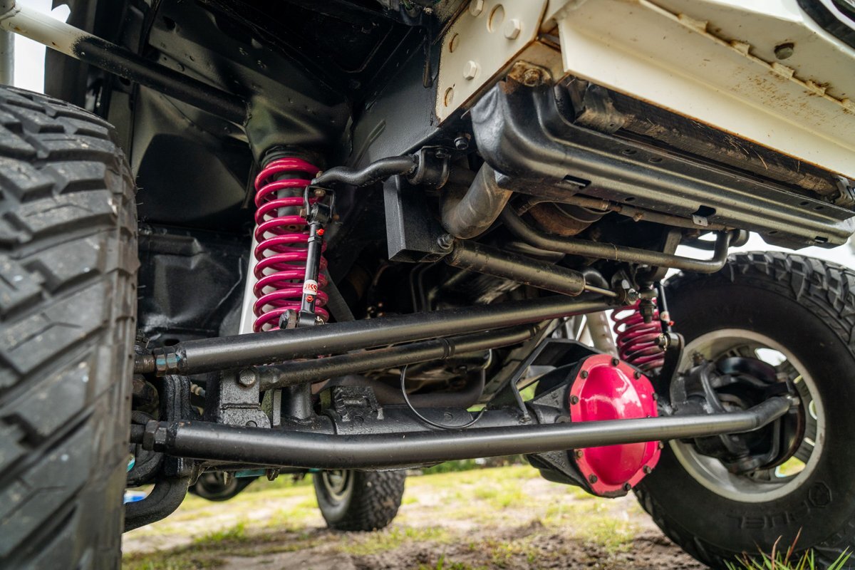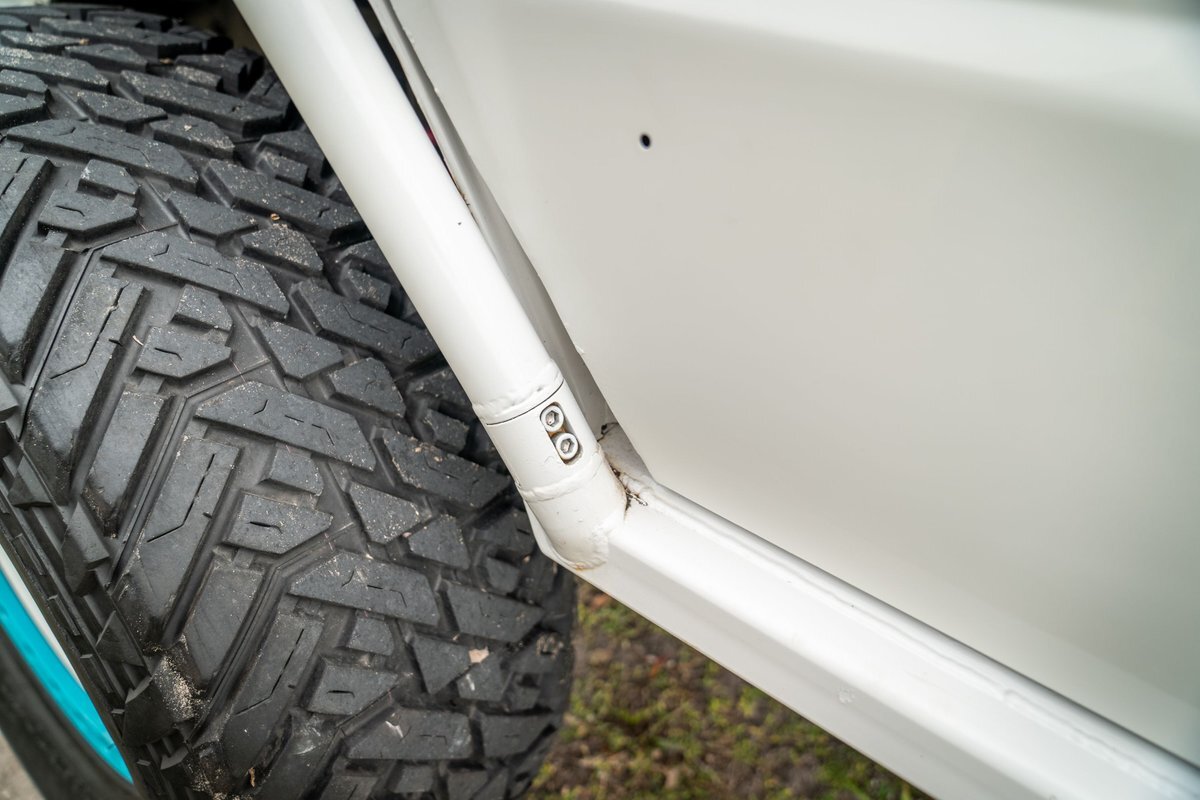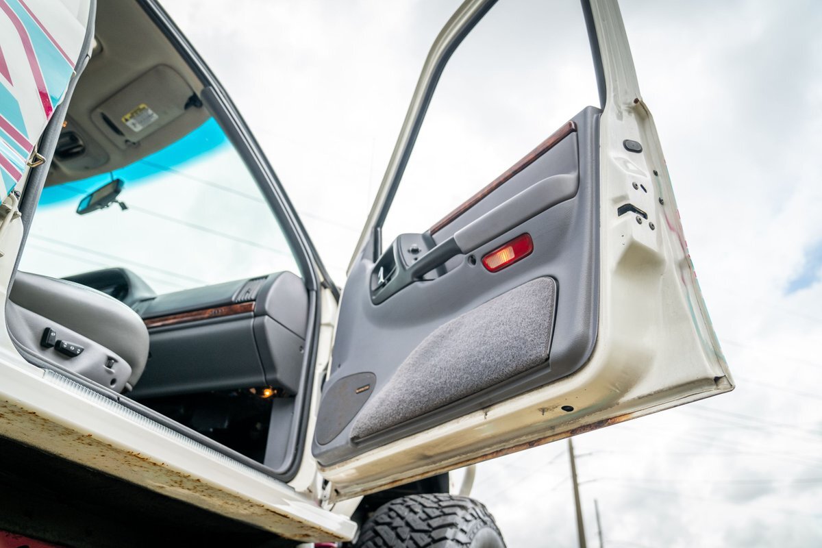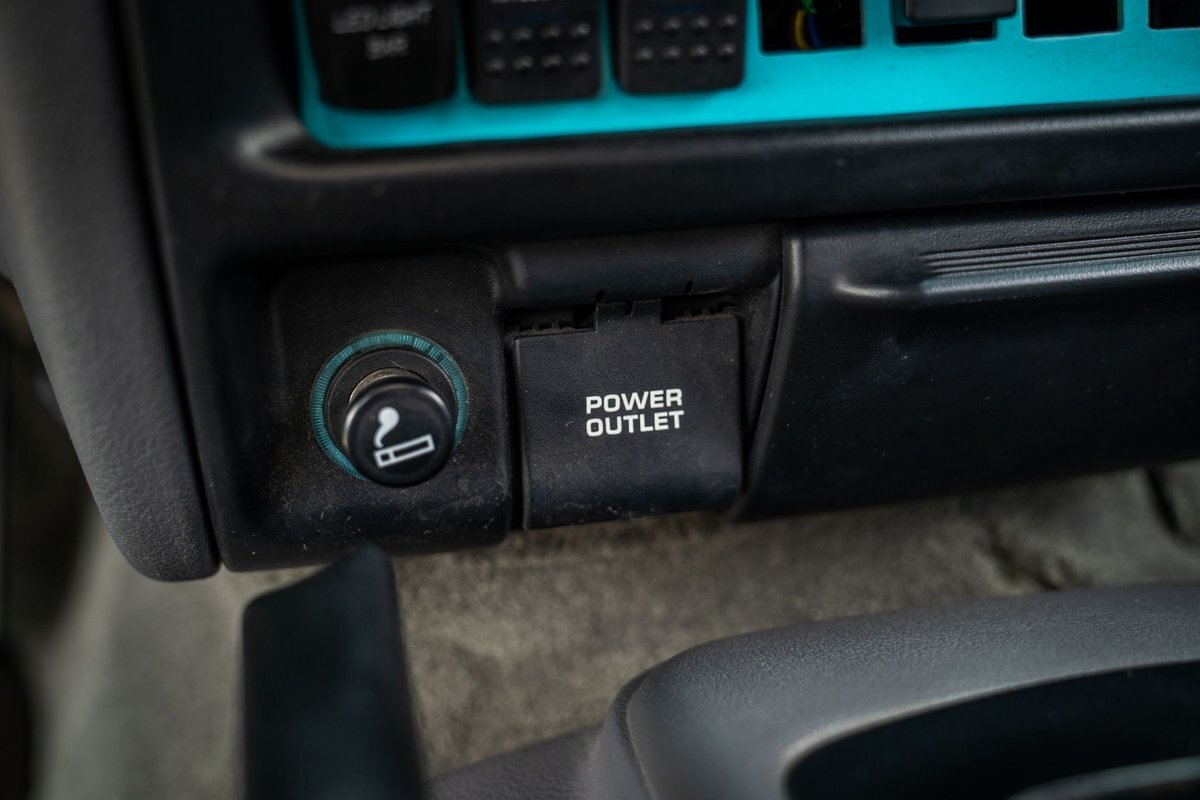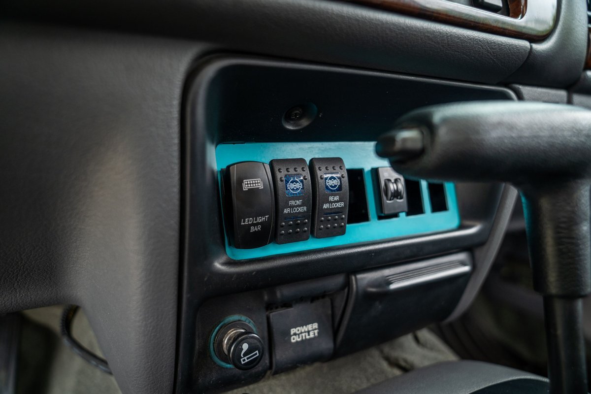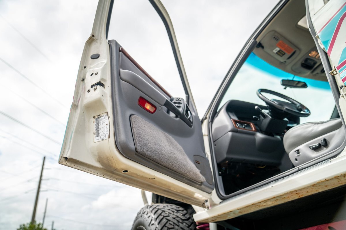 The 5.2-liter V8 was factory rated at 220 horsepower and 300 lb-ft of torque and is equipped with a K&N dual air intake. Power is sent to the rear or all four wheels via a four-speed automatic transmission and an NP242 dual-range transfer case. The truck is also equipped with a Dana 60 front and Dana 80 rear axle with ARB locking differentials and 5.13:1 gearing. Underbody components have been painted teal and pink. The white-finished 17" Fuel Off-Road wheels feature teal accents and are mounted with 37x13.5" Fuel Off-Road Gripper M/T tires. The truck rides on a 5" long-arm suspension lift.