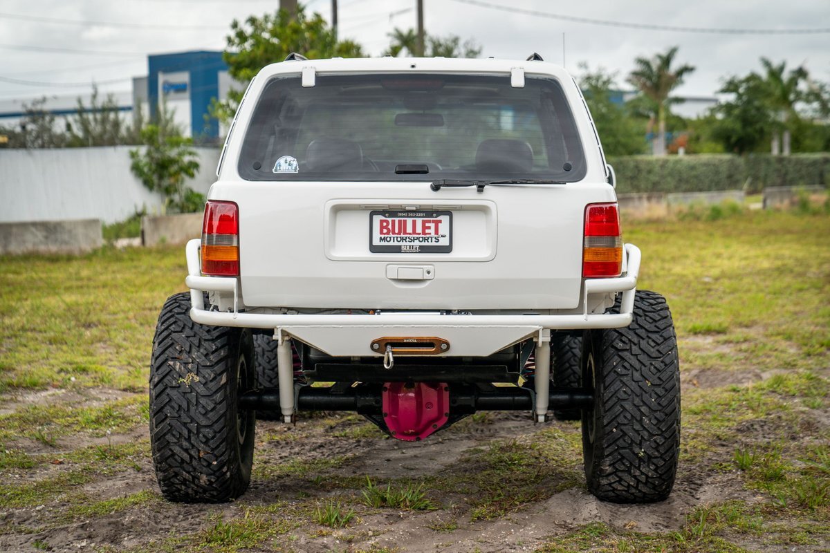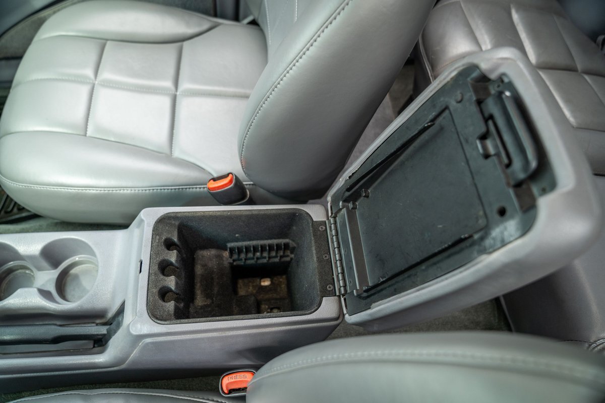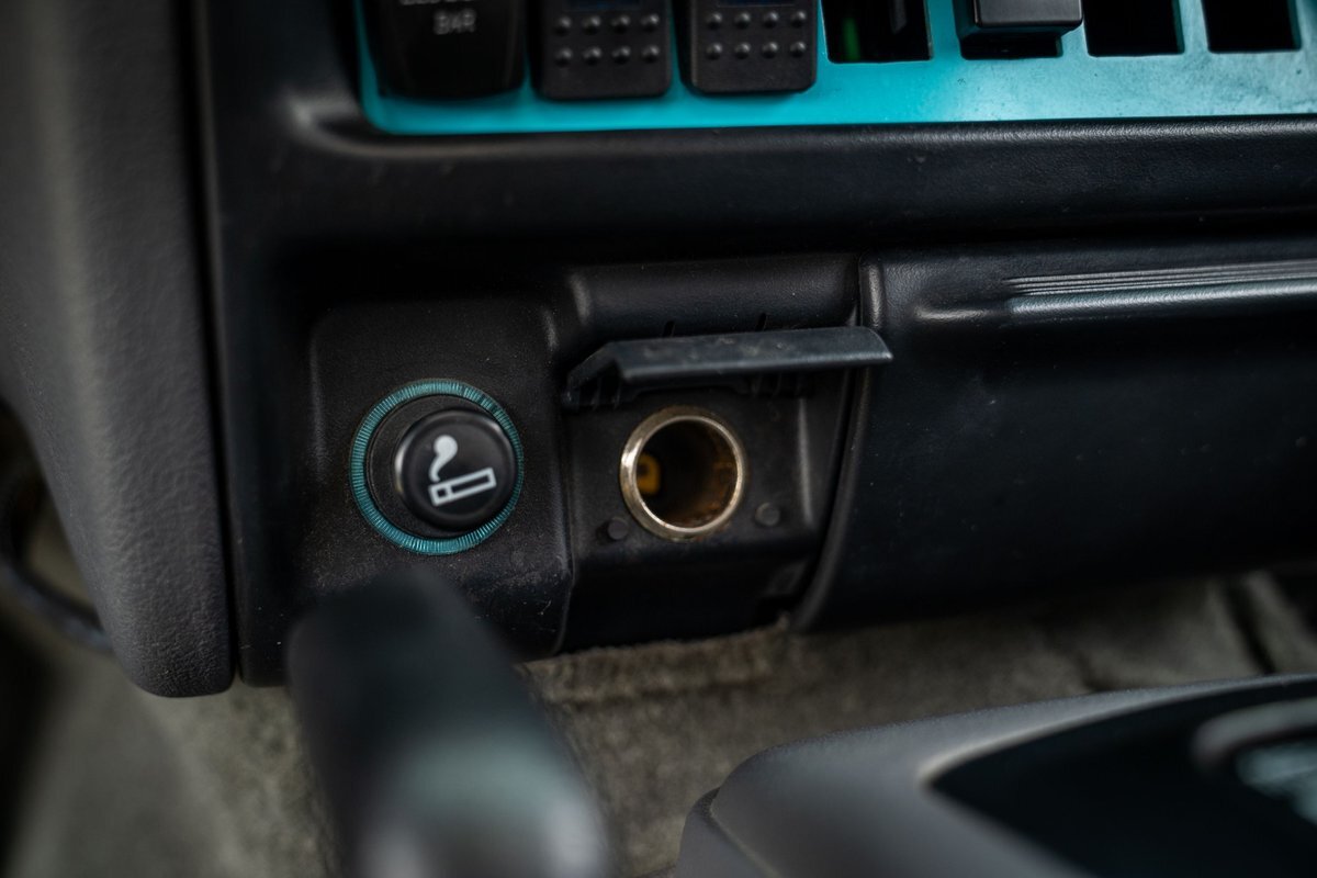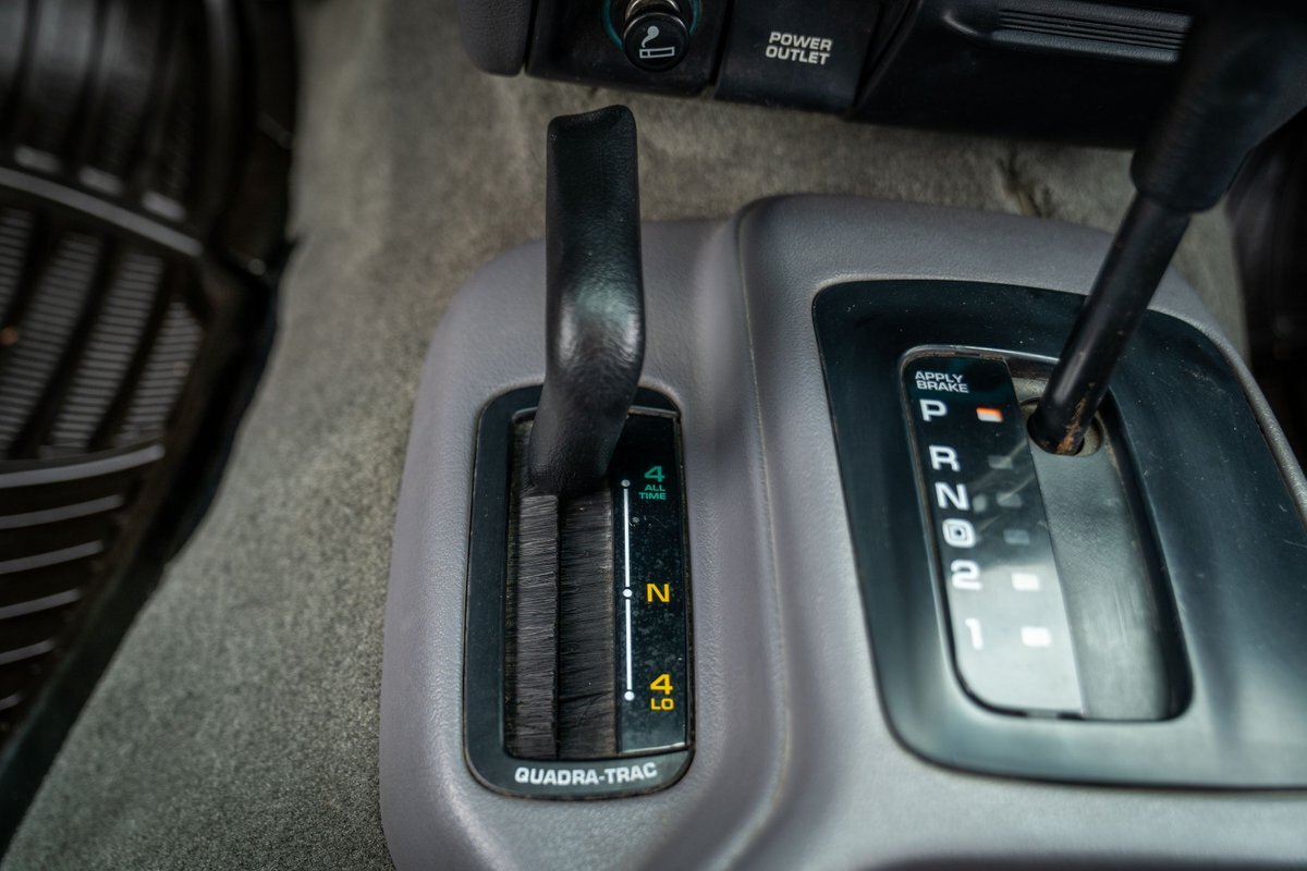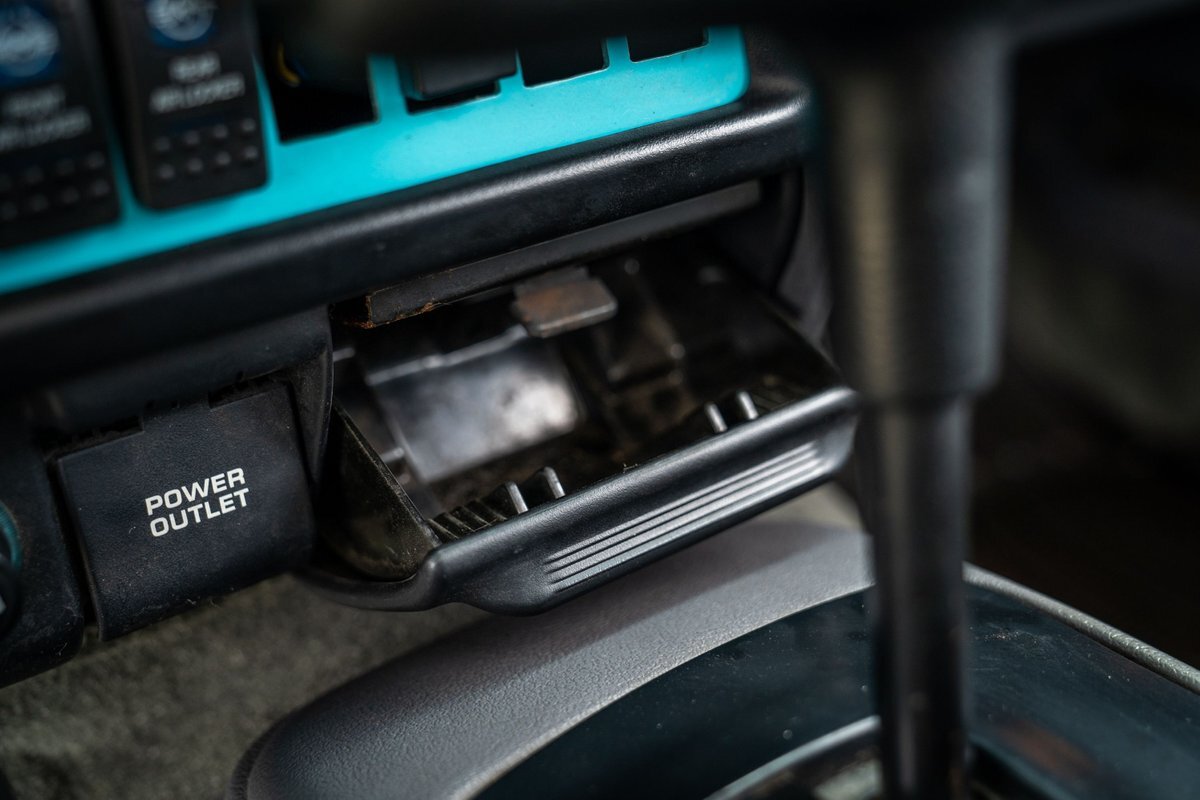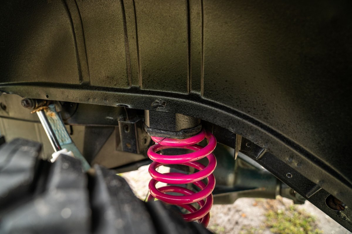 The 5.2-liter V8 was factory rated at 220 horsepower and 300 lb-ft of torque and is equipped with a K&N dual air intake. Power is sent to the rear or all four wheels via a four-speed automatic transmission and an NP242 dual-range transfer case. The truck is also equipped with a Dana 60 front and Dana 80 rear axle with ARB locking differentials and 5.13:1 gearing. Underbody components have been painted teal and pink. The white-finished 17" Fuel Off-Road wheels feature teal accents and are mounted with 37x13.5" Fuel Off-Road Gripper M/T tires. The truck rides on a 5" long-arm suspension lift.