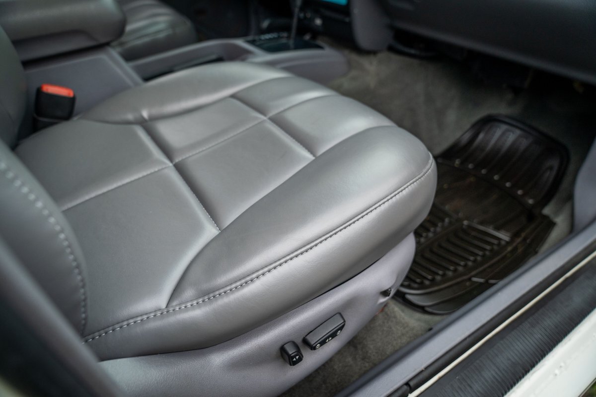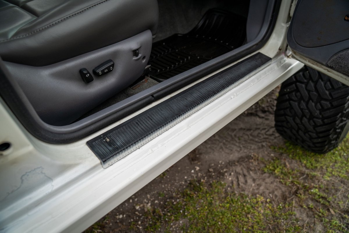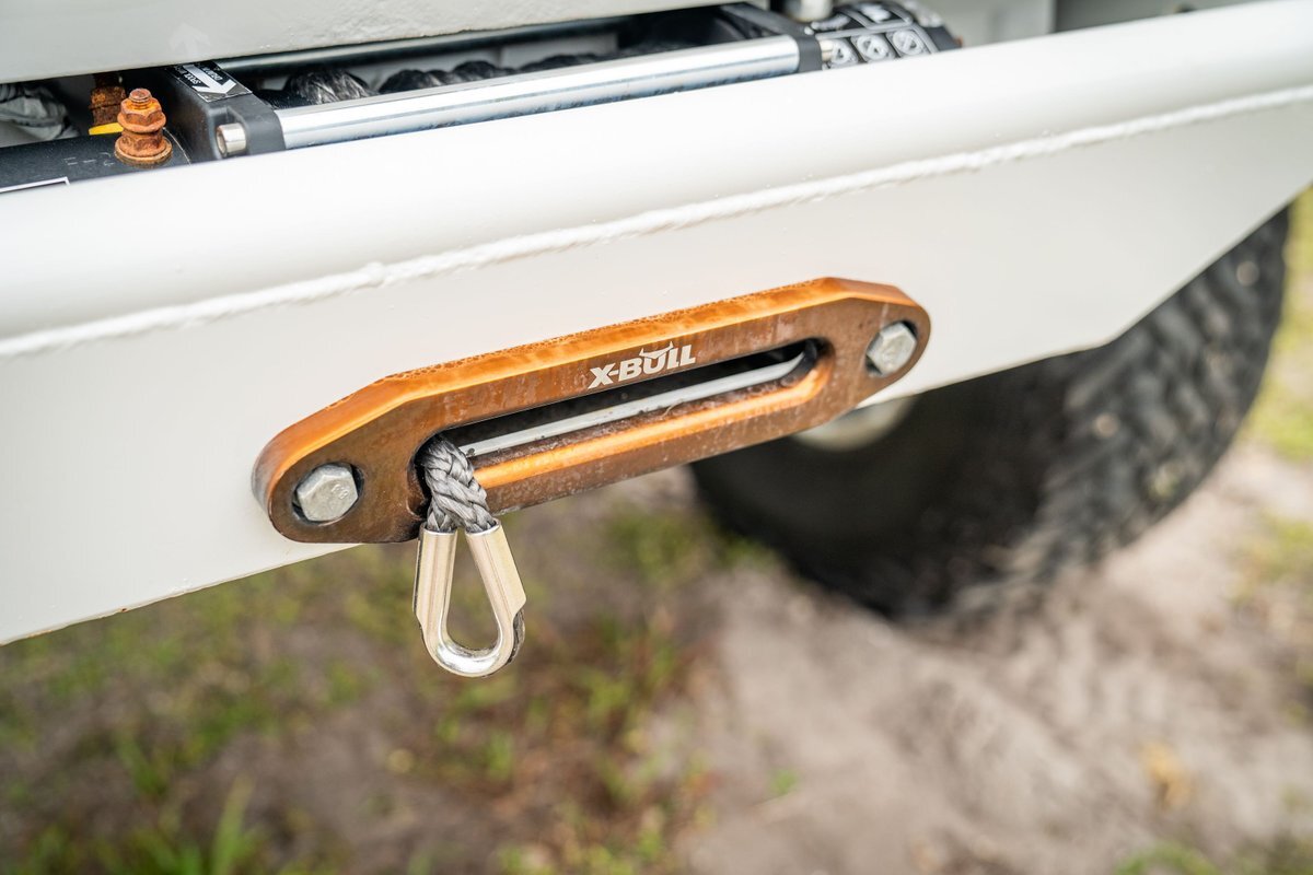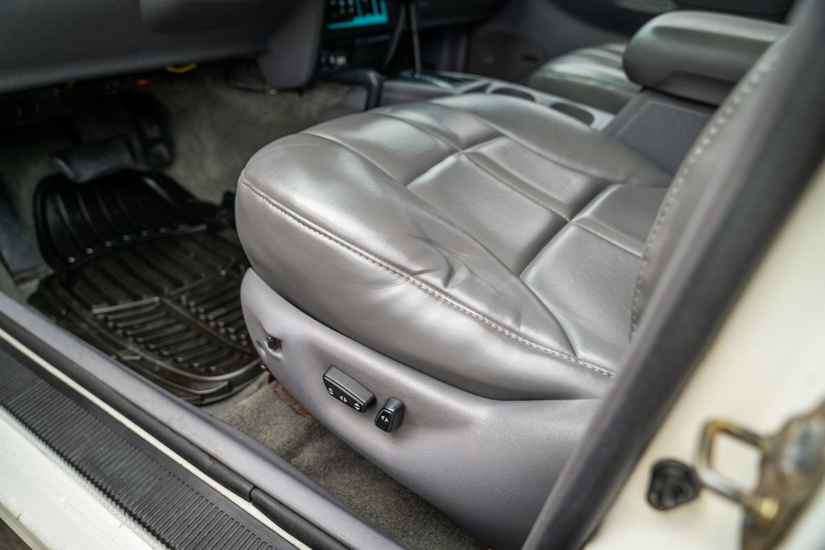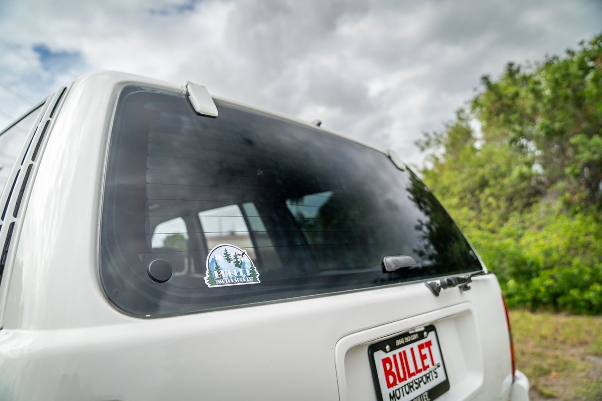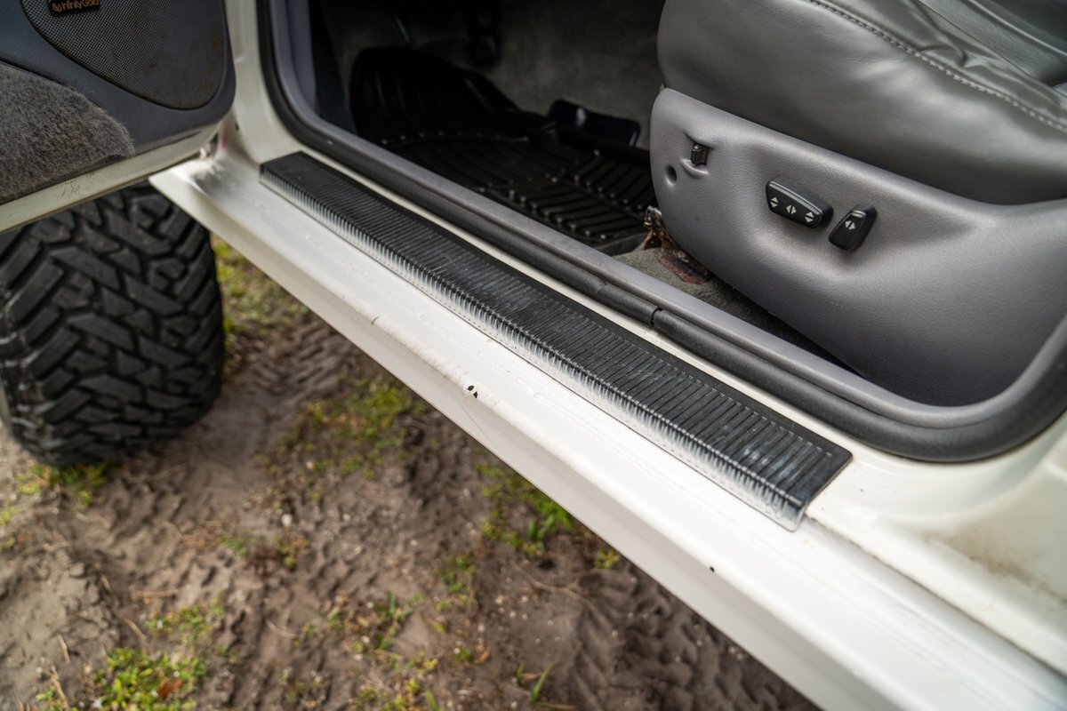 The 5.2-liter V8 was factory rated at 220 horsepower and 300 lb-ft of torque and is equipped with a K&N dual air intake. Power is sent to the rear or all four wheels via a four-speed automatic transmission and an NP242 dual-range transfer case. The truck is also equipped with a Dana 60 front and Dana 80 rear axle with ARB locking differentials and 5.13:1 gearing. Underbody components have been painted teal and pink. The white-finished 17" Fuel Off-Road wheels feature teal accents and are mounted with 37x13.5" Fuel Off-Road Gripper M/T tires. The truck rides on a 5" long-arm suspension lift.