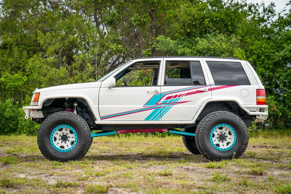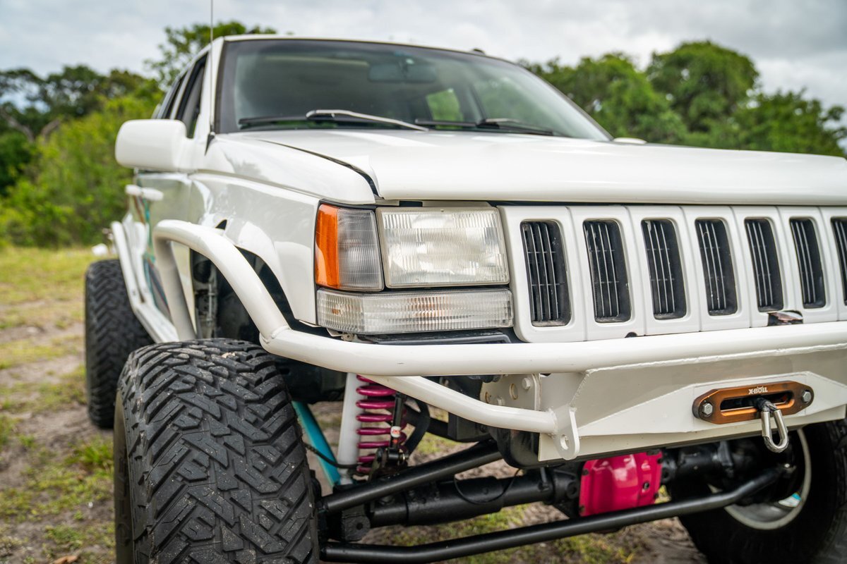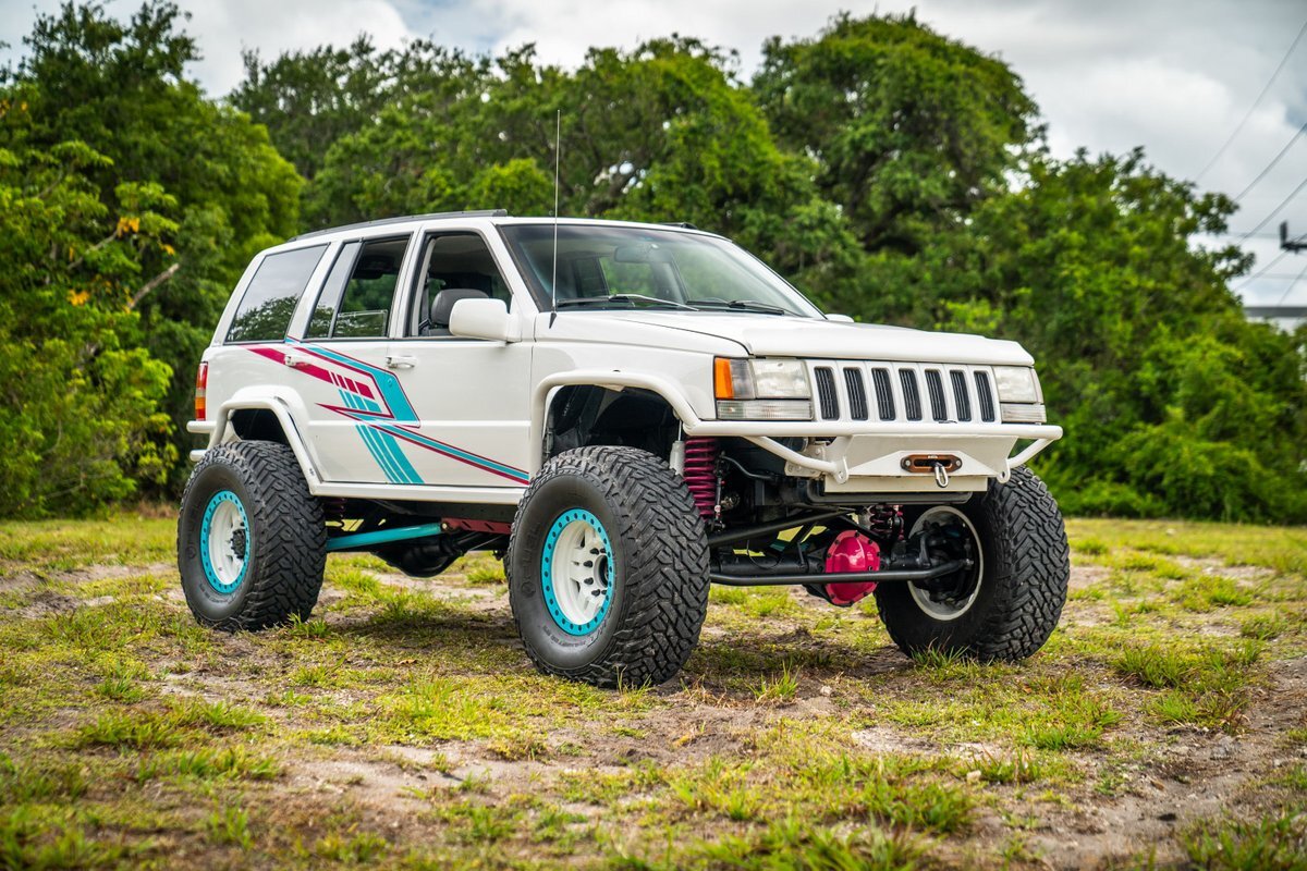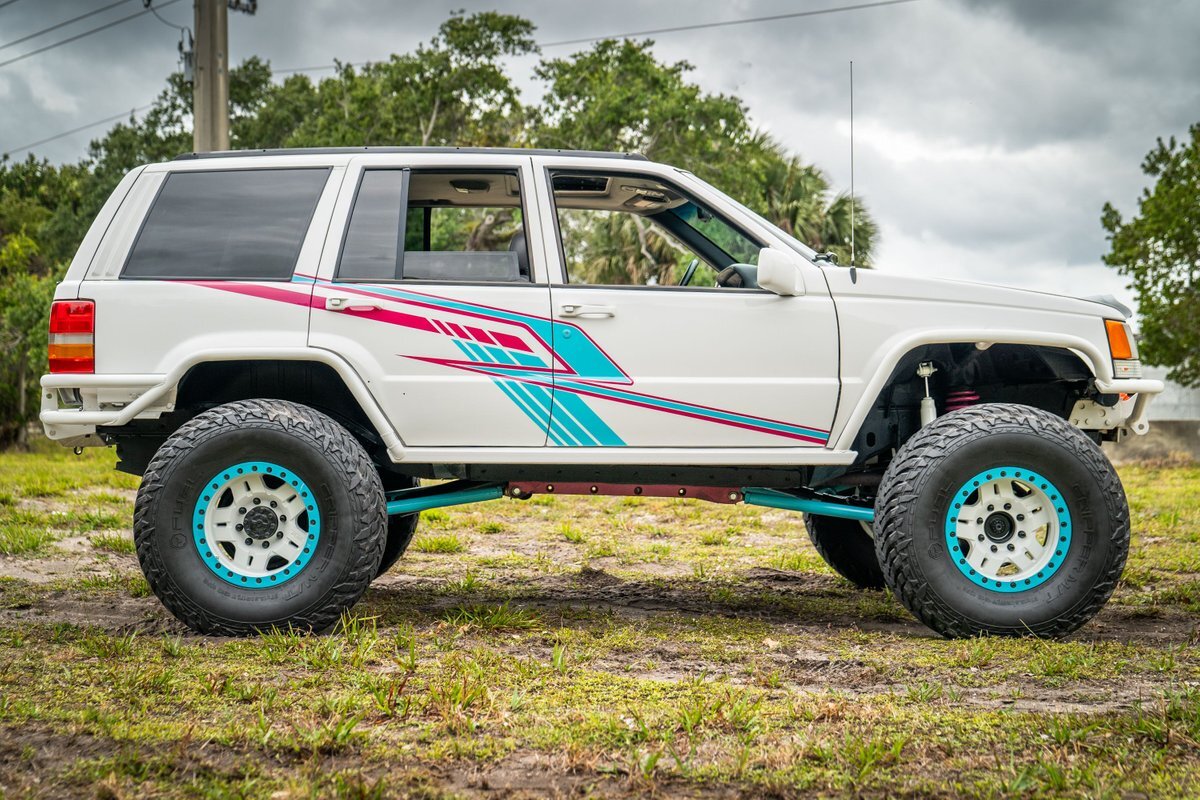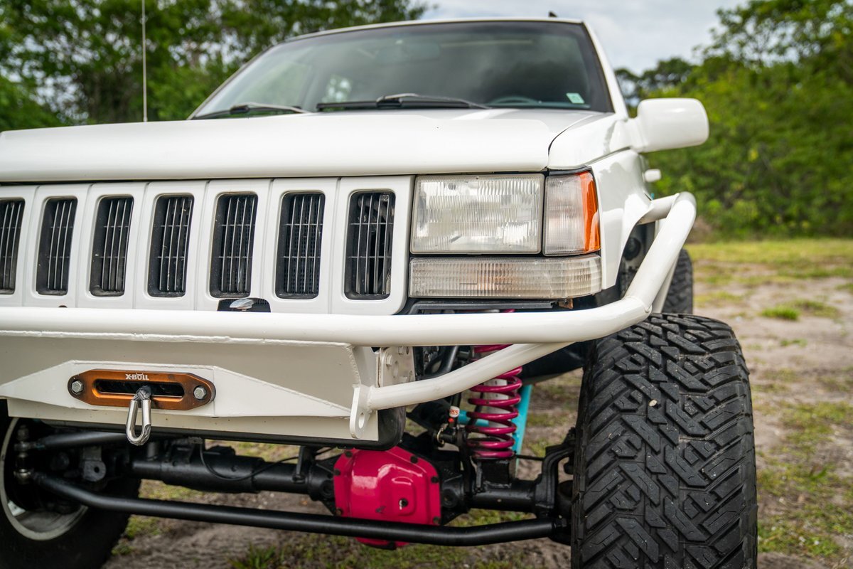 This 1997 Jeep Grand Cherokee is a Canadian-market example that was modified for off-road use under prior ownership with the installation of an NP242 dual-range transfer case, a Dana 60 front and Dana 80 rear axle, ARB front and rear locking differentials, a 5" suspension lift, 17" Fuel Off-Road wheels, and 37" mud-terrain tires. The truck is powered by a 5.2-liter V8, and it is finished in white with teal and pink side graphics. Additional equipment includes tubular bumpers, front and rear winches, air conditioning, a sunroof, an aftermarket touchscreen head unit, and heated power-adjustable front seats. This Grand Cherokee has 361k kilometers (~224k miles) and is offered with a clean Carfax report and a clean title.