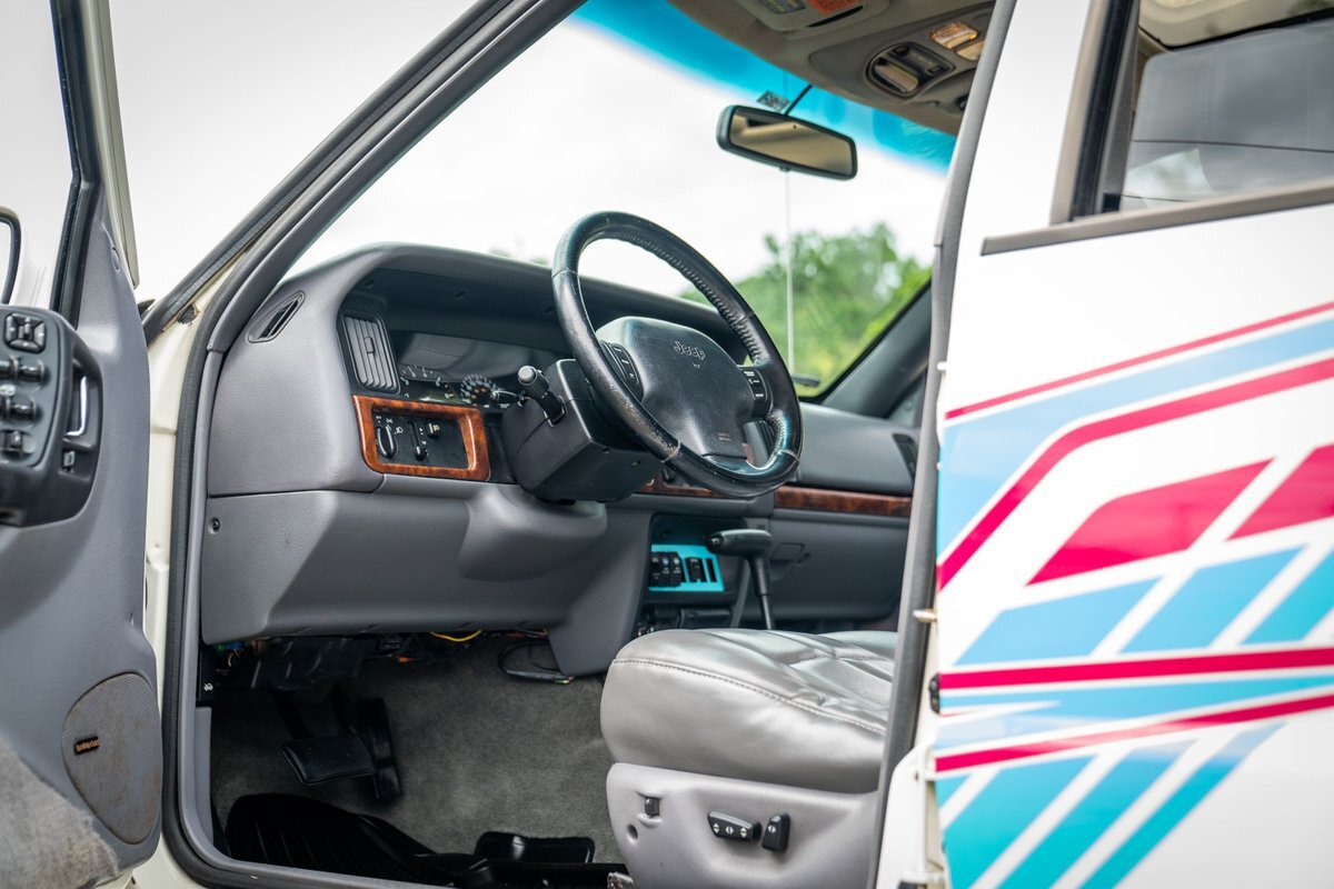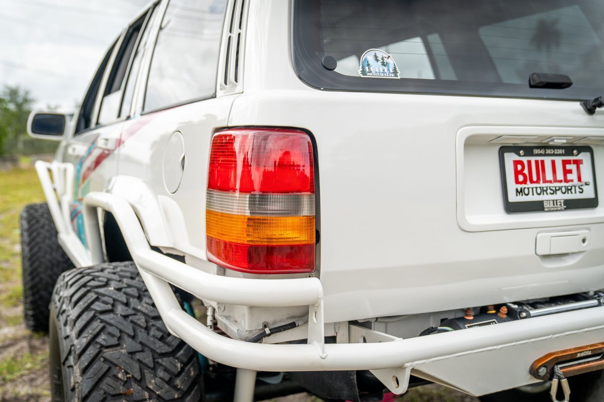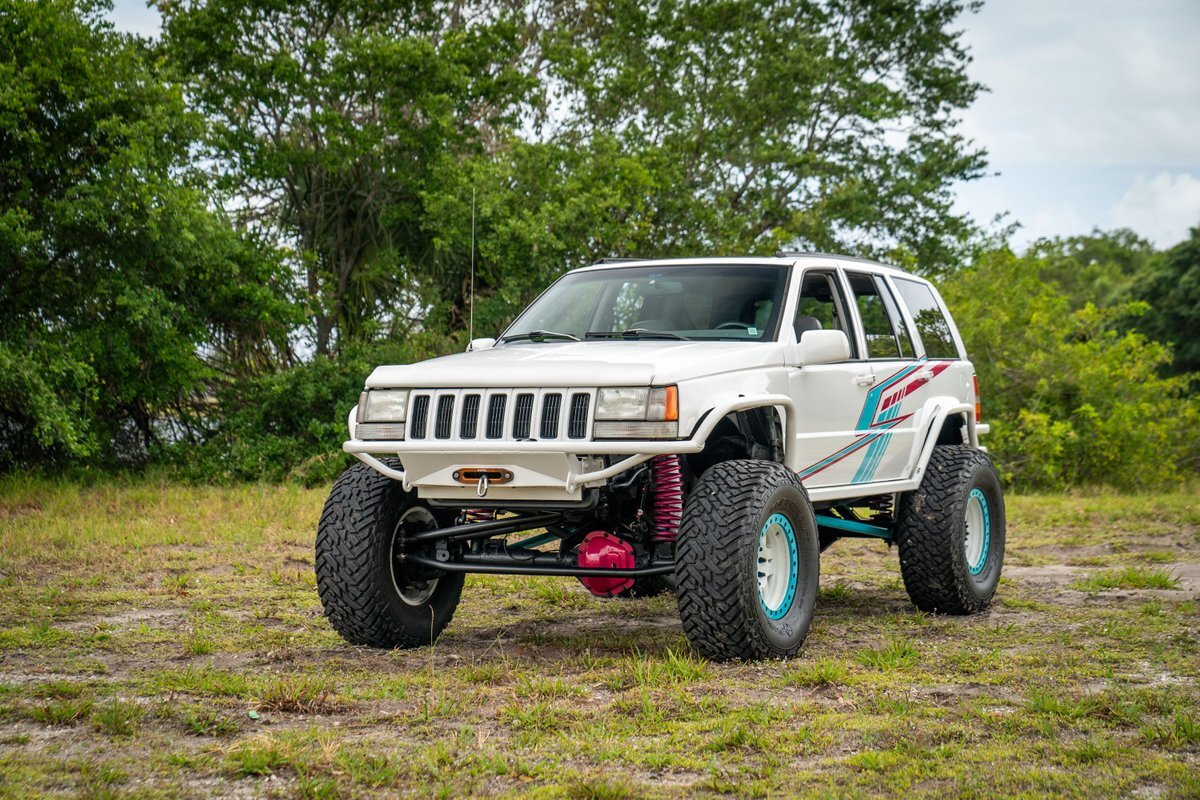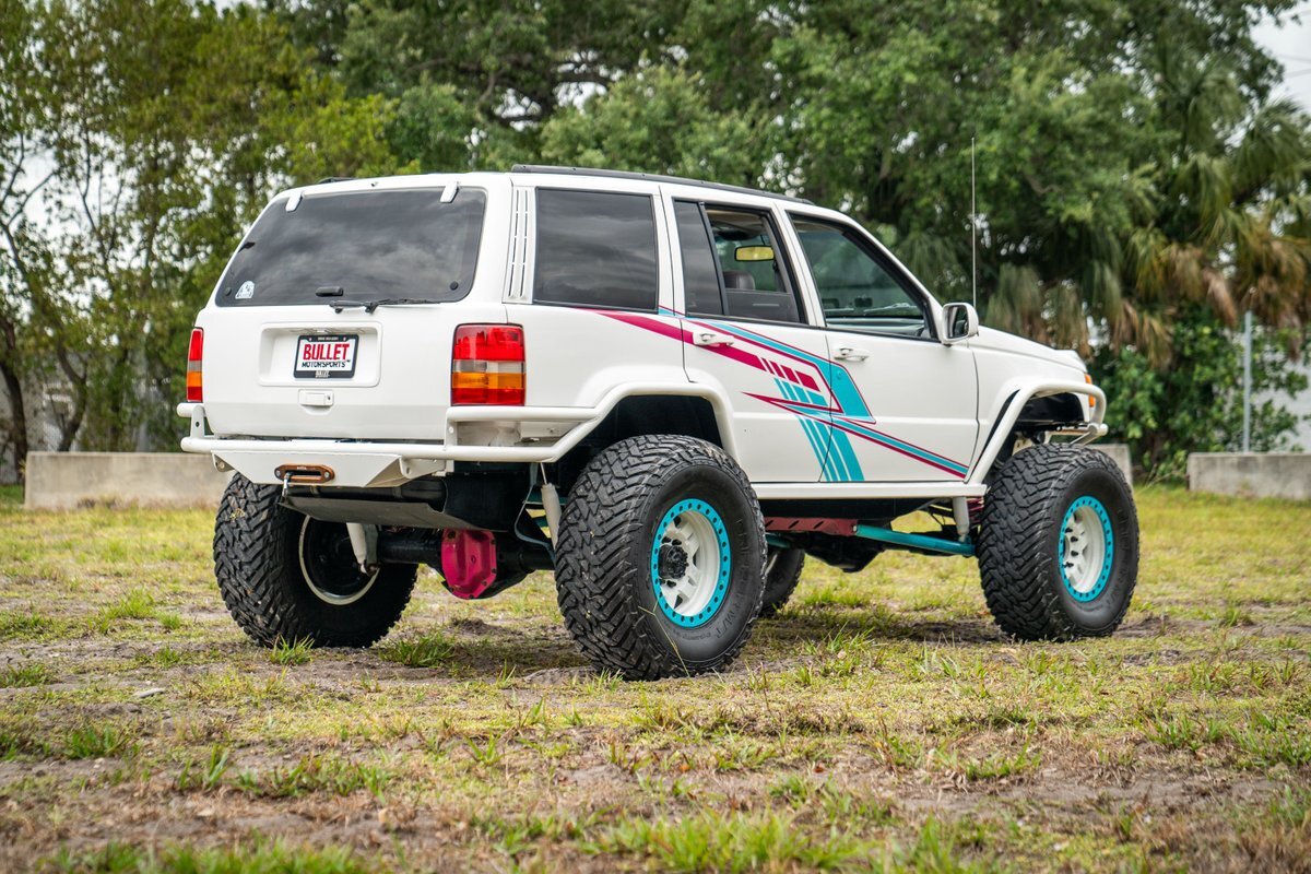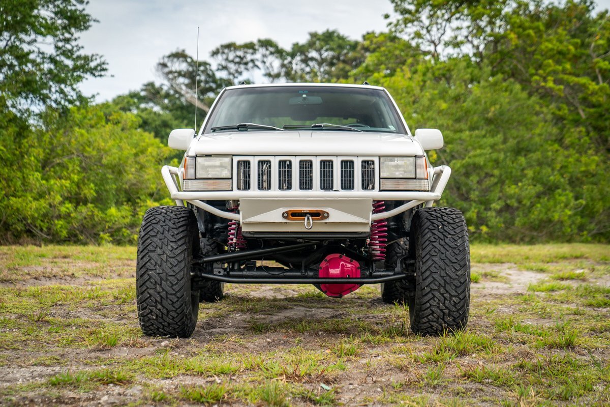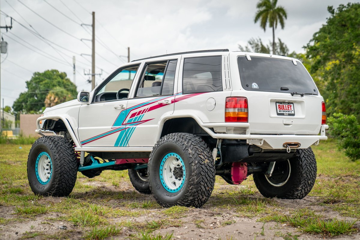 This 1997 Jeep Grand Cherokee is a Canadian-market example that was modified for off-road use under prior ownership with the installation of an NP242 dual-range transfer case, a Dana 60 front and Dana 80 rear axle, ARB front and rear locking differentials, a 5" suspension lift, 17" Fuel Off-Road wheels, and 37" mud-terrain tires. The truck is powered by a 5.2-liter V8, and it is finished in white with teal and pink side graphics. Additional equipment includes tubular bumpers, front and rear winches, air conditioning, a sunroof, an aftermarket touchscreen head unit, and heated power-adjustable front seats. This Grand Cherokee has 361k kilometers (~224k miles) and is offered with a clean Carfax report and a clean title.