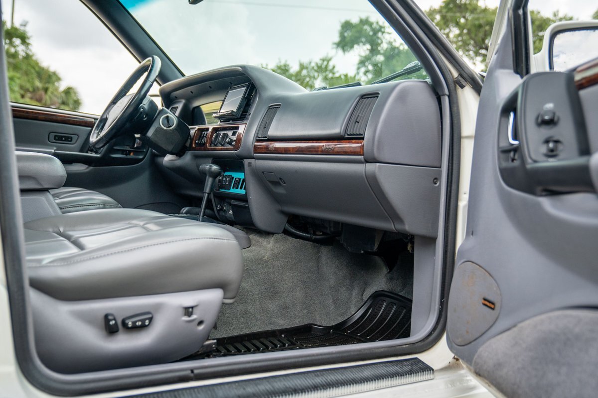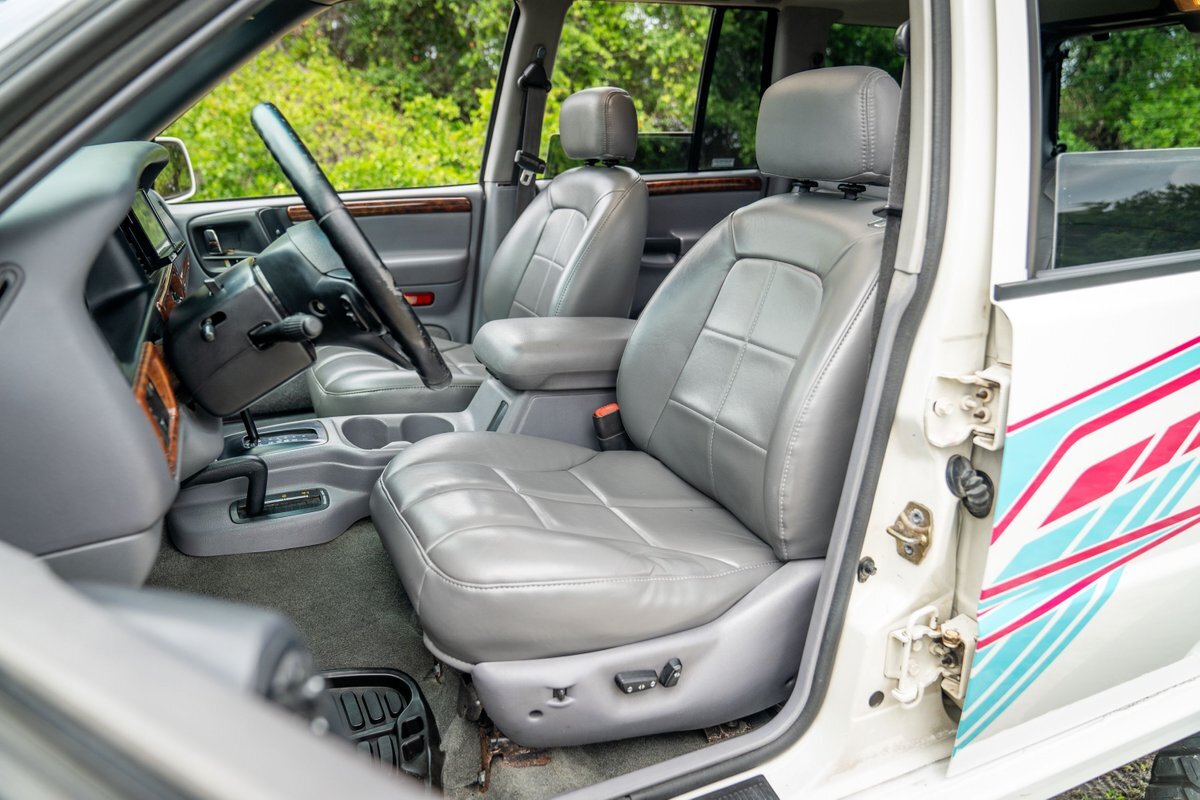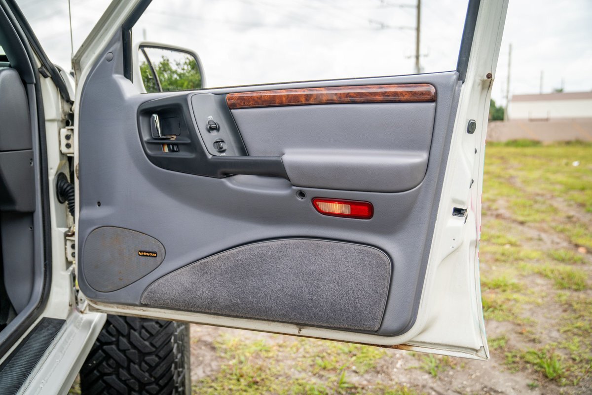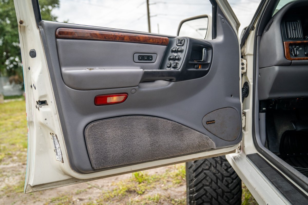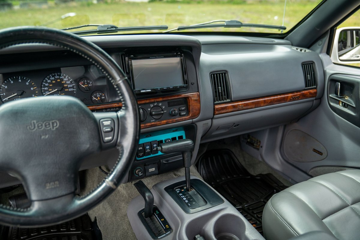 This 1997 Jeep Grand Cherokee is a Canadian-market example that was modified for off-road use under prior ownership with the installation of an NP242 dual-range transfer case, a Dana 60 front and Dana 80 rear axle, ARB front and rear locking differentials, a 5" suspension lift, 17" Fuel Off-Road wheels, and 37" mud-terrain tires. The truck is powered by a 5.2-liter V8, and it is finished in white with teal and pink side graphics. Additional equipment includes tubular bumpers, front and rear winches, air conditioning, a sunroof, an aftermarket touchscreen head unit, and heated power-adjustable front seats. This Grand Cherokee has 361k kilometers (~224k miles) and is offered with a clean Carfax report and a clean title.