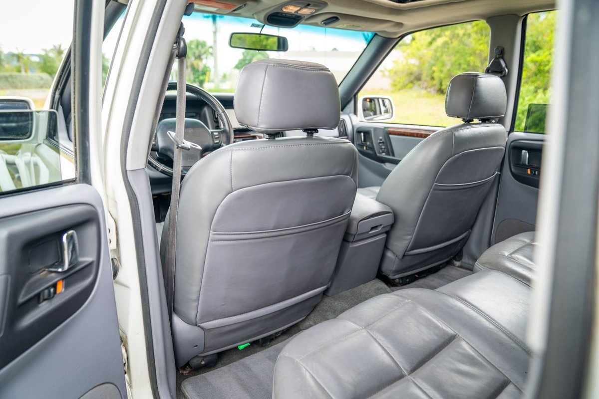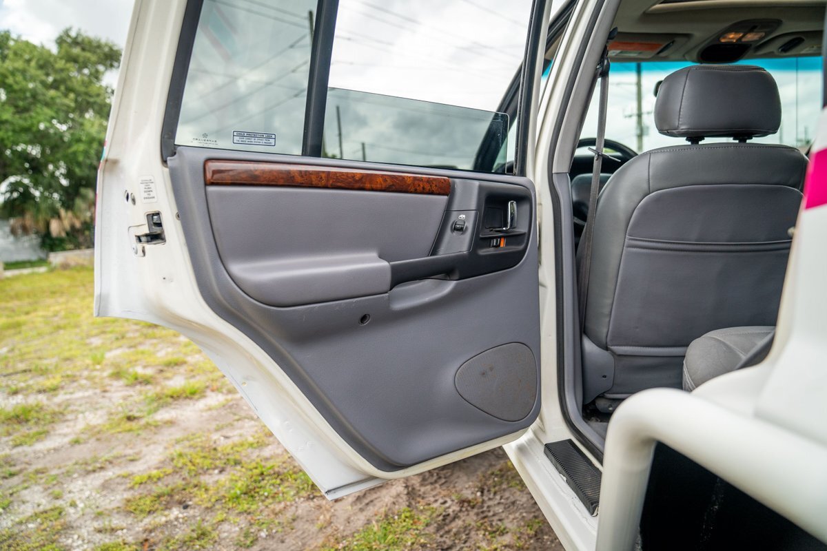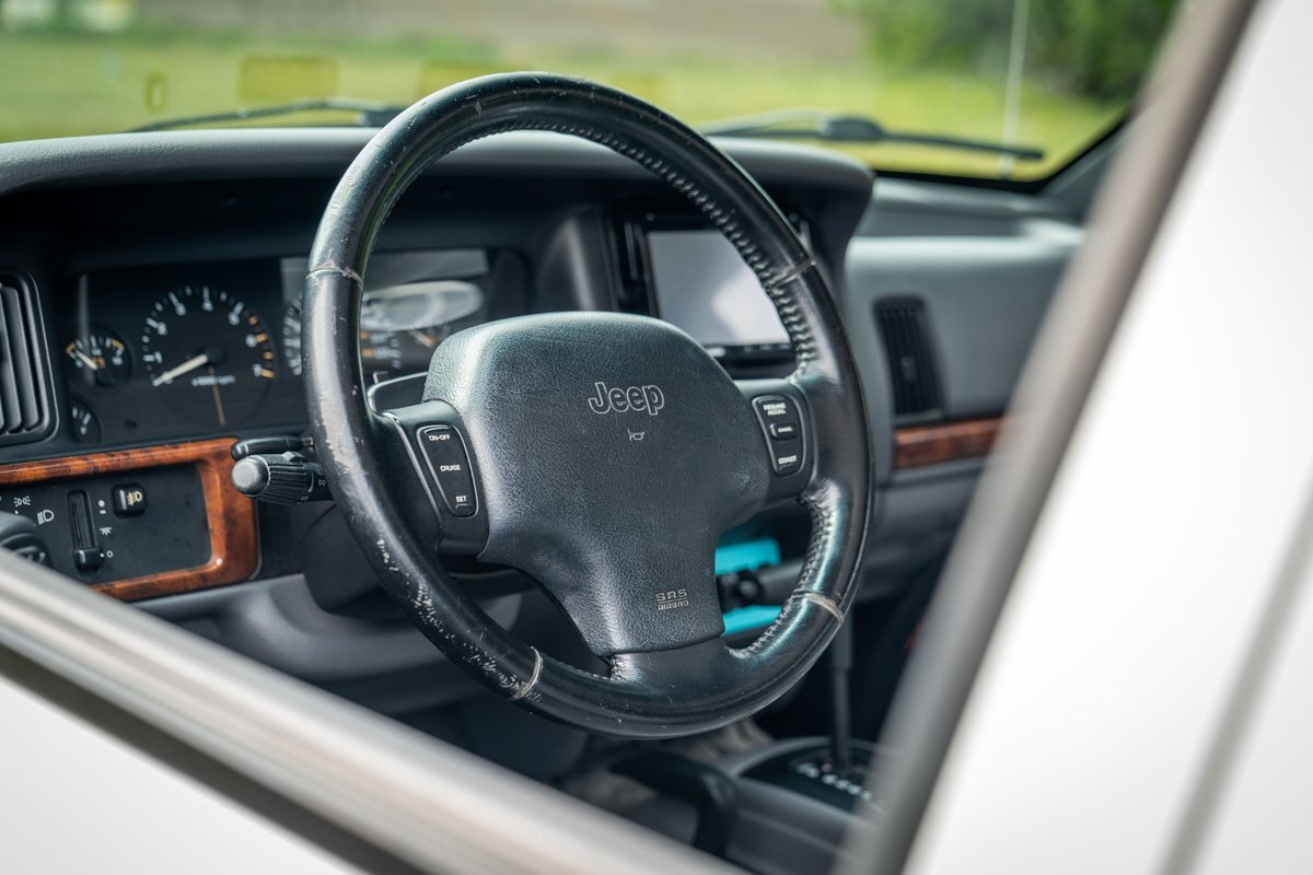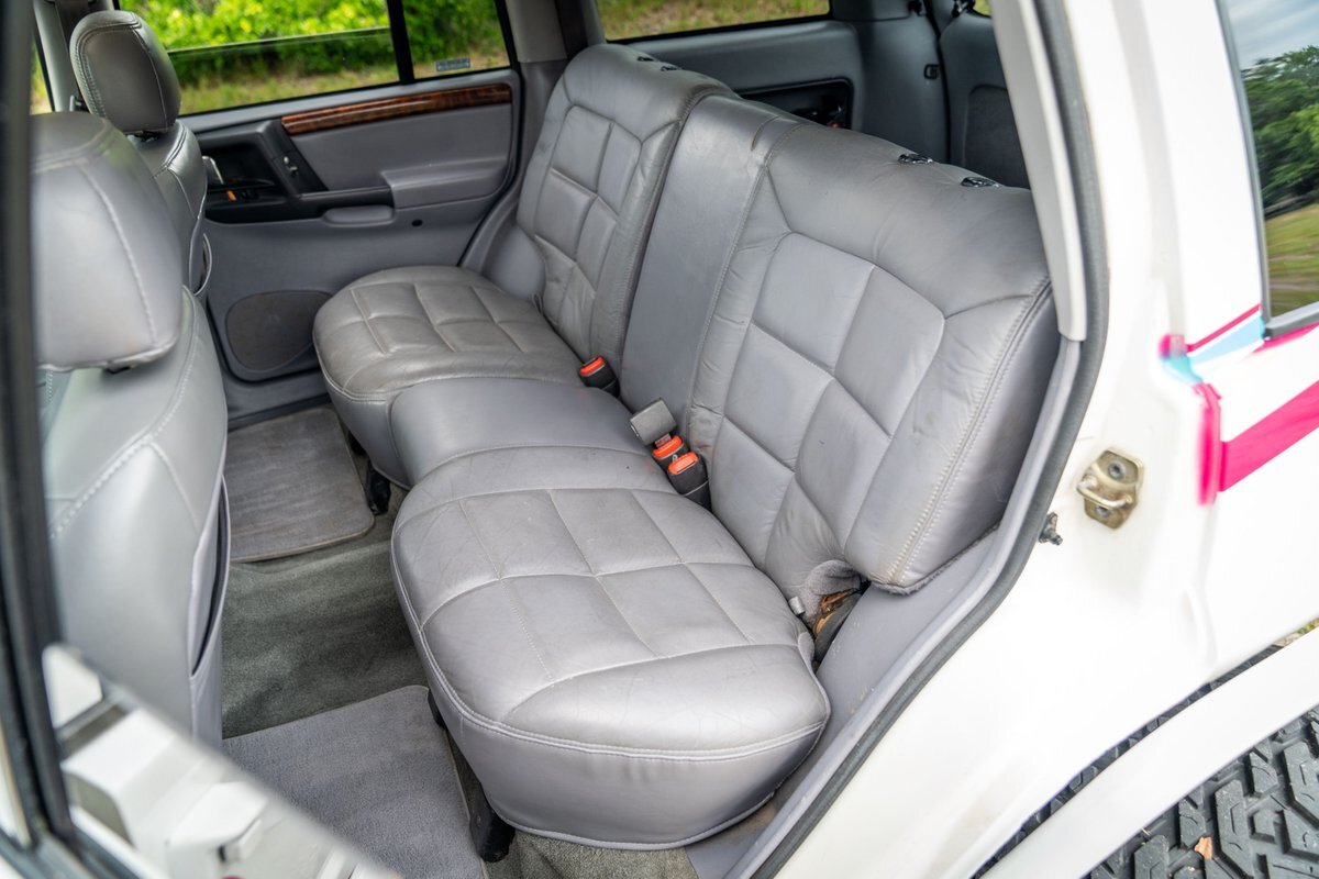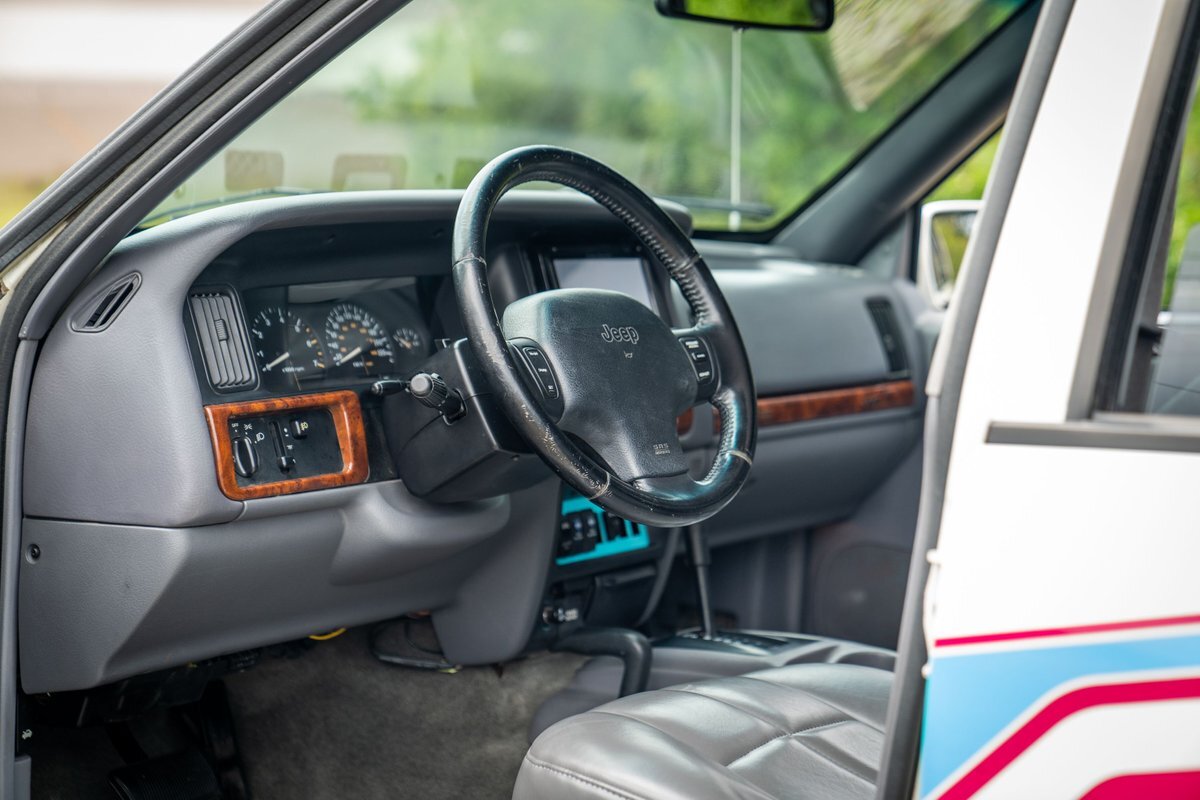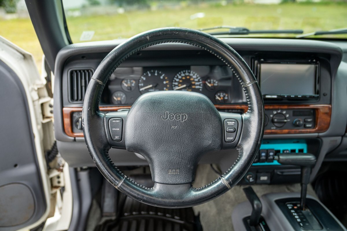 This 1997 Jeep Grand Cherokee is a Canadian-market example that was modified for off-road use under prior ownership with the installation of an NP242 dual-range transfer case, a Dana 60 front and Dana 80 rear axle, ARB front and rear locking differentials, a 5" suspension lift, 17" Fuel Off-Road wheels, and 37" mud-terrain tires. The truck is powered by a 5.2-liter V8, and it is finished in white with teal and pink side graphics. Additional equipment includes tubular bumpers, front and rear winches, air conditioning, a sunroof, an aftermarket touchscreen head unit, and heated power-adjustable front seats. This Grand Cherokee has 361k kilometers (~224k miles) and is offered with a clean Carfax report and a clean title.