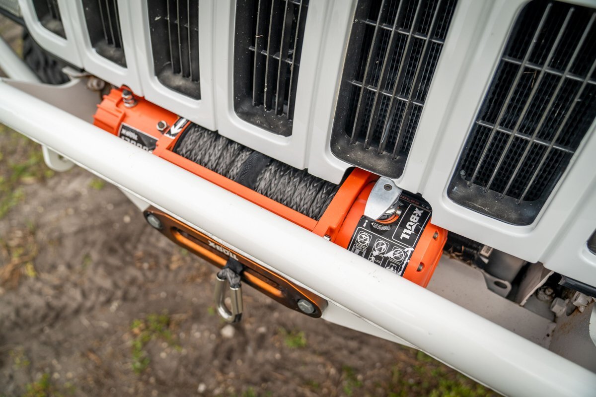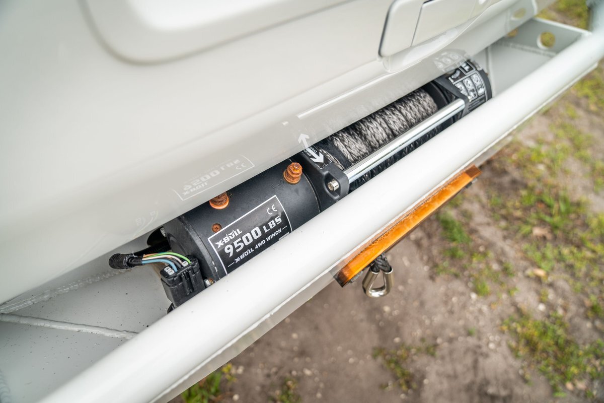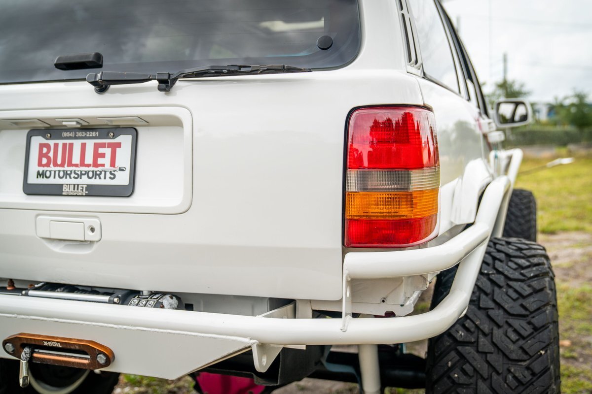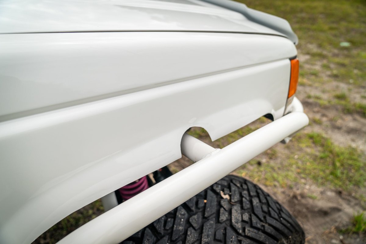 The truck has been repainted white with teal and pink side graphics. Features include trimmed front fenders, tubular bumpers, rock sliders, a sunroof, and front and rear winches