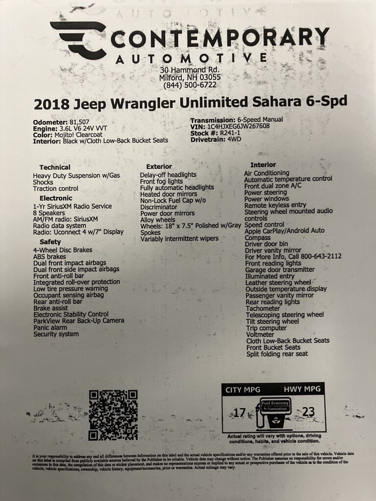 Quick Order Package 23G, 1-Yr SiriusXM Radio Service, 3.45 Rear Axle Ratio, 4-Wheel Disc Brakes, 8 Speakers, ABS brakes, Air Conditioning, Alloy wheels, AM/FM radio: SiriusXM, Apple CarPlay/Android Auto, Automatic temperature control, Brake assist, Cloth Low-Back Bucket Seats, Compass, Delay-off headlights, Driver door bin, Driver vanity mirror, Dual front impact airbags, Dual front side impact airbags, Electronic Stability Control, For More Info, Call866-323-0267, Front anti-roll bar, Front Bucket Seats, Front Center Armrest w/Storage, Front dual zone A/C, Front fog lights, Front reading lights, Fully automatic headlights, Garage door transmitter, Heated door mirrors, Heavy Duty Suspension w/Gas Shocks, Illuminated entry, Integrated roll-over protection, Leather steering wheel, Low tire pressure warning, Non-Lock Fuel Cap w/o Discriminator, Occupant sensing airbag, Outside temperature display, Panic alarm, ParkView Rear Back-Up Camera, Passenger door bin, Passenger vanity mirror, Power door mirrors, Power steering, Power windows, Radio data system, Radio: Uconnect 4 w/7 Display, Rear anti-roll bar, Rear reading lights, Remote keyless entry, Security system, Speed control, Split folding rear seat, Steering wheel mounted audio controls, Tachometer, Telescoping steering wheel, Tilt steering wheel, Traction control, Trip computer, Variably intermittent wipers, Voltmeter, and Wheels: 18 x 7.5 Polished w/Gray Spokes.