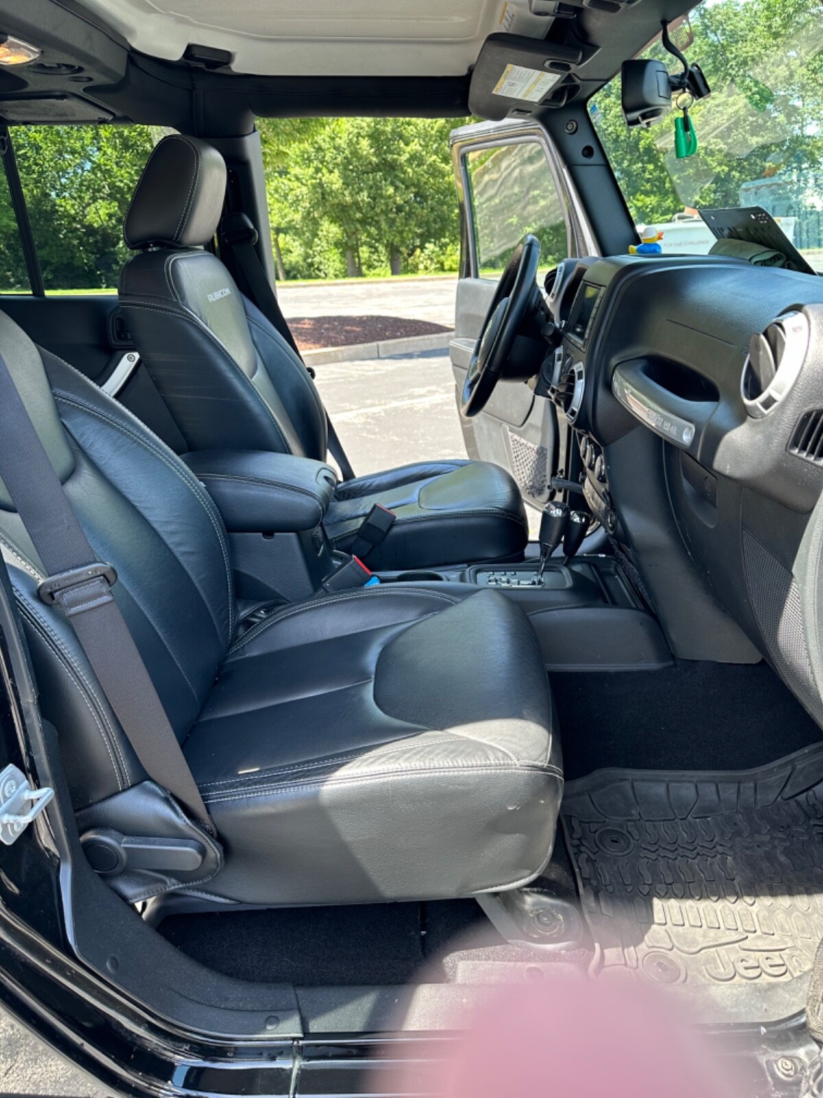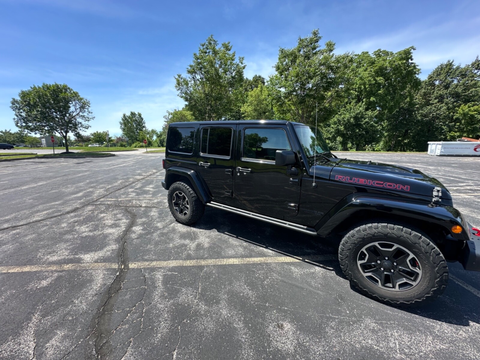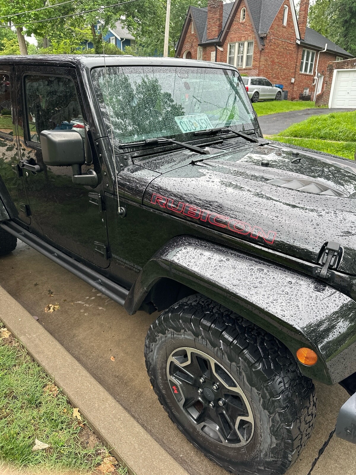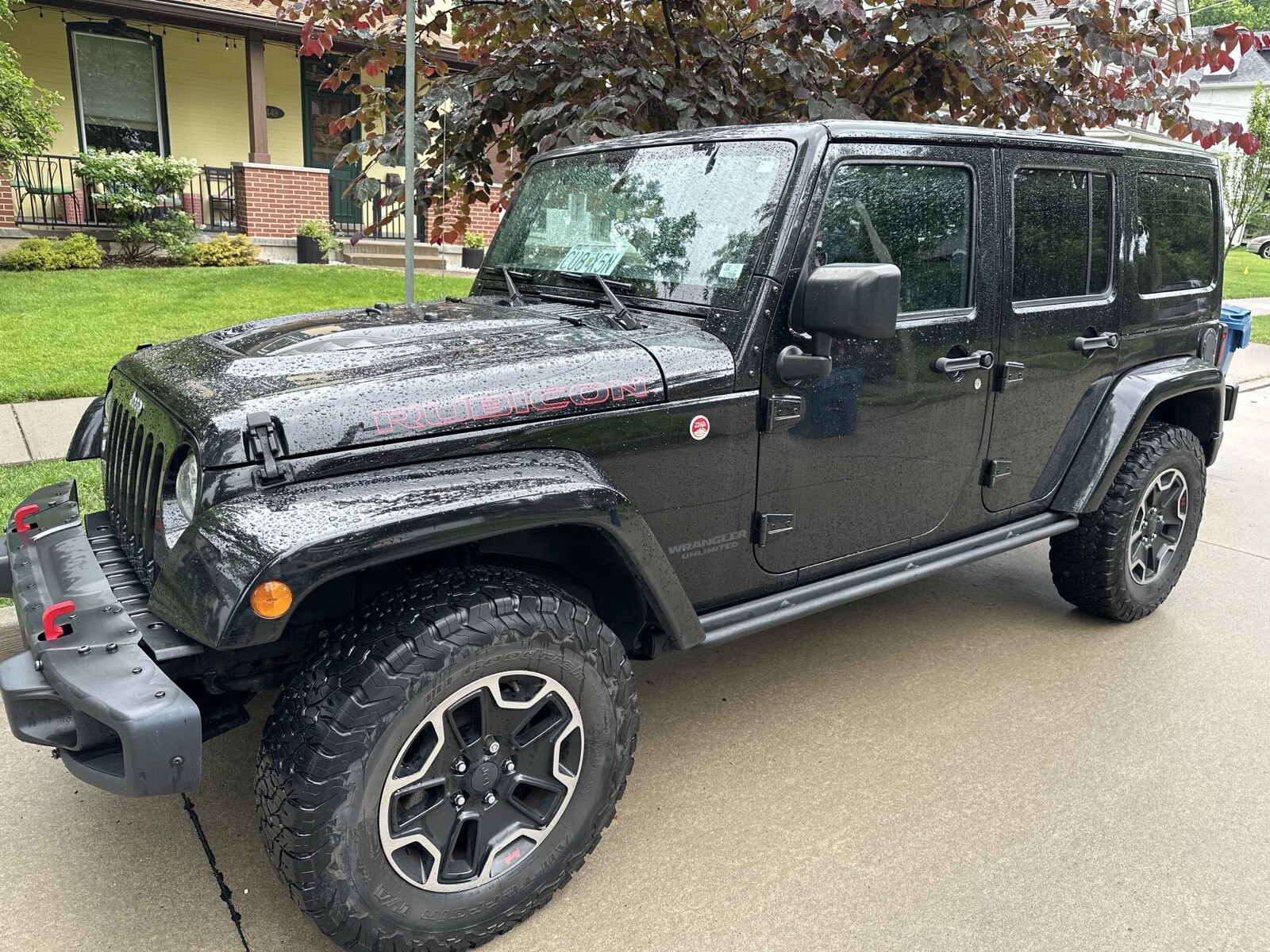 Black Jeep rubicon with trail tires. Fun to drive, 4 wheel is great for snow. A great car in general. All season trail tires with custom aluminum wheels. Not curbed. Spare tire has never been used. Has a tow package, skid plate, and set up for a winch as well.