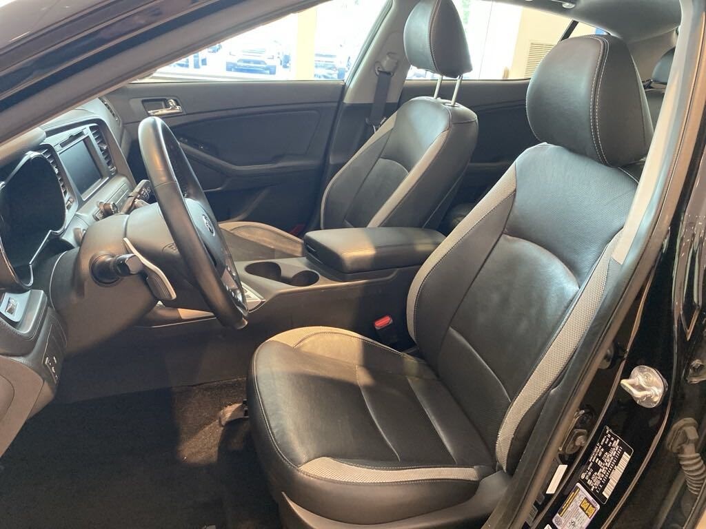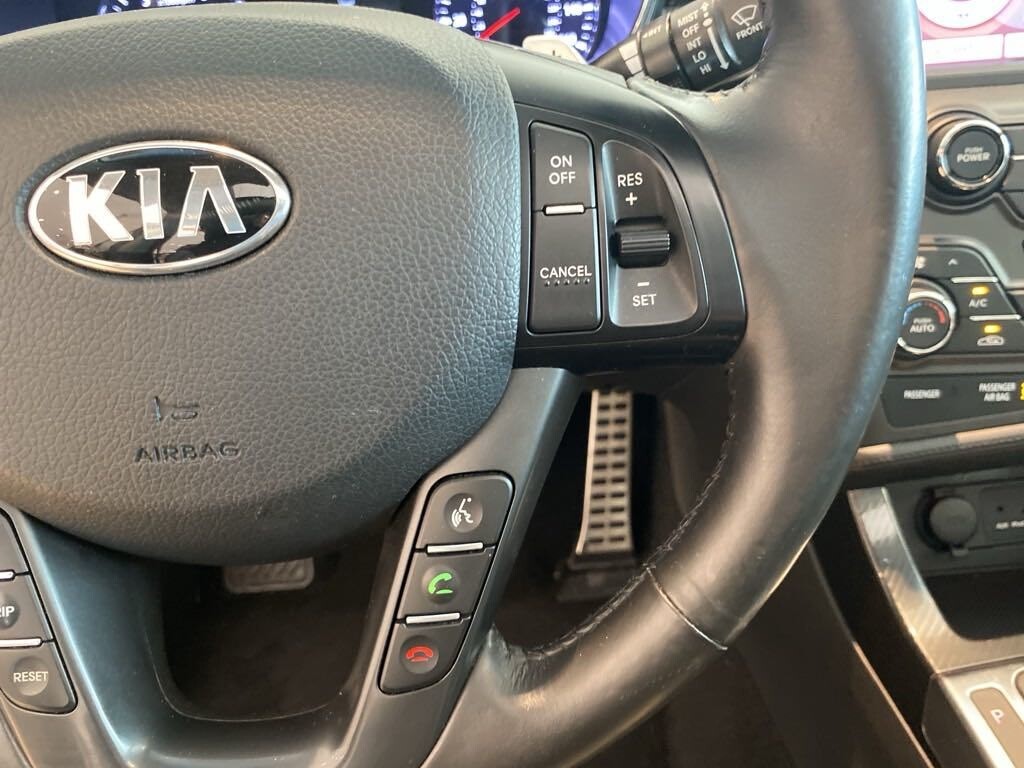 The 2013 Kia Optima SX in sleek black exudes modern sophistication, both inside and out. Its refined black interior offers a comfortable sanctuary, boasting features like Bluetooth wireless technology for seamless connectivity on the go. With remote keyless entry and push-button start, accessing and starting the vehicle is effortless, made even easier with the smart key technology. The heated outside mirrors with turn signal indicators enhance visibility and safety, while the panoramic sunroof brings an airy, open feel to the cabin. Enjoy ultimate comfort with heated and cooled front seats, perfect for any weather condition. Plus, the rear camera display provides added confidence and convenience when maneuvering in tight spaces. With its blend of style, technology, and comfort, the 2013 Kia Optima SX delivers a premium driving experience.
