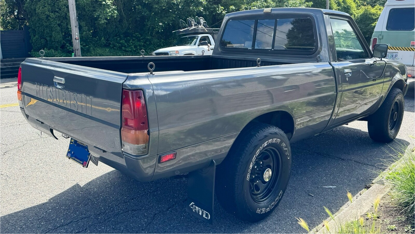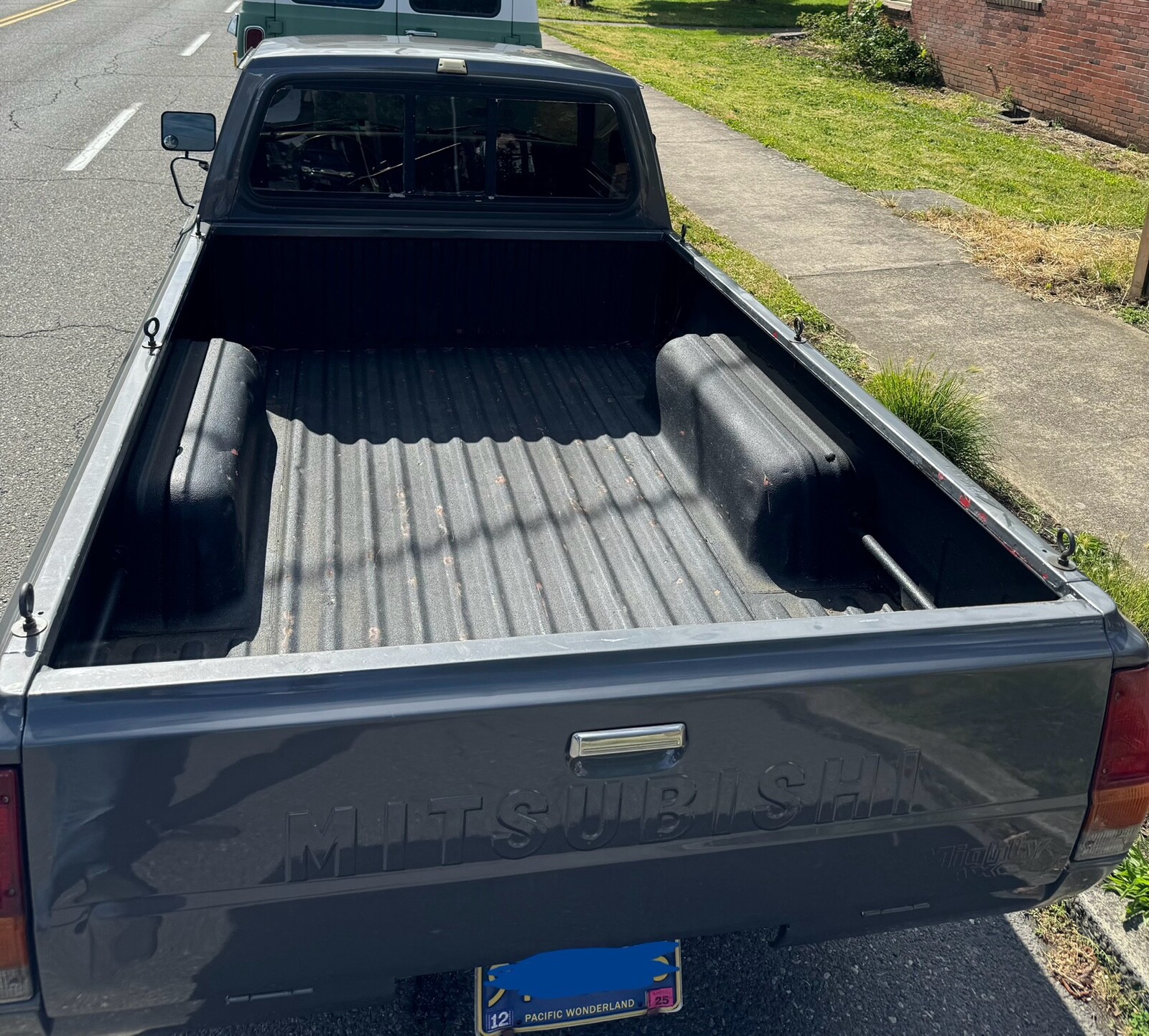 1986 manual 4x4 regular cab pickup truck, Mitsubishi mighty max, with cooper tires, aftermarket paint, wheels, and carburetor, radio, spray-on bed liner.