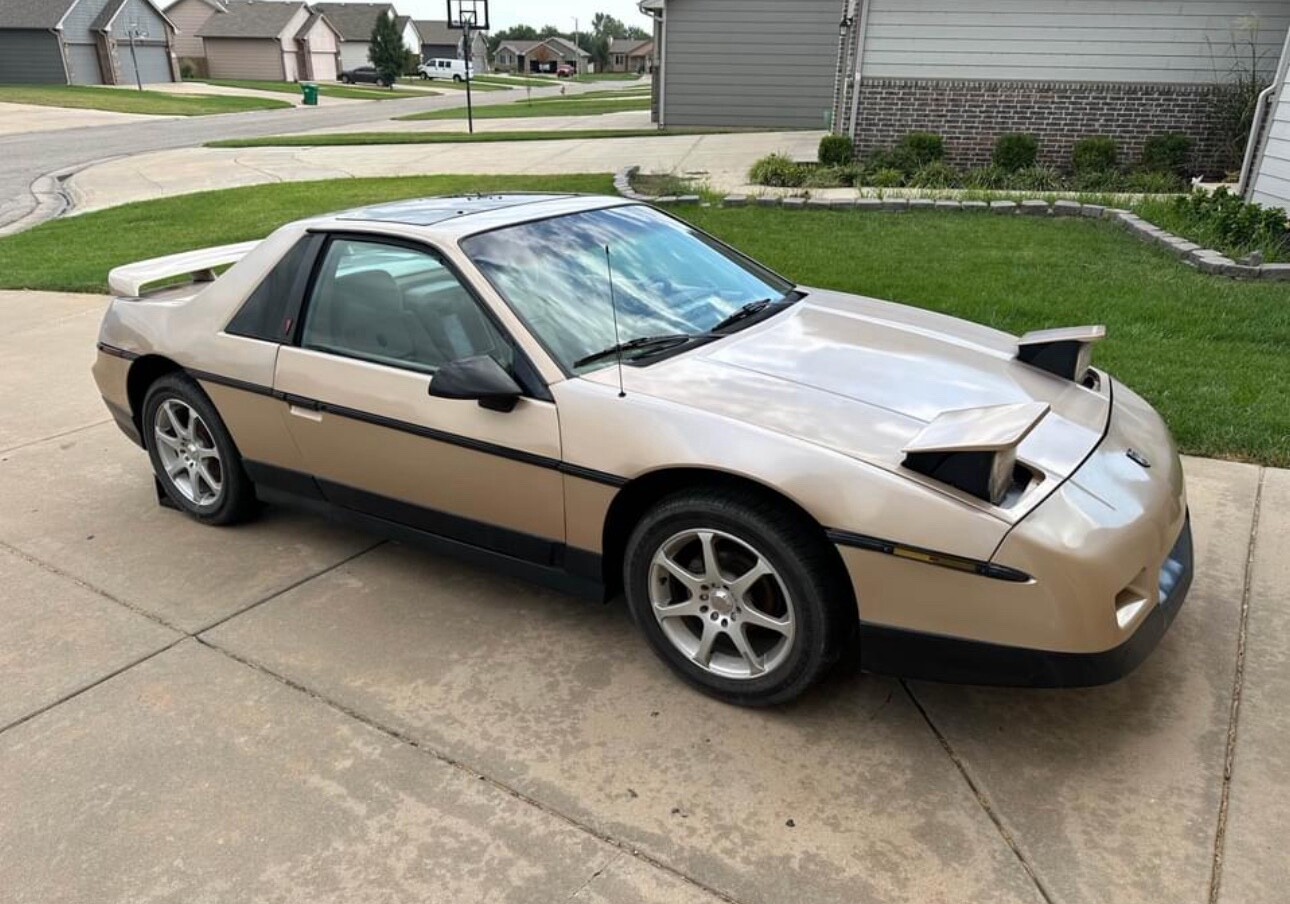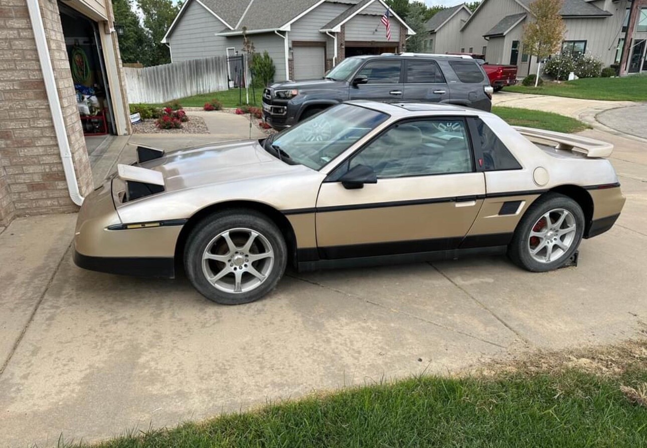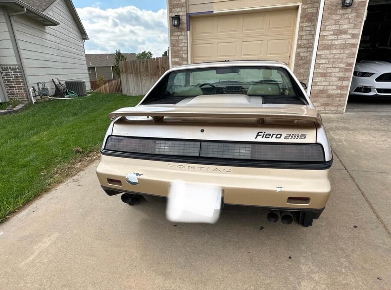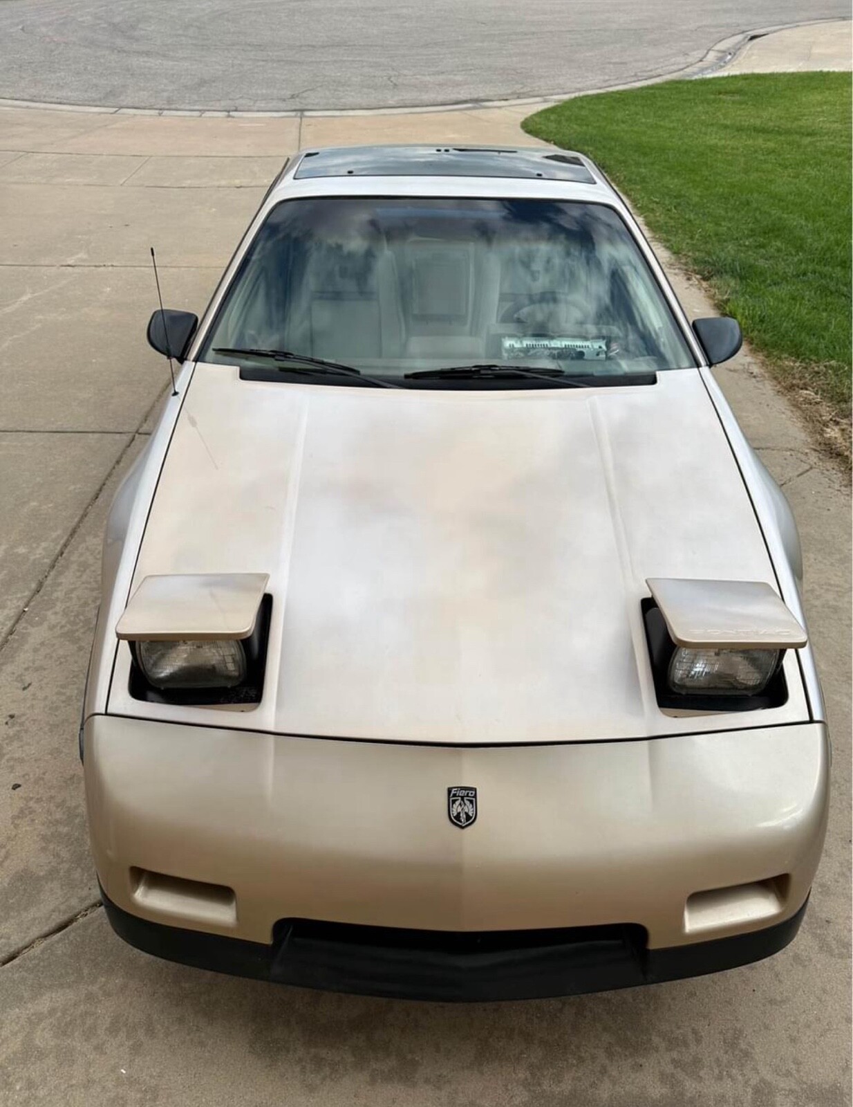 1986 Pontiac Fiero SE, 4-speed manual transmission. Newer rims on car, but also includes original factory wheels. Has A/C, heater, defrost, power windows / locks, removable sunroof. Exterior color is GOLD.