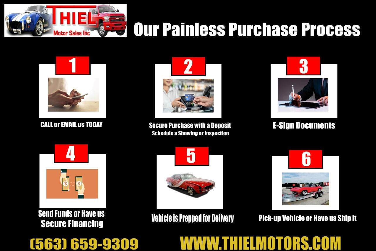 Due to our inventory size, location, and sometimes inclement weather, we are unable to drive every vehicle for long distances. We also cannot guarantee that every gauge, light, window, horn, option, function, etc., will work as it should. These cars are old, and components can fail at any time with little or no warning. Iowa is a non-inspection state; therefor, please check your local and state inspection/emissions requirements. Please note that we do not guarantee any factory or aftermarket air-conditioning systems, gauges, or electrical systems. Given the nature of the vintage vehicles we sell, these components will need upkeep or attention. In addition, many times these vehicles sit for long periods of time and once you begin to drive them, seals harden and gaskets may begin to leak. Classic cars are like old Harley motorcycles, they always leak. Please make sure you are comfortable with this before buying a vintage automobile. Classic vehicles will always require a certain amount of maintenance and upkeep. The information provided in this ad is solely for your convenience and advertising purposes. The description is an opinion only and should not be considered a complete description of any or all faults; it may not be relied upon nor taken as fact or otherwise a representation or warranty of any sort. Please note, we did not build or restore the vehicle. Some vehicles will come with original paperwork, restoration receipts, books, manuals, covers, additional keys; should the vehicle come with any of these items it will be listed in the description and sometimes shown in the photos. All vehicles are sold AS-IS, WHERE-IS with all faults known/unknown and with no implied warranty. Pre-Purchase inspections are welcomed and encouraged. We provide many detailed photos, YouTube “walk-around” videos, and describe these vehicles to the best of our ability. We do offer a classic car extended warranty package through Freedom Warranties, please contact a Thiel Motor Sales representative for exact coverage and cost.