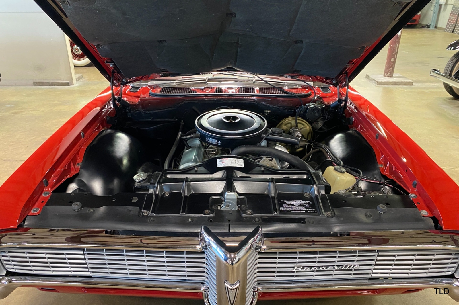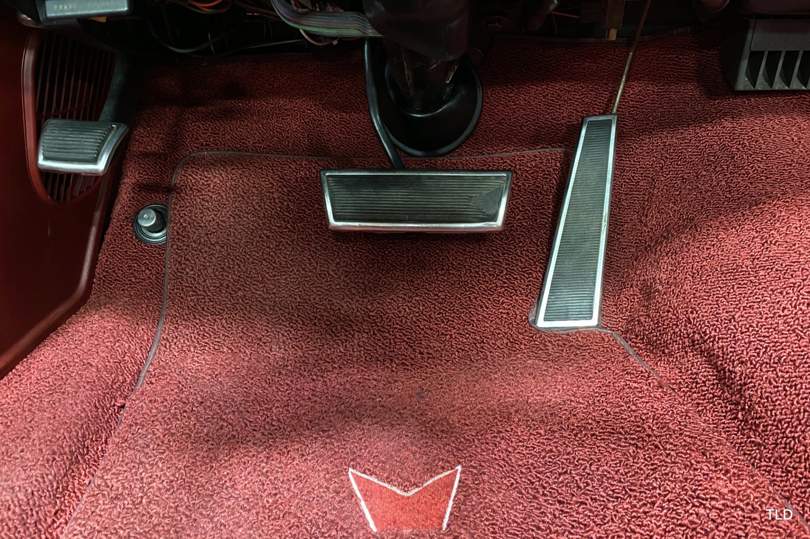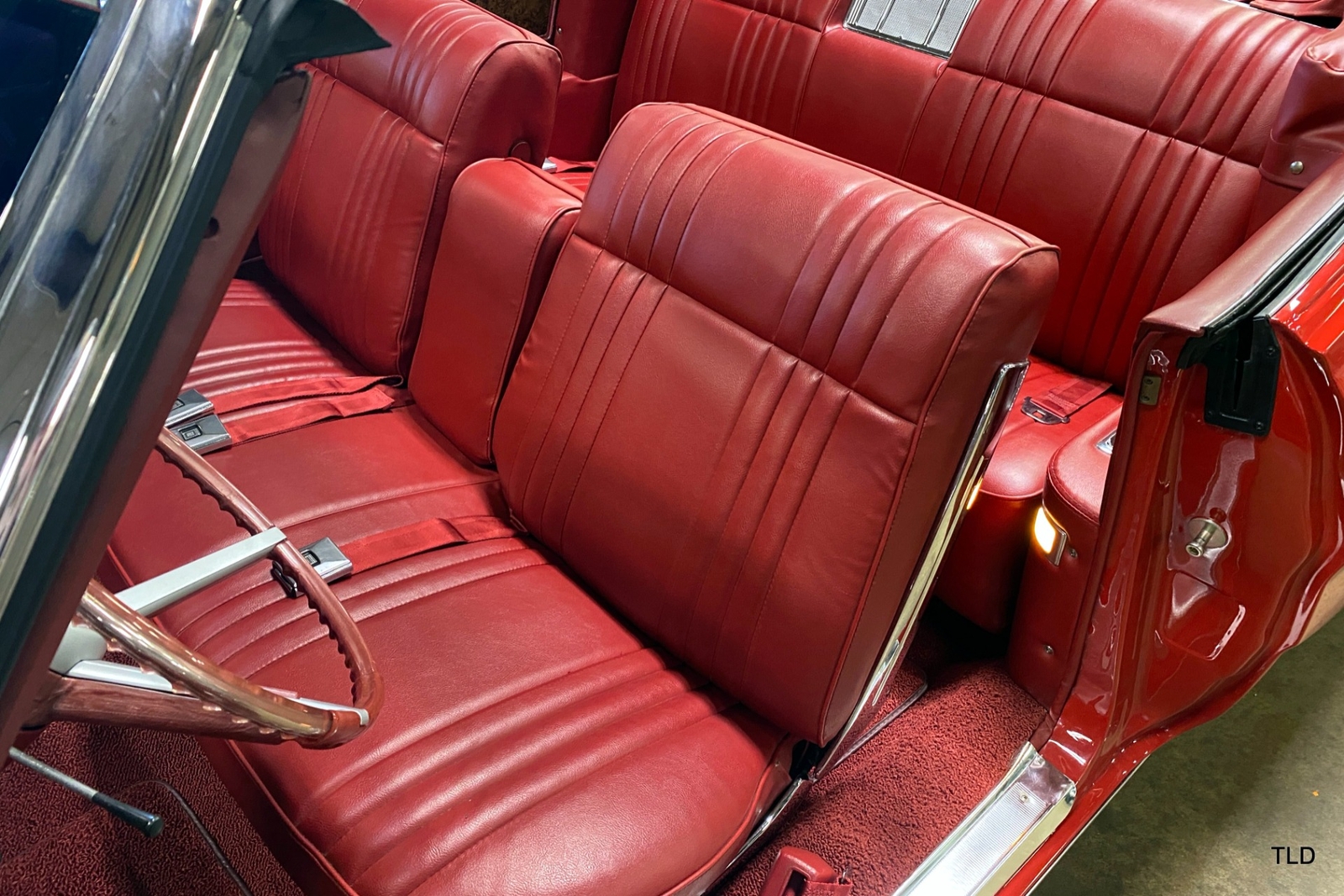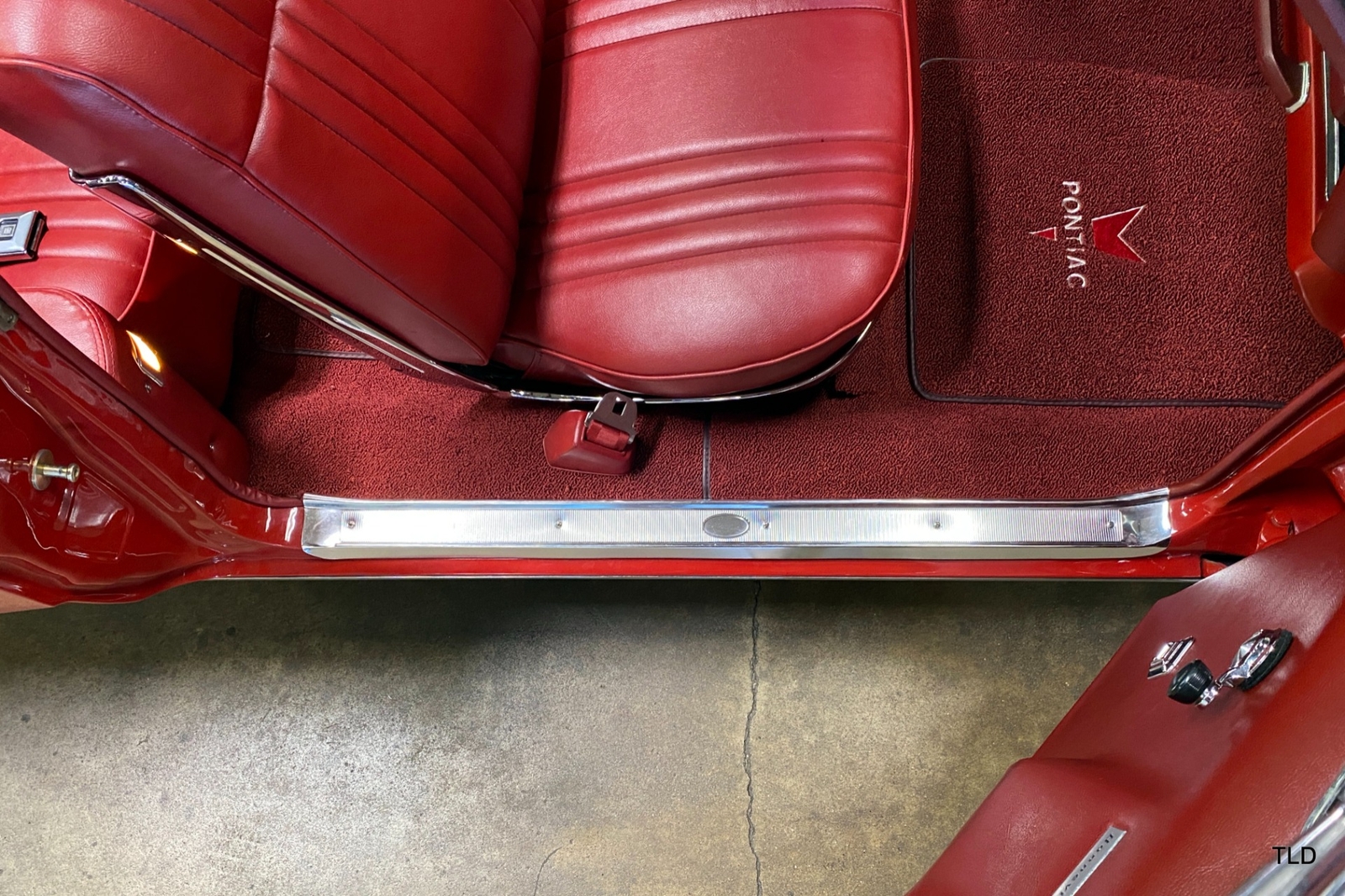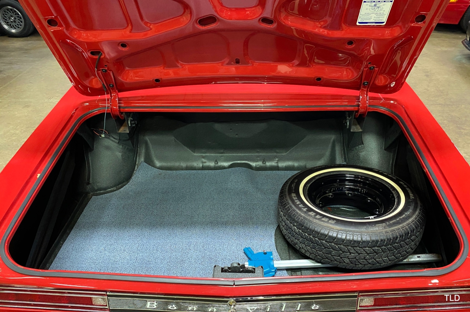 Passenger amenities include the Red bench seat interior with matching seat belts, a factory pushbutton AM radio, wood grain accents, and power windows. The driver is greeted by a factory 3-spoke steering wheel with tilt column. Power brakes and power steering deliver a relaxed driving experience. Exterior highlights include hide-away headlights, rear-fender skirts, chrome bumpers and Pontiac's exclusive 8-lug wheels with integral brake drums mounting Whitewall tires. Dual exhaust delivers a throaty note. A roadside jack and tools are included.
