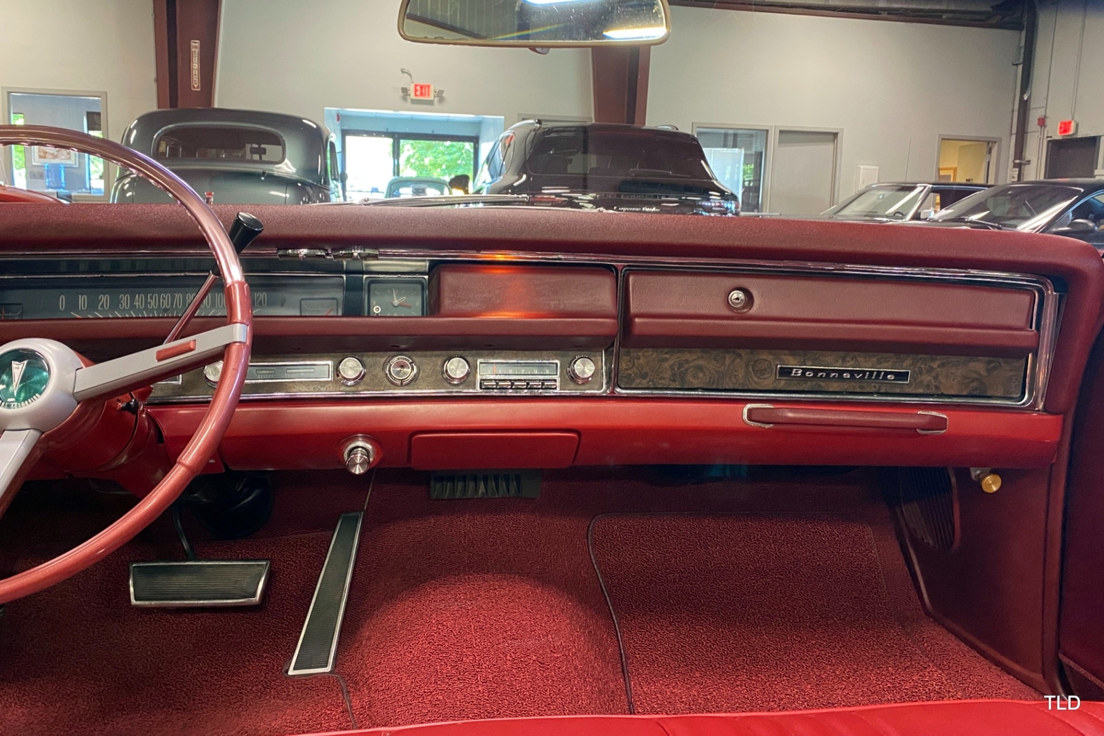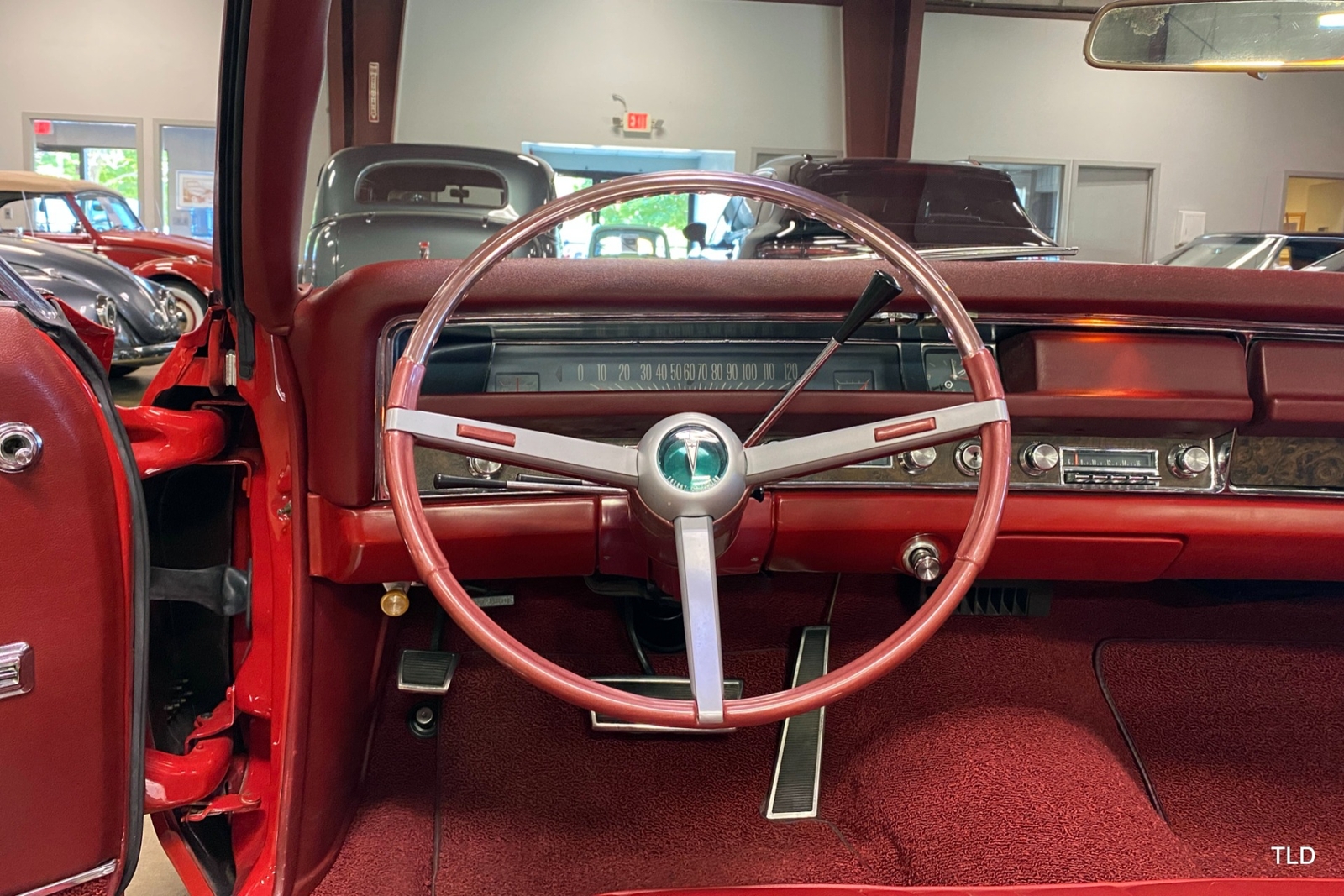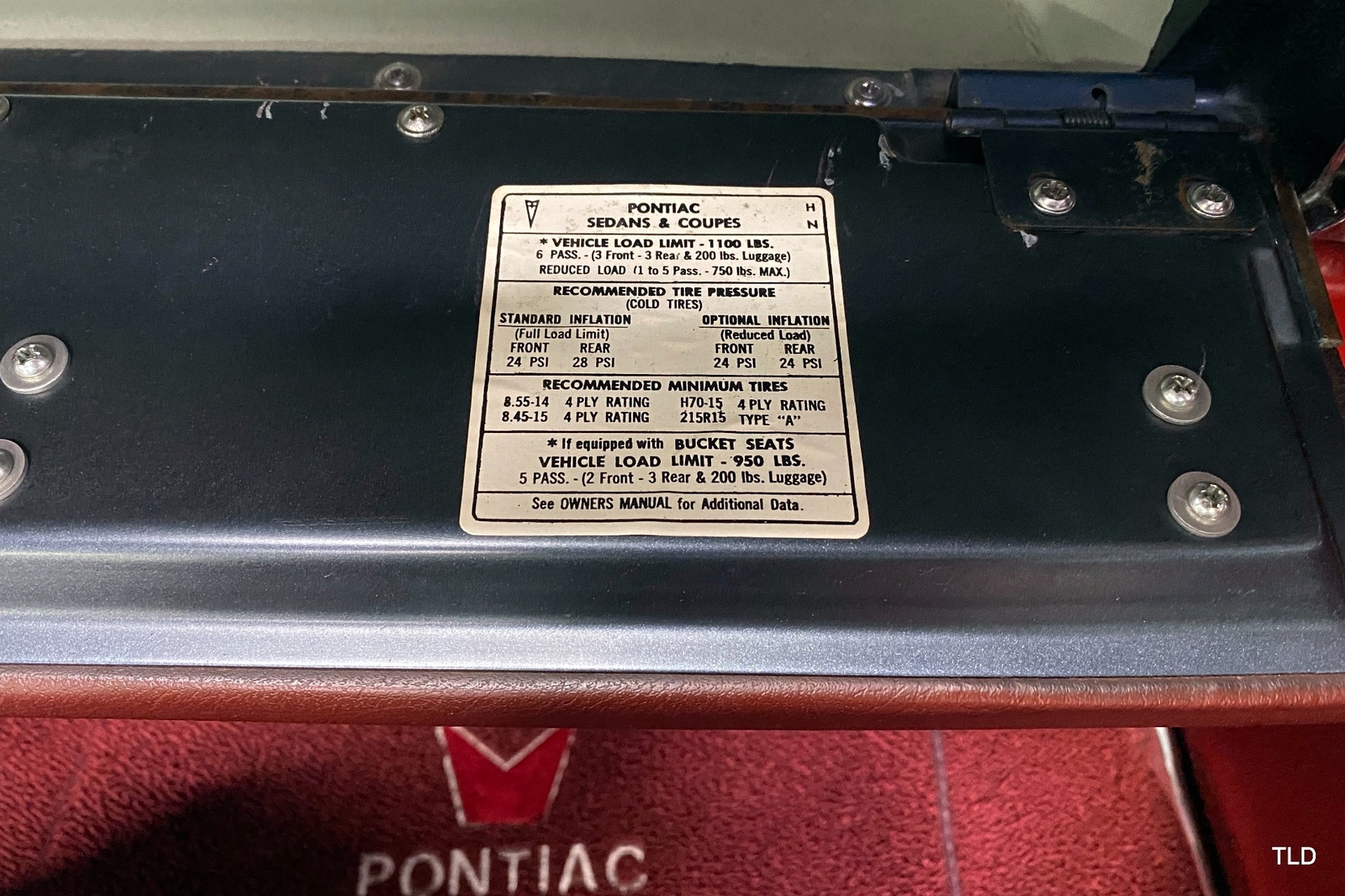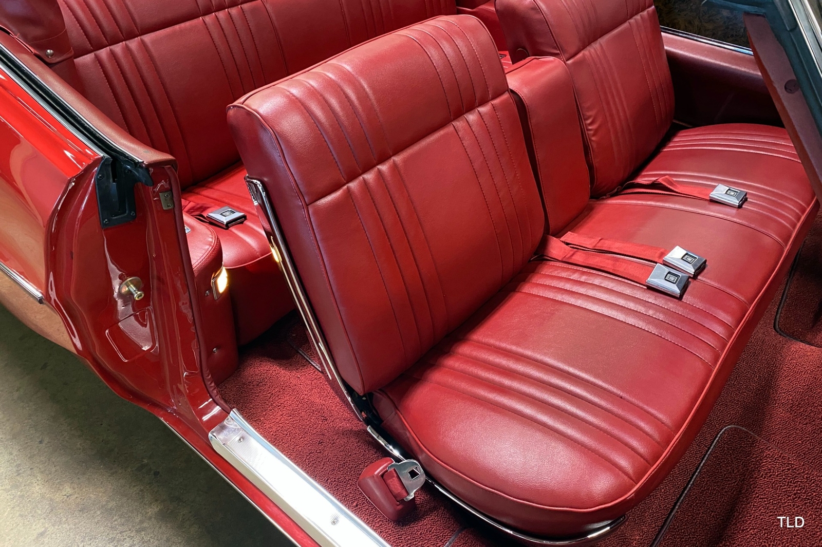 Passenger amenities include the Red bench seat interior with matching seat belts, a factory pushbutton AM radio, wood grain accents, and power windows. The driver is greeted by a factory 3-spoke steering wheel with tilt column. Power brakes and power steering deliver a relaxed driving experience. Exterior highlights include hide-away headlights, rear-fender skirts, chrome bumpers and Pontiac's exclusive 8-lug wheels with integral brake drums mounting Whitewall tires. Dual exhaust delivers a throaty note. A roadside jack and tools are included.