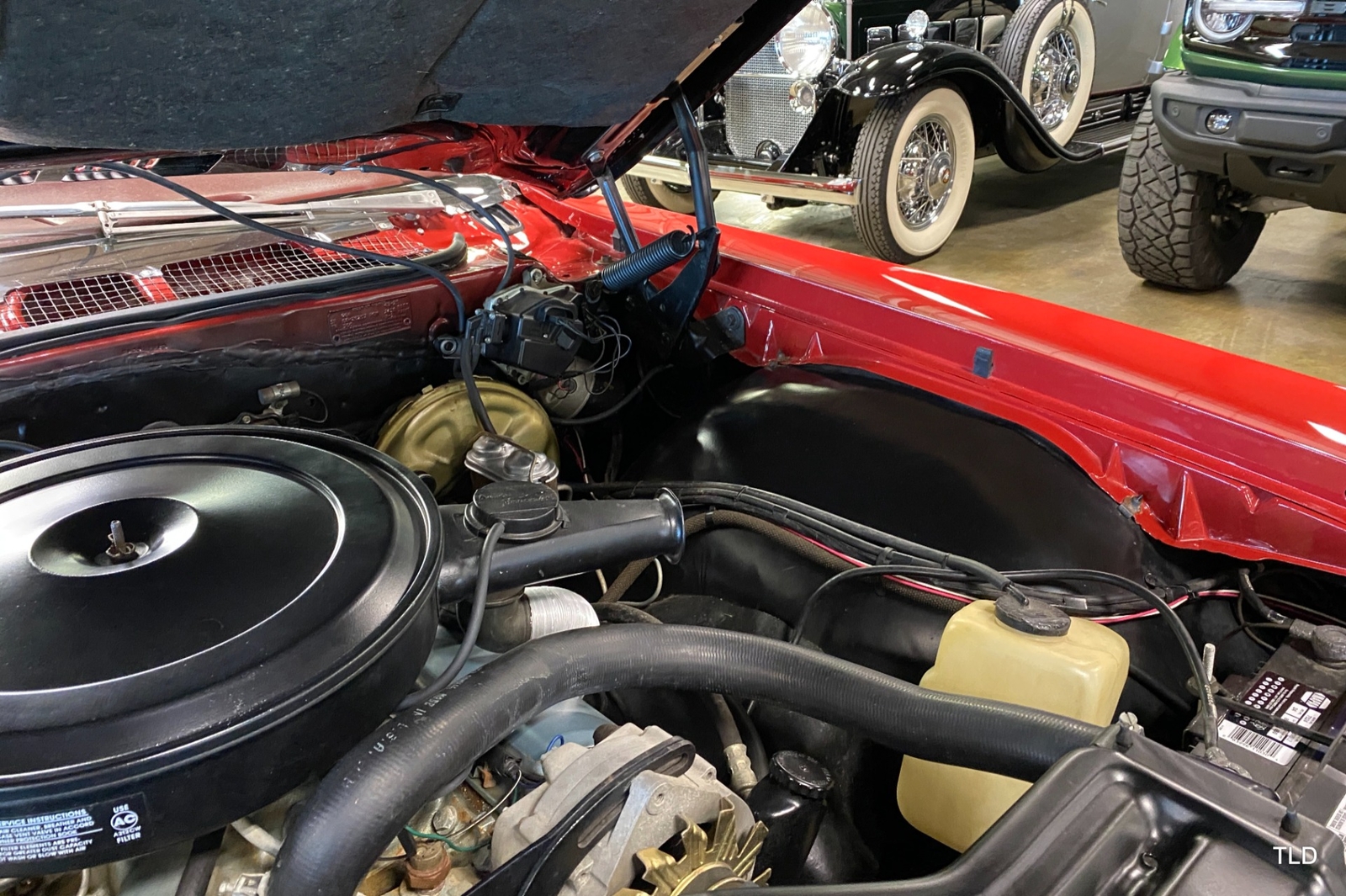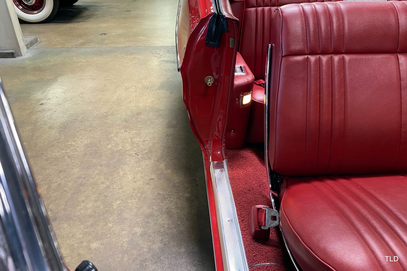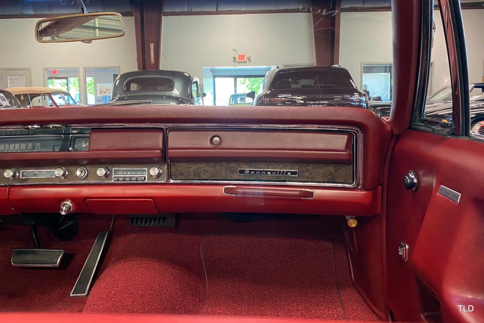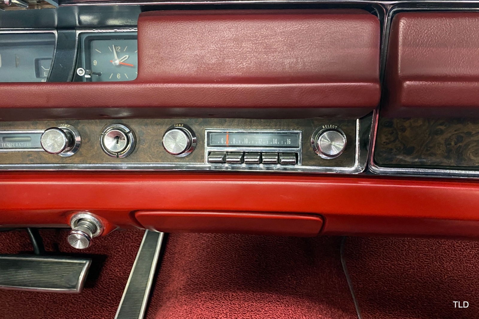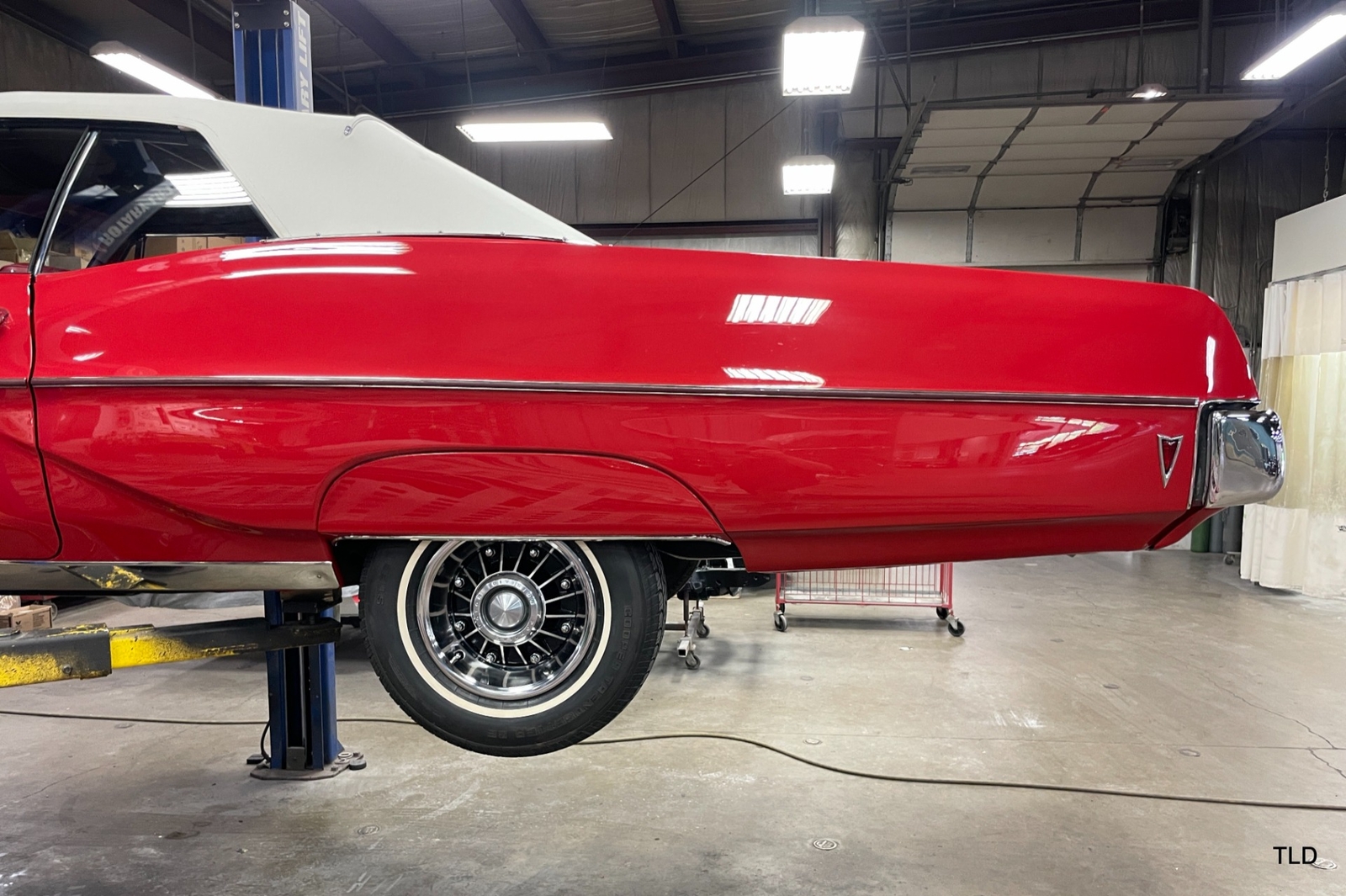 Passenger amenities include the Red bench seat interior with matching seat belts, a factory pushbutton AM radio, wood grain accents, and power windows. The driver is greeted by a factory 3-spoke steering wheel with tilt column. Power brakes and power steering deliver a relaxed driving experience. Exterior highlights include hide-away headlights, rear-fender skirts, chrome bumpers and Pontiac's exclusive 8-lug wheels with integral brake drums mounting Whitewall tires. Dual exhaust delivers a throaty note. A roadside jack and tools are included.