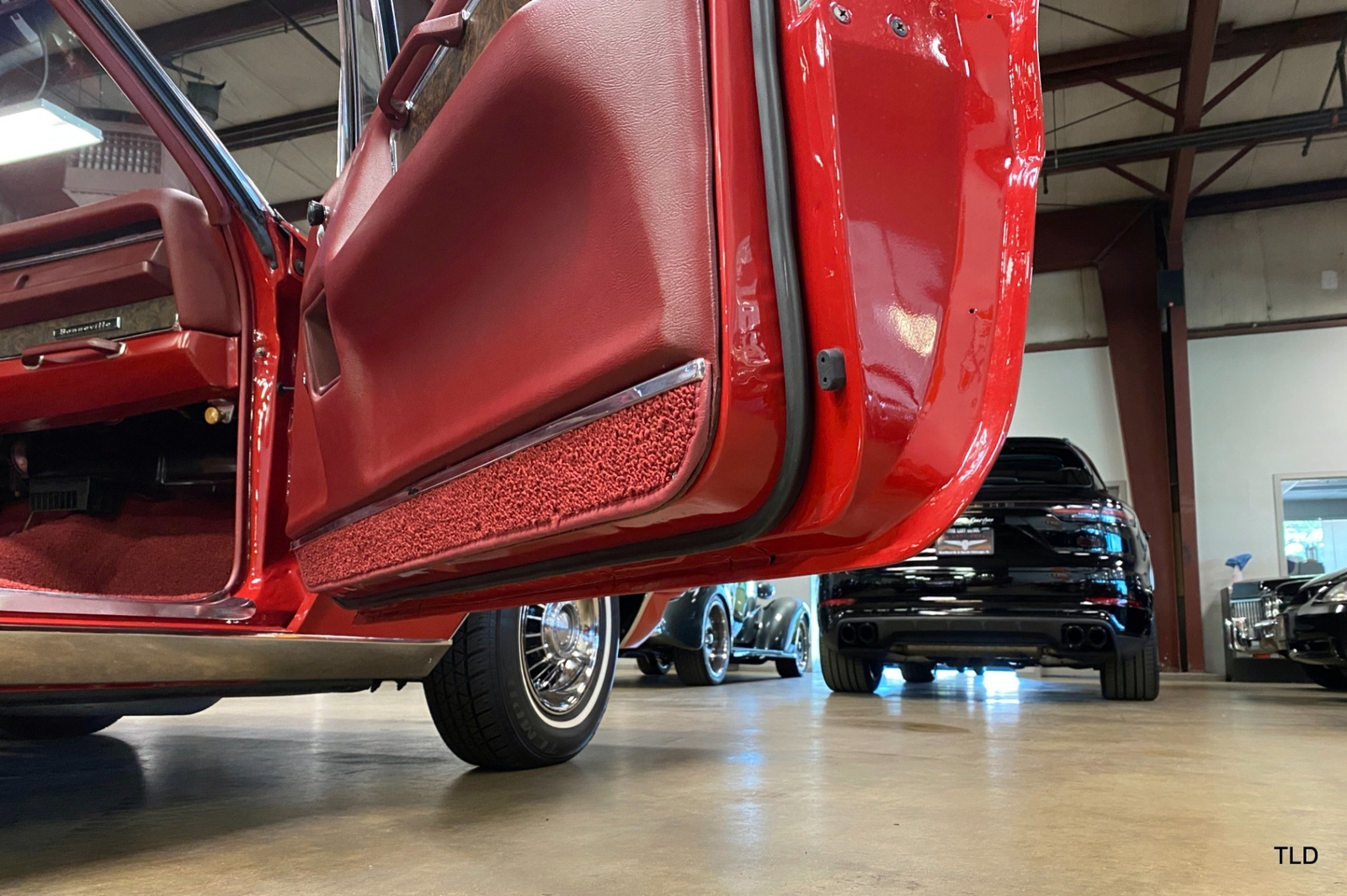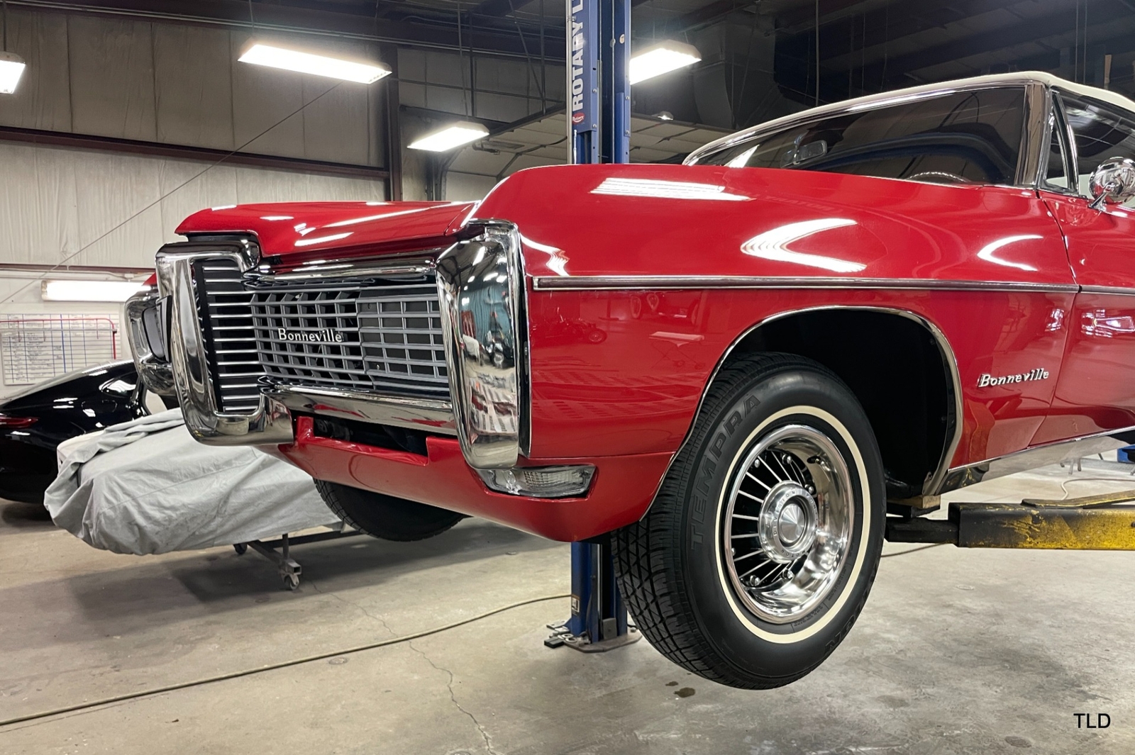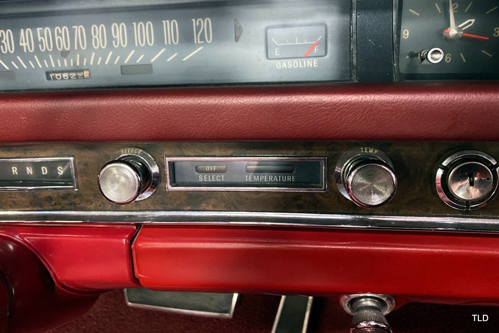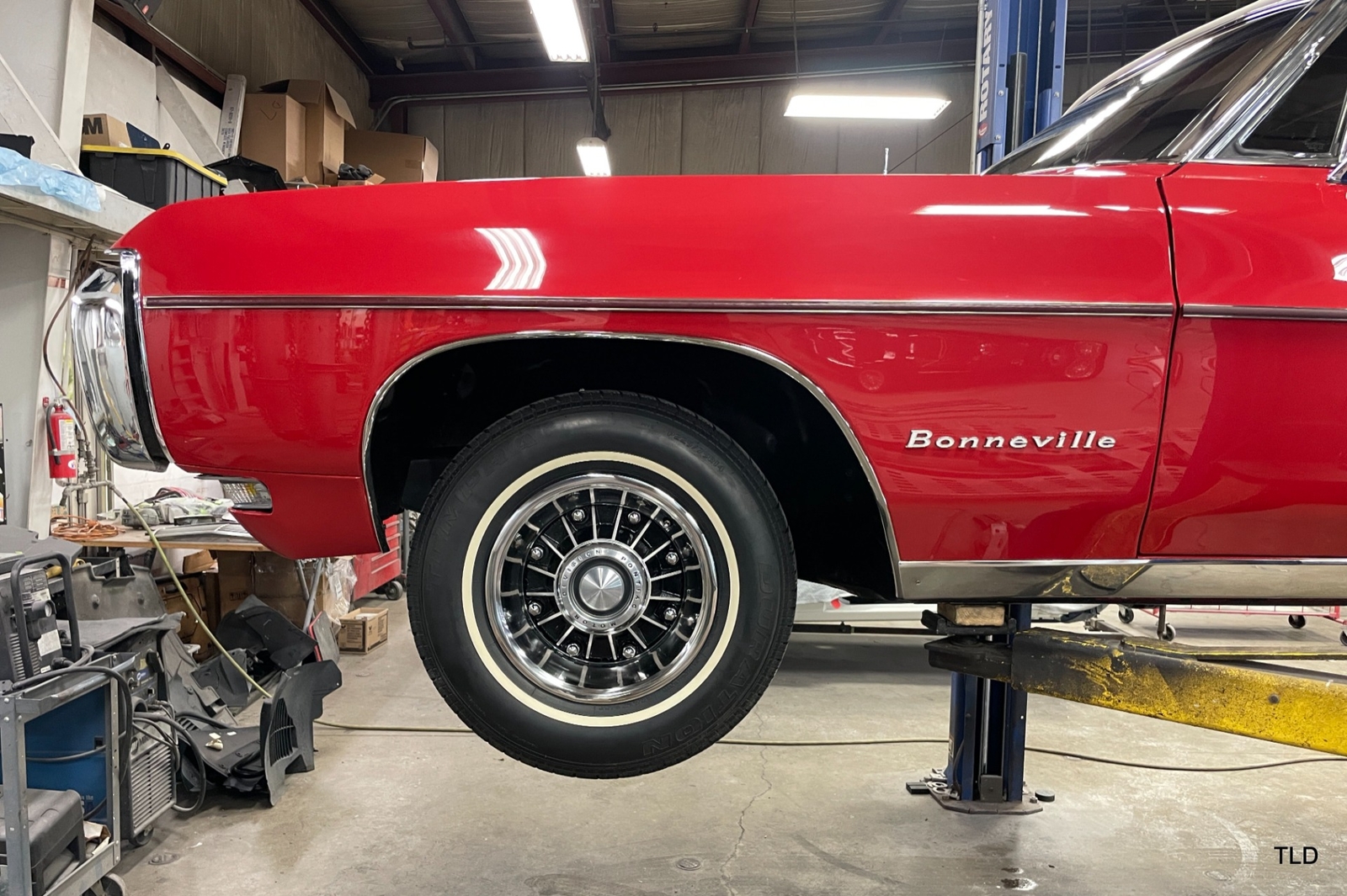 Passenger amenities include the Red bench seat interior with matching seat belts, a factory pushbutton AM radio, wood grain accents, and power windows. The driver is greeted by a factory 3-spoke steering wheel with tilt column. Power brakes and power steering deliver a relaxed driving experience. Exterior highlights include hide-away headlights, rear-fender skirts, chrome bumpers and Pontiac's exclusive 8-lug wheels with integral brake drums mounting Whitewall tires. Dual exhaust delivers a throaty note. A roadside jack and tools are included.