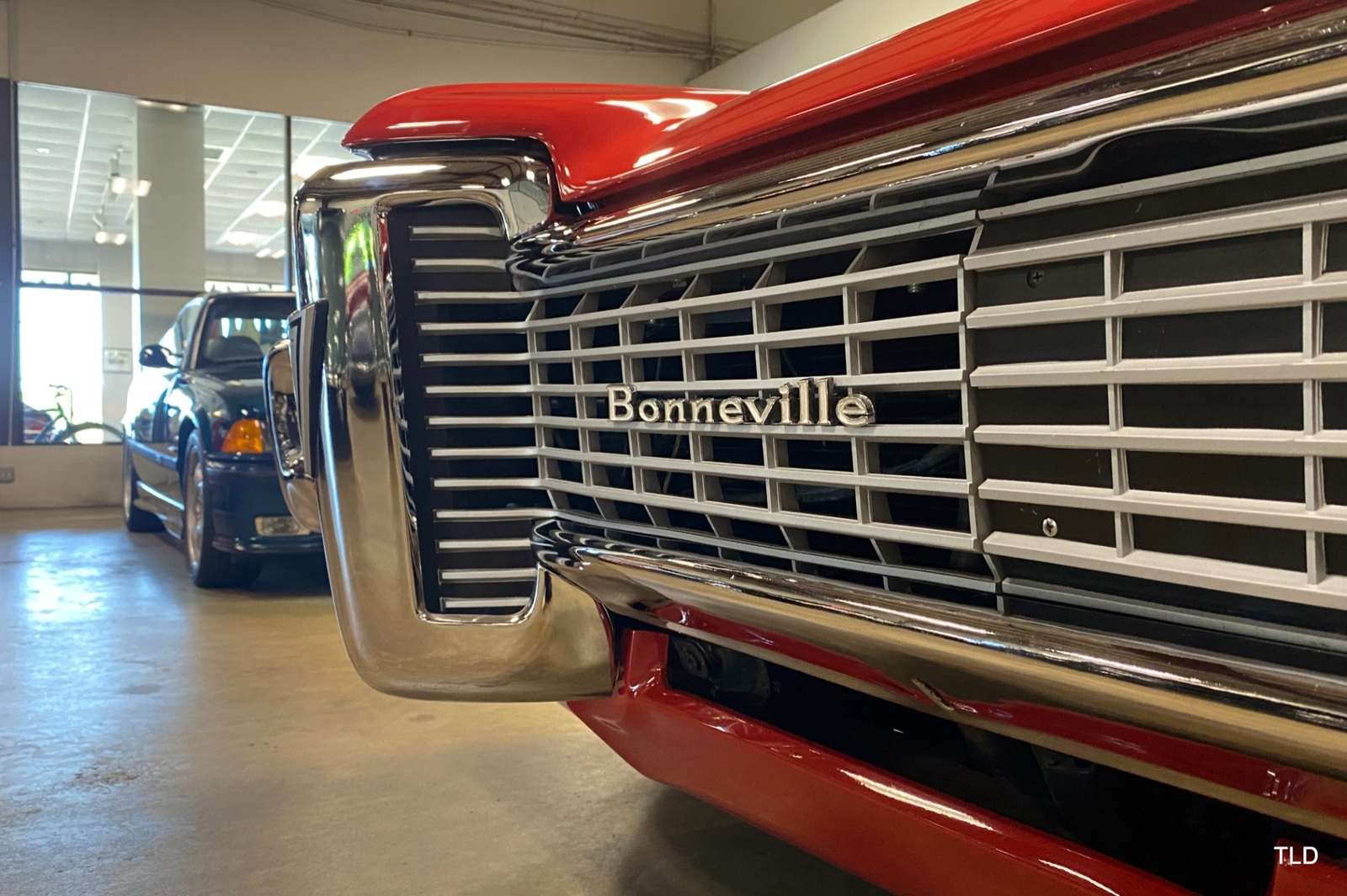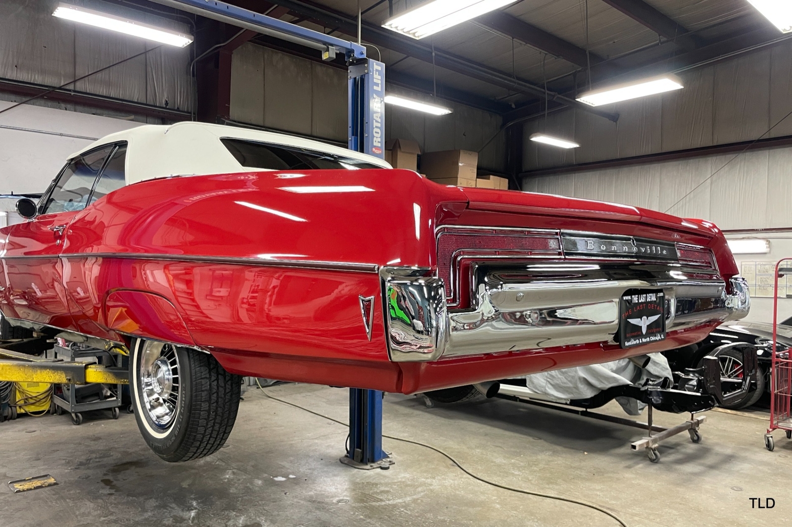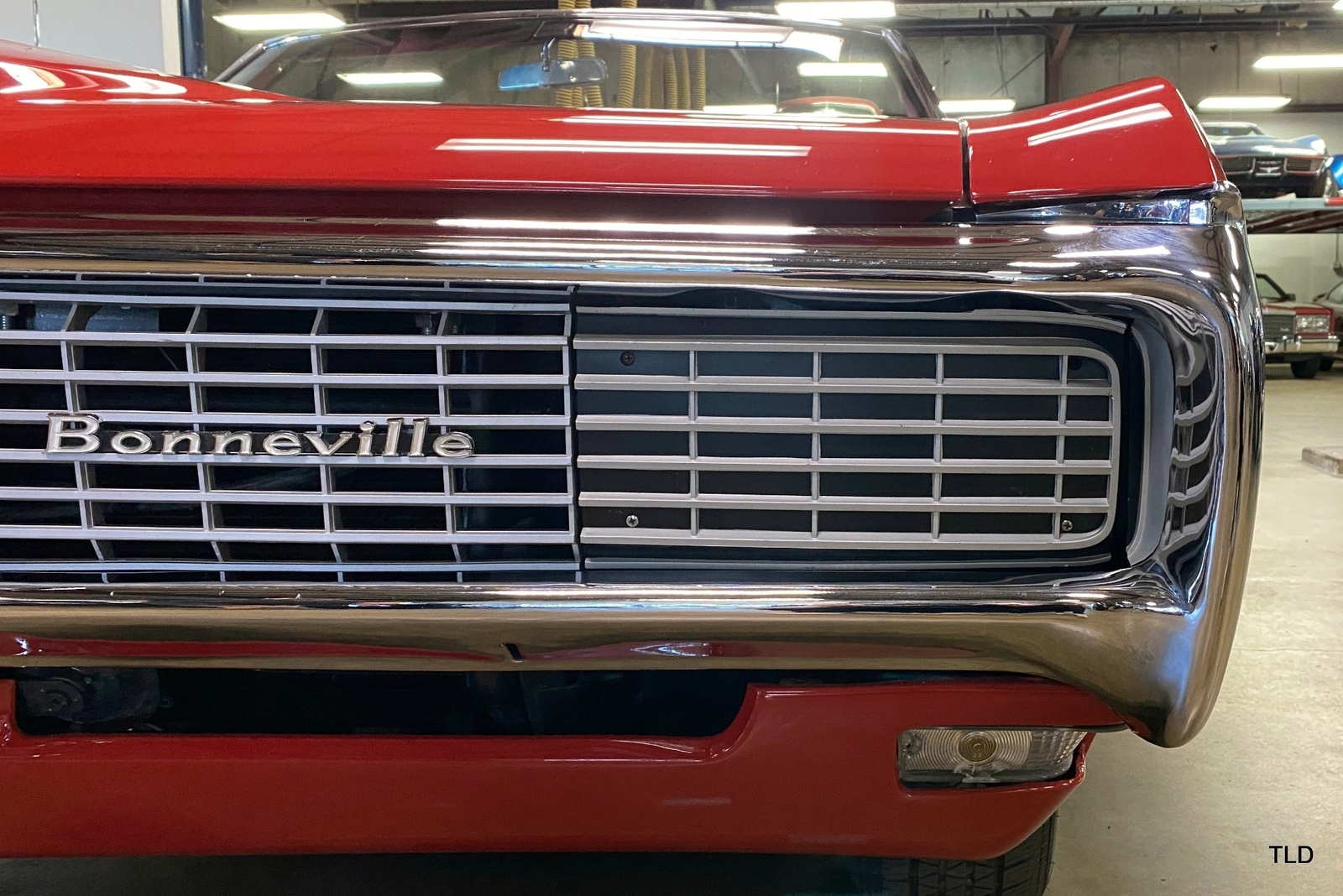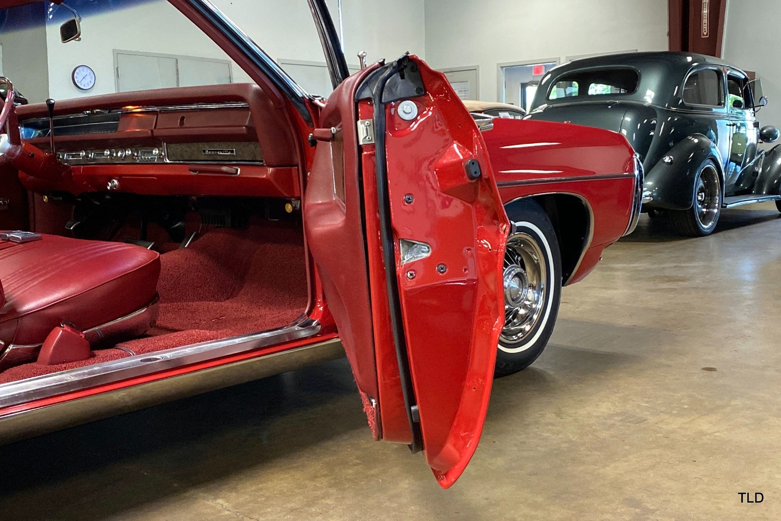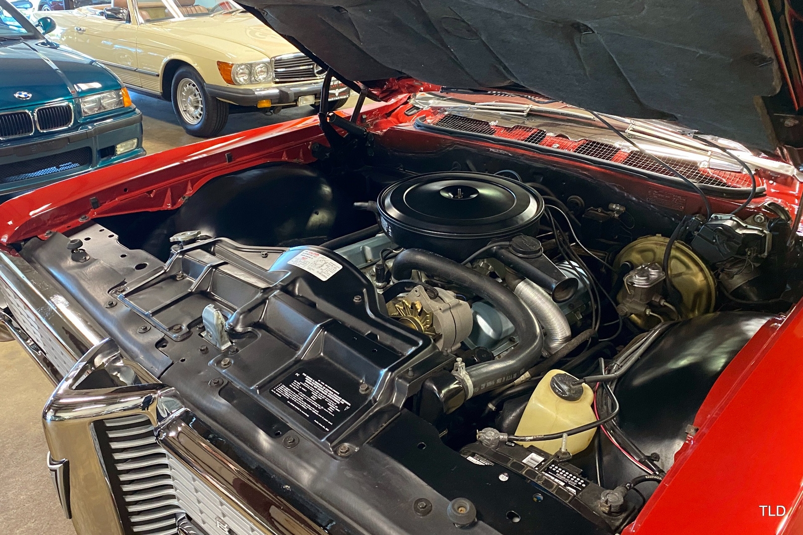 Passenger amenities include the Red bench seat interior with matching seat belts, a factory pushbutton AM radio, wood grain accents, and power windows. The driver is greeted by a factory 3-spoke steering wheel with tilt column. Power brakes and power steering deliver a relaxed driving experience. Exterior highlights include hide-away headlights, rear-fender skirts, chrome bumpers and Pontiac's exclusive 8-lug wheels with integral brake drums mounting Whitewall tires. Dual exhaust delivers a throaty note. A roadside jack and tools are included.