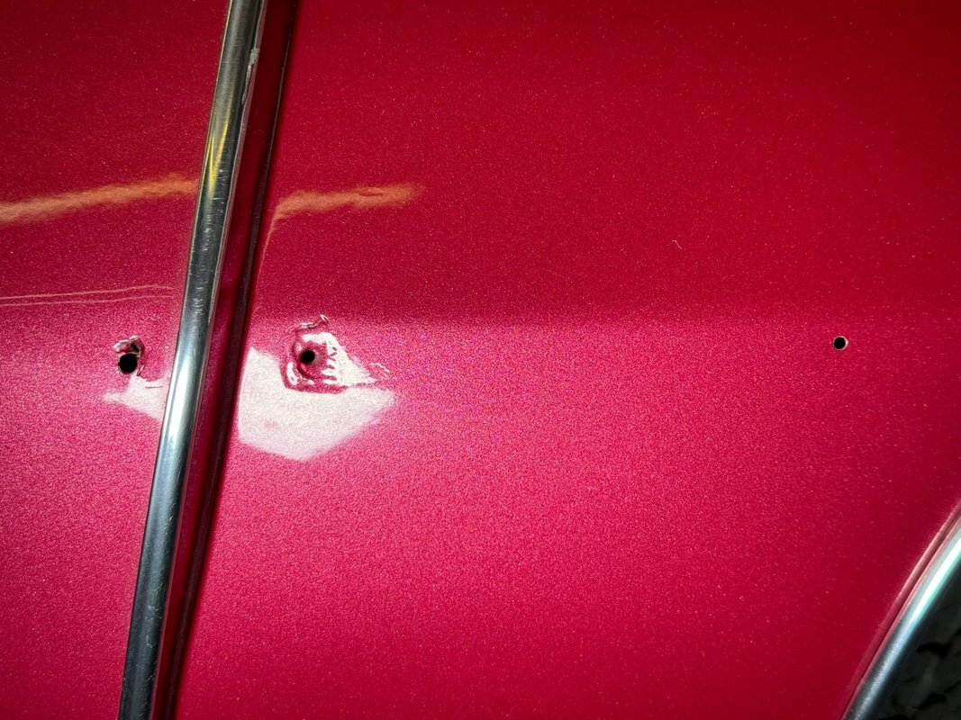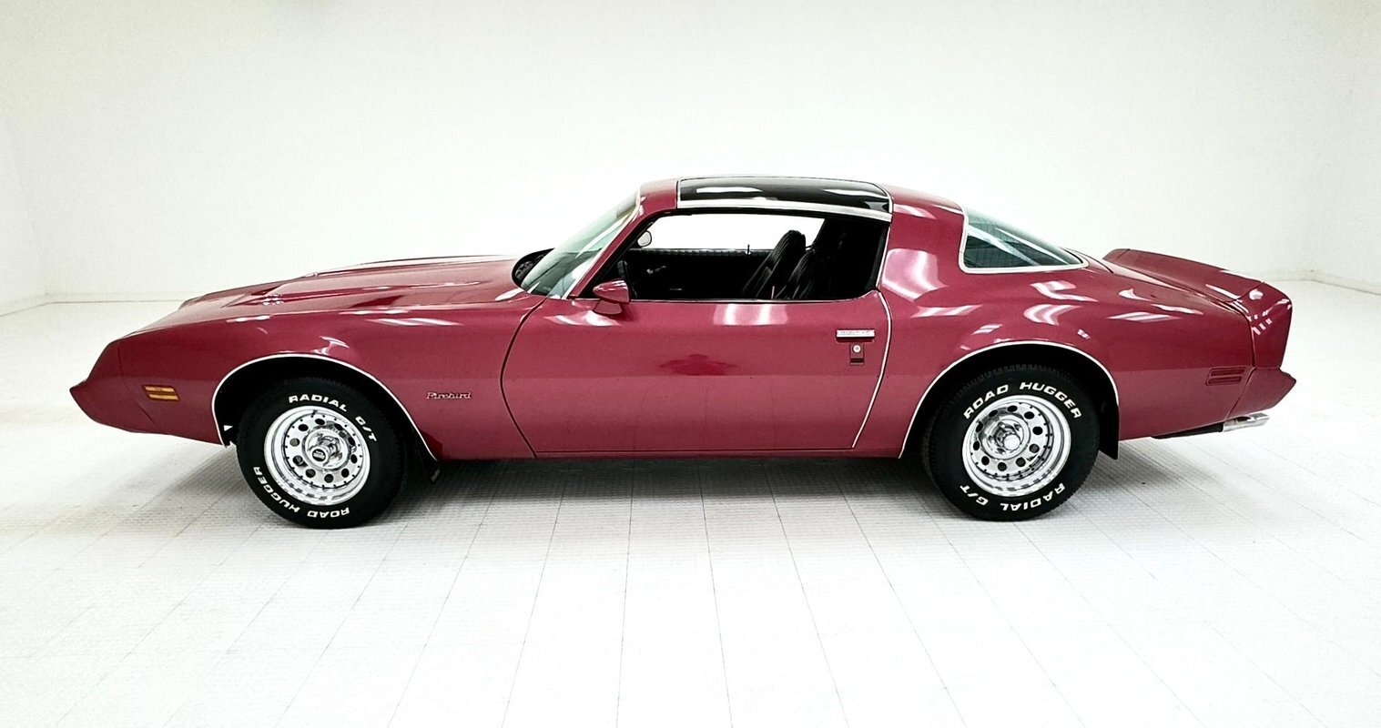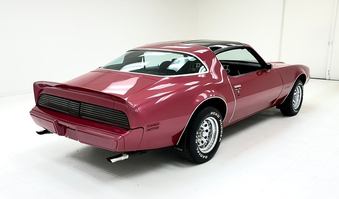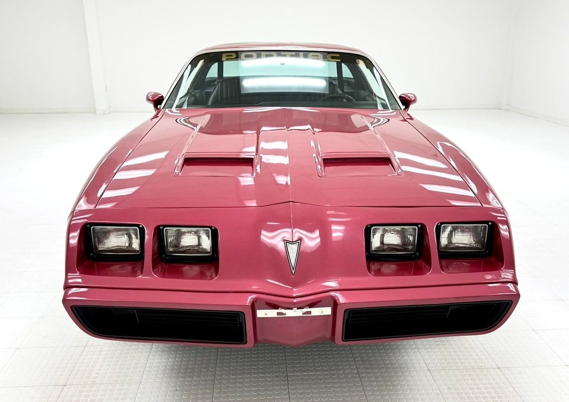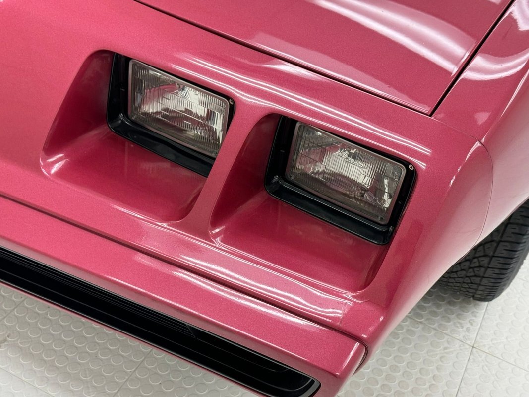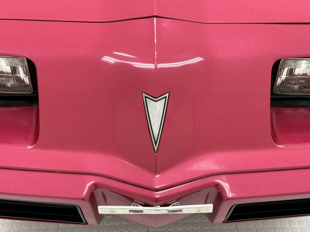 Born as a Platinum Poly car (silver), the car now wears a unique shade of Mopar's throwback hue of Furious Fuchsia. It looks good on the car and covers the hood scoop entry points which would otherwise have been painted in a contrasting color when new. The Pontiac arrow on the nose is shows in silver and the black plastic grille inserts and headlight bezels also present contrast up front. A Pontiac windshield banner looks vintage and brings your eyes to the Fisher T-tops which seemed so normal back in the day but now present as a fascinating design feature. The short trunk lid leads to the iconic three piece spoiler which tops a rear design that is, in this writer's opinion, one of the great American tails. Heavily smoked tail lights meet the gas cap door with the matching horizontal pattern creating a light bar that goes from one fender to the other. The smooth bumper cover is body colored and mirrors the taillight shape flipped upside down. Gone are the Trans Am style exhaust splitters and in its place are straight tailpipes with square chrome tips. 15-inch American Racing Chrome Nuggets wear some vintage Road Hugger Radial G/T tires. The paint is in overall good condition. We note holes where side molding would have been installed and removed at some point. A few paint bubbles, scratches and minor imperfections were also noted.