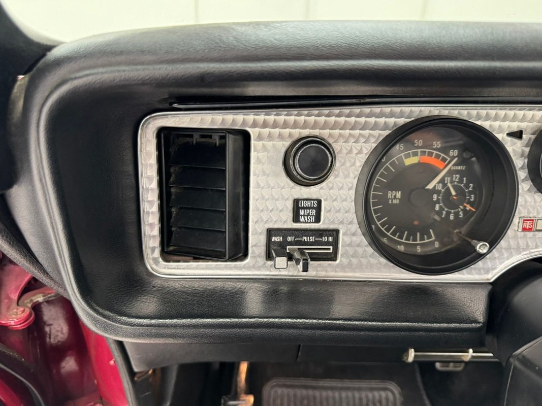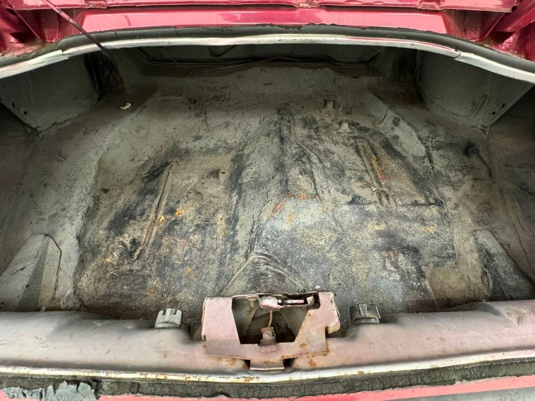 Black vinyl door panels greet us with some wear on the driver's side armrest. The bucket seats are also covered with black vinyl with tuck and roll texturing. The 2+2 buckets in the back and the rear shelf mirror the design and color. Some wear is noted on a rear plastic panel. The Trans Am style steering wheel would have been standard on Formulas and this one is a bit rough showing some taped repair and covered in an aftermarket laced cover and it's missing the Firebird center cap. Machined metal applique covers the dashboard which carries over from the Trans Am and houses essential gauges and the heater controls. An aftermarket Optimus AM/FM/Cassette is in the center stack above an ashtray and storage slot. The top of the dash is pretty badly cracked. Fortunately, there are plenty of aftermarket vendors to support any kind of F-body restoration. The center console sits on the transmission hump and houses the automatic shifter in a plastic base. The low pile black carpet is in good condition. The trunk is barren and uncovered and we note the weather stripping is deteriorated.