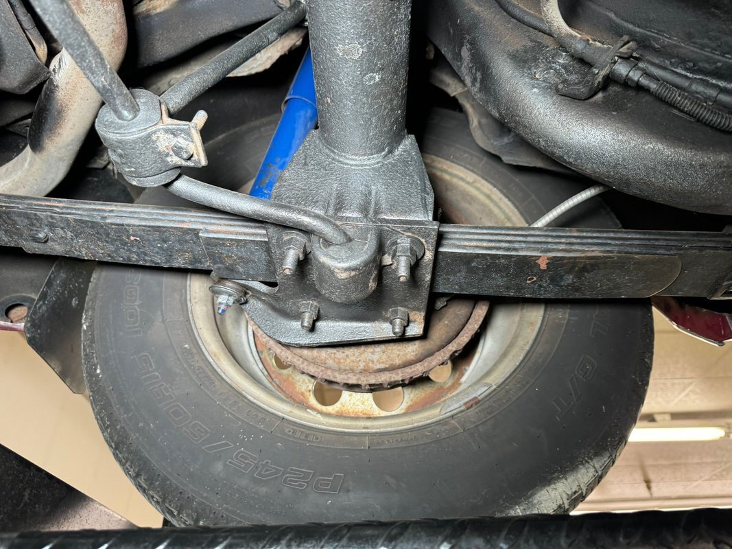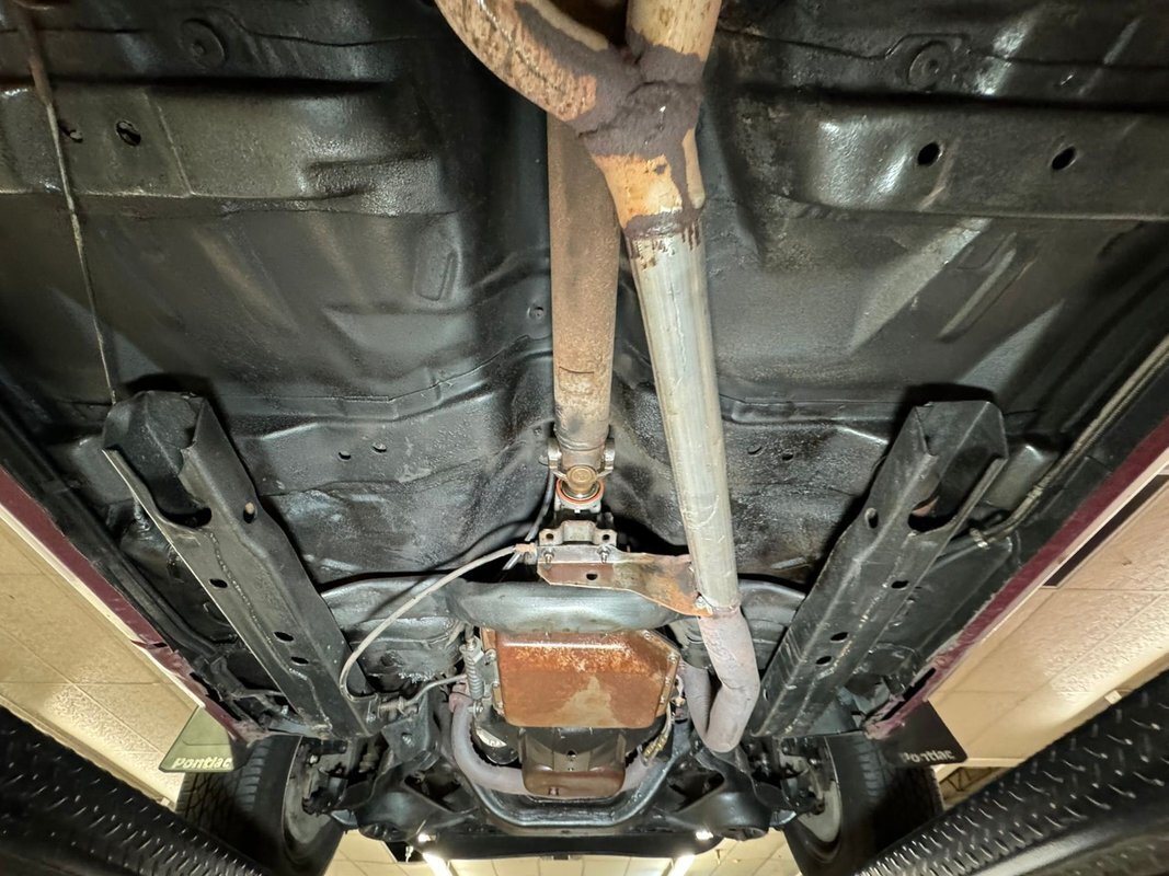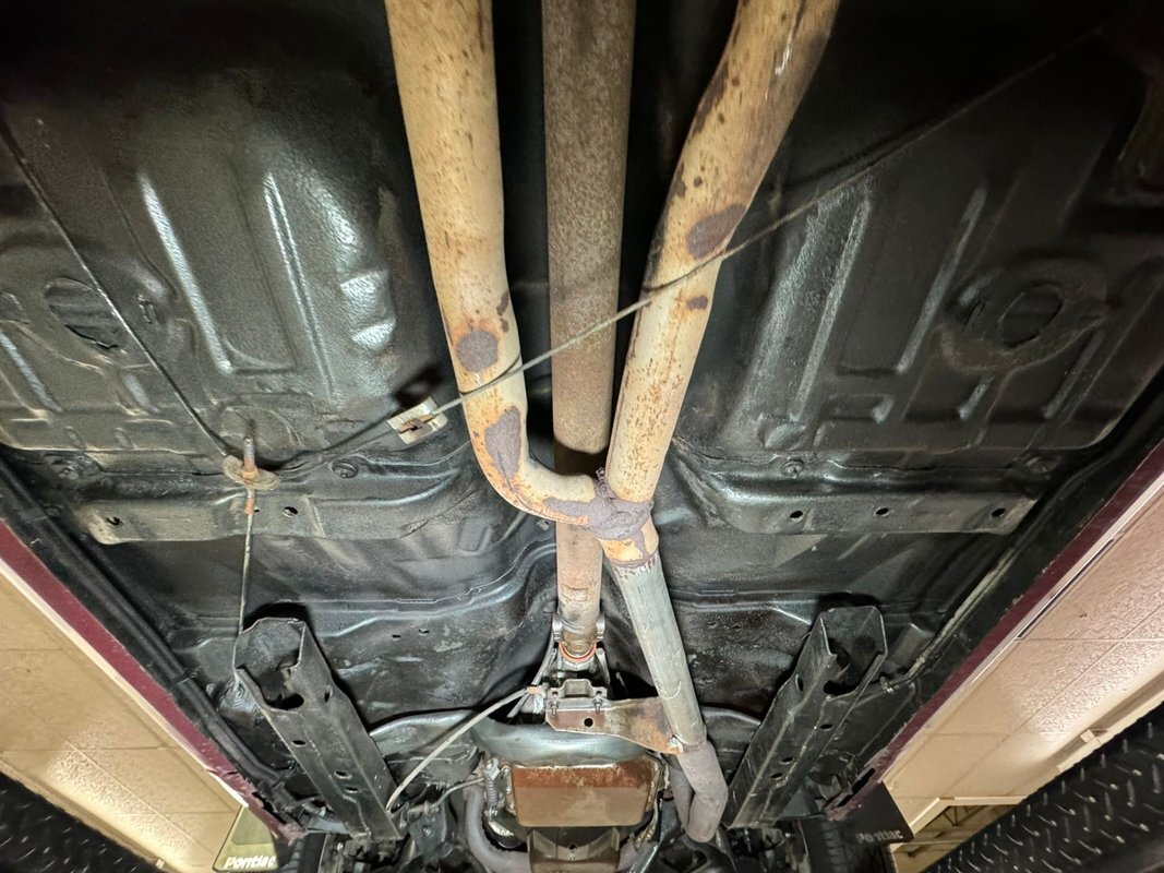 Things are relatively clean and dry underneath. The exhaust comes off the manifolds, meets at the engine and travels down a single pipe later splitting to meet a pair of Super Turbo mufflers, and then out the back where we note the chrome tips are starting to rust. Standard was independent suspension with coil springs up front and leaf springs in the back. We note that the catalytic converter has been removed.