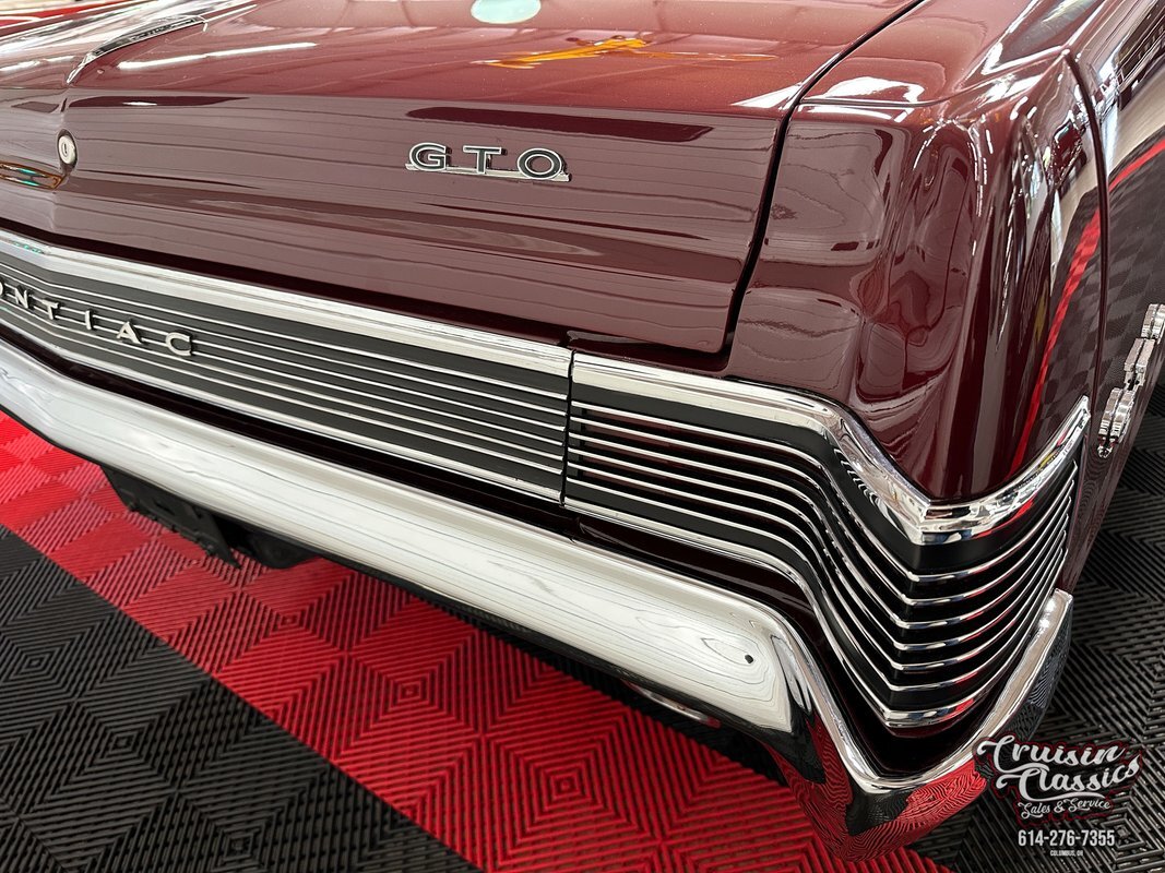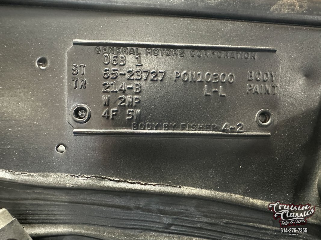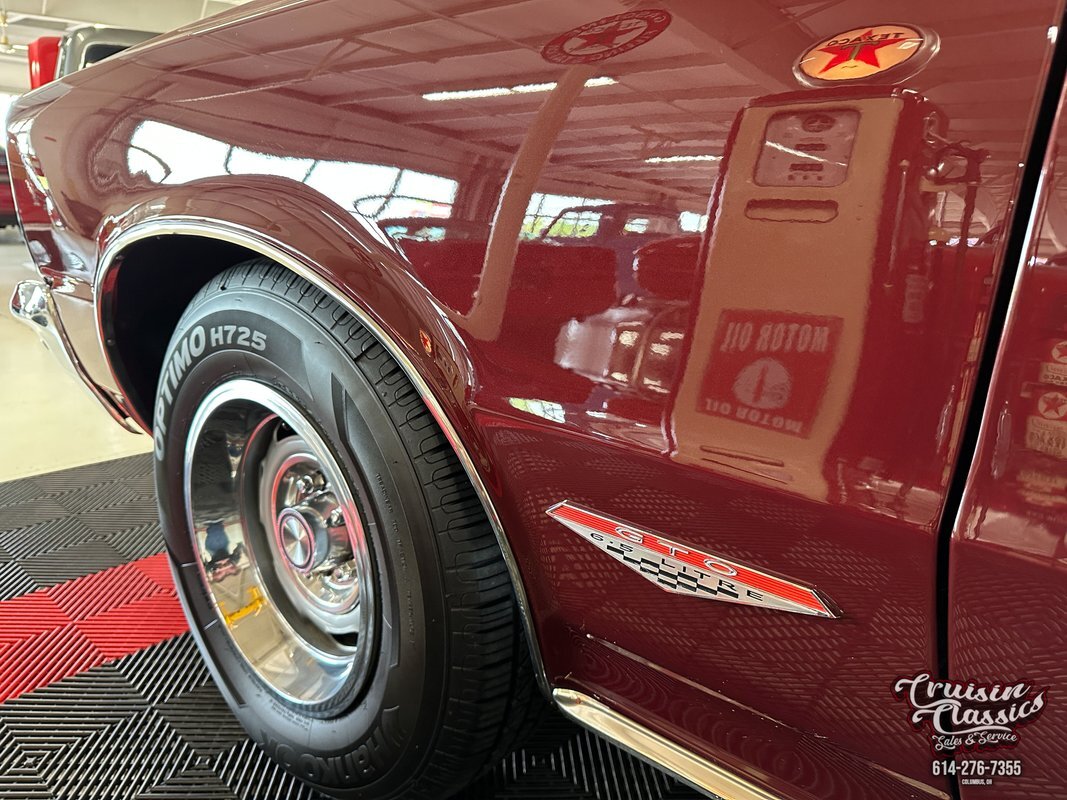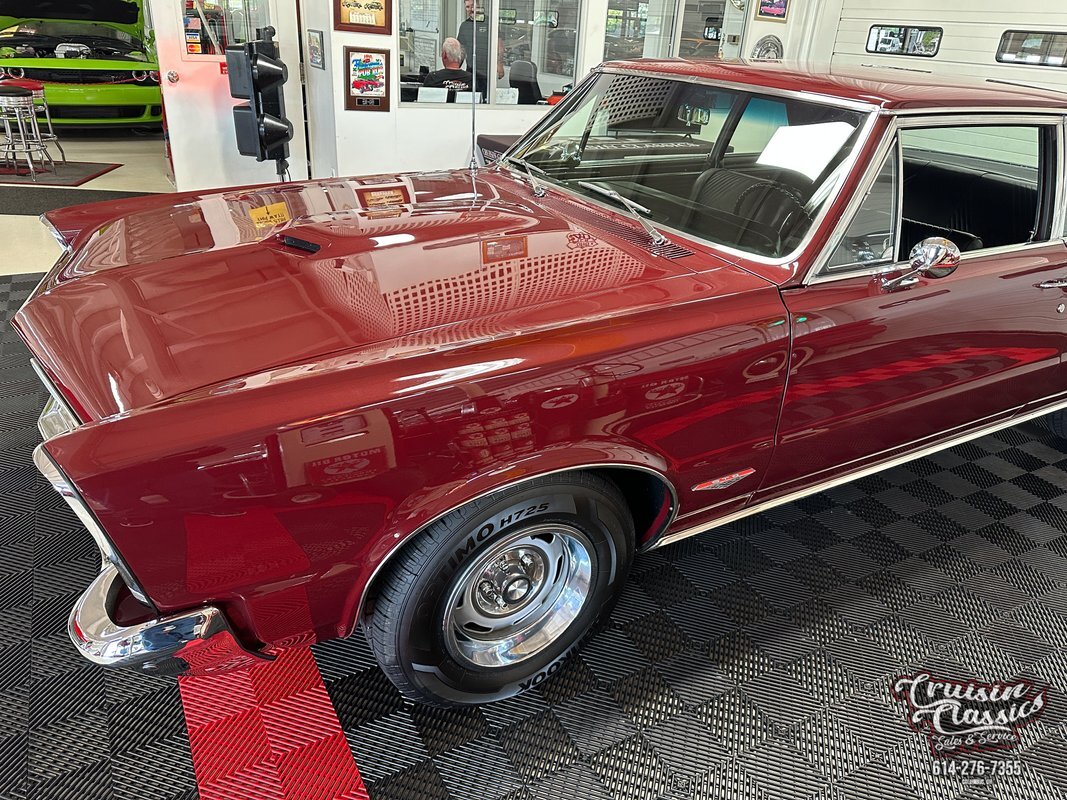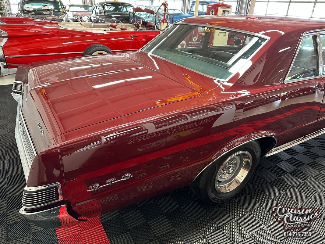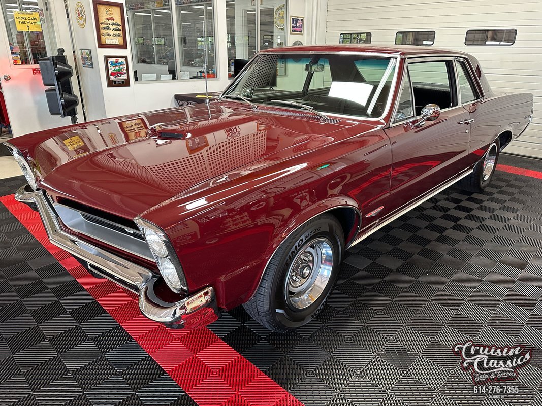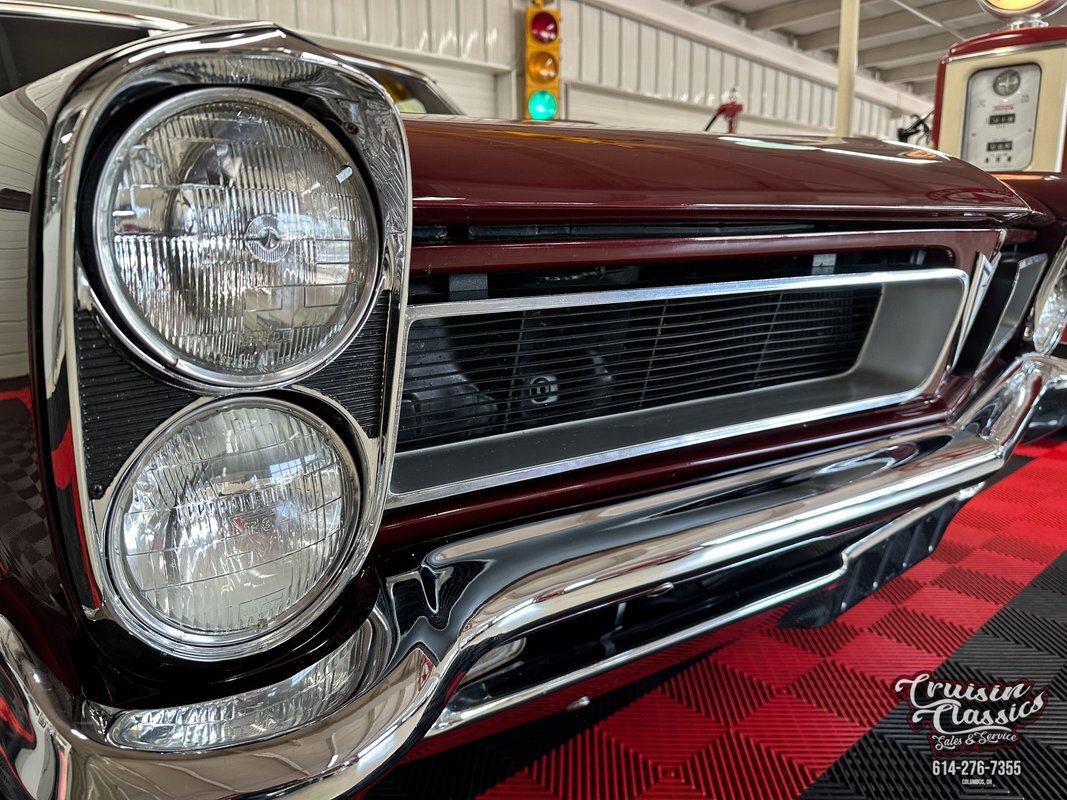 Cruisin Classics is proud to present this absolutely spectacular 1965 Pontiac LeMans “GTO Tribute”. This car started its life as a Teal Turquoise LeMans with a 326 V-8, 2 barrel carburetor, and automatic transmission, but it's a whole lot more than that now! This beauty is now dressed in a deep, glossy Burgundy Mist (PPG#50700, 1965 Pontiac color) paint job that looks fantastic at any distance. The front end is simply iconic – with vertically stacked quad headlights, a split grill with Pontiac logo at the center, and faux air vents on the hood – it looks fast sitting still. The front bumper is in excellent condition and gleams in the light, as do the headlight bezels. Great looks continue down the long laser-straight sides of the car with dual chrome side mirrors, wheel lip molding, drip rail molding, chrome rocker covers, bright window molding, and like-new GTO badges on the fenders and rear 1/4's. Around back you'll find wrap-around rear tail lights that blend into a black and chrome rear trim piece above the shining rear bumper with integrated reverse lights. The gas cap is hidden behind the rear license plate holder. This Pontiac has a great stance as it sits atop grey steel 6-slot Rally wheels with center caps and beauty rings wrapped in Hankook Optimo H725 tires. A lot has changed under the hood since this car rolled off the assembly line. The incredibly clean engine bay is now home to a freshly painted 1970 Pontiac 400ci V-8 (code XH – 350hp) topped with a correct 1965 intake and 1965 tri-power carburetors. Chrome valve covers and air cleaners add some contrast to the blue block. Exhaust flows through 1965 cast manifolds through Flowmaster 40 series mufflers to create an awesome sound. The 400 is mated to a 1968 Muncie 4-speed with a 1965 Hurst shifter that puts the power down via a 10 bolt rear with 3:08 Posi gears. Also under the hood you'll find a power steering unit, a dual resevoir for the manual brakes (disc/drum), a correct GM washer fluid bottle (not hooked up), and newer under-hood matting. When you open the drivers door the courtesy light illuminates the black OEM correct GTO interior. The door panels are both in very good condition and feature arm-rests, crank windows, carpeted bottoms, and GTO badging. The black vinyl bucket seats with Pontiac logos are very comfortable and show no wear. The back seat looks equally as nice and is flanked by arm-rests, ashtrays, and window cranks. Above is a tight black vinyl headliner and below is new looking black hook and loop carpet topped with black vinyl Pontiac floormats in the front and rear. All of the glass is excellent with no scratches or pitting. The windshield and rear window appear new while all of the sideglass has original markings. The driver is treated to an OEM 1965 Pontiac 2-spoke steering wheel with horn ring, chrome accent bands, and a Pontiac logo in the center. The correct GTO dash features a woodgrain surround for the gauge cluster and climate controls. There is a 120mph speedometer with checkered flag logo, an 8K tachometer, and gauges for oil pressure and water temp. The heater blows hot and the fan works as it should. Below the woodgrain is a ribbed chrome section with knobs for lights and wipers, a lighter, an ashtray, and a working factory AM radio. The passenger side of the dash features a grab-handle with GTO badge and a glovebox containing the original protecto-plate and owners manual. Up above are dual visors and a rear-view mirror with day/night switch and down below is a Hurst shifter with black boot and white pattern shift ball. The drivers brake, clutch, and e-brake pedals all have chrome surrounds for a sporty look. Around back you'll find a very clean trunk with a very rare “retractable” light under the lid. It can be slid out of it's holder so you can shine it directionally where you want. Also in the trunk is a vinyl mat, a factory jack, and a full spare on a rally wheel. We also have for this car a copy of the build sheet, title history, and a framed 1965 GTO color advertisement. There are a ton of GTO tribute cars out there, but there are a rare few built to this level - it is really as close as you can come to replicating a 65 GTO. This is an excellent opportunity to buy a GTO tribute that's nicer than most GTO's for a fraction of the cost! Don't let this one pass you by!