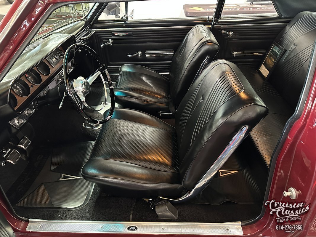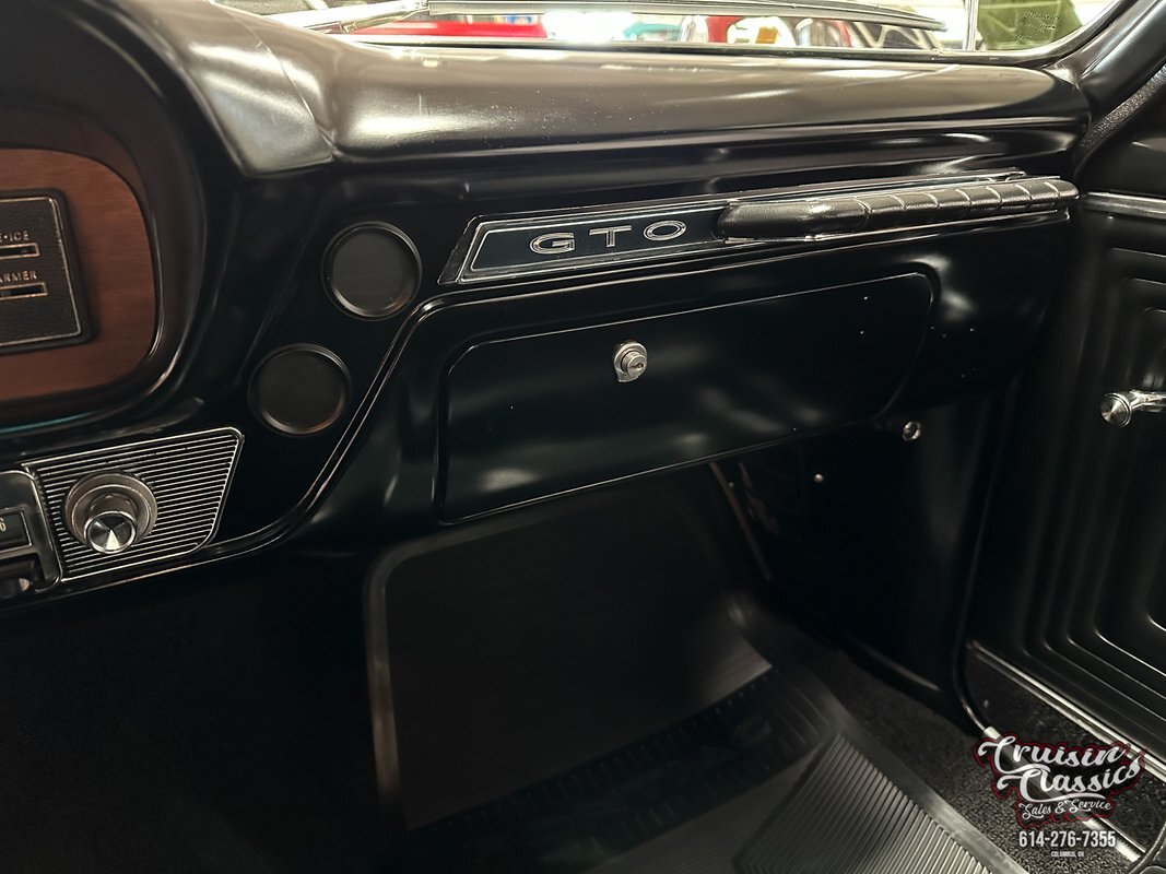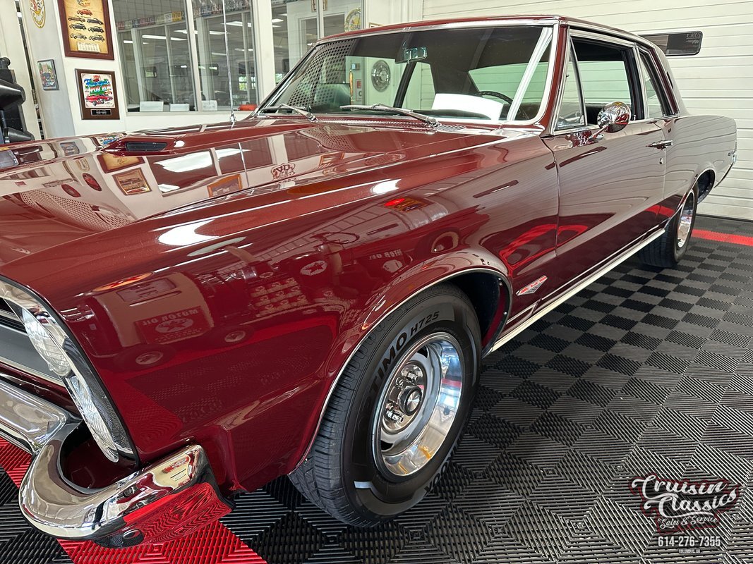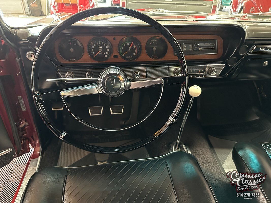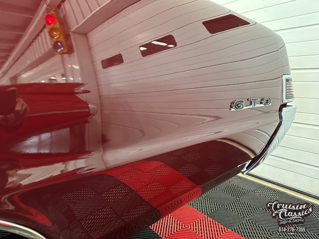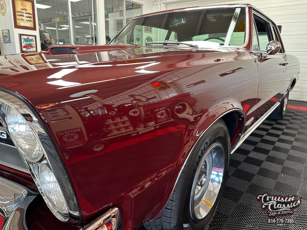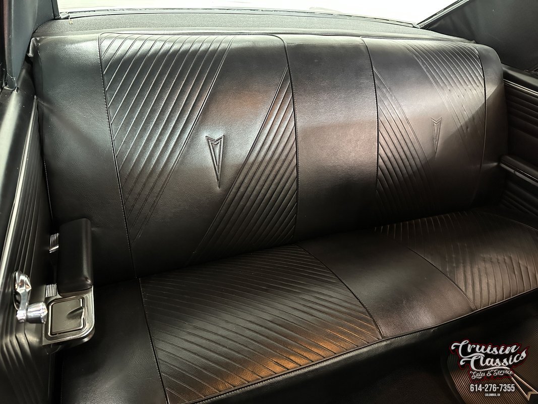 Cruisin Classics is proud to present this absolutely spectacular 1965 Pontiac LeMans “GTO Tribute”. This car started its life as a Teal Turquoise LeMans with a 326 V-8, 2 barrel carburetor, and automatic transmission, but it's a whole lot more than that now! This beauty is now dressed in a deep, glossy Burgundy Mist (PPG#50700, 1965 Pontiac color) paint job that looks fantastic at any distance. The front end is simply iconic – with vertically stacked quad headlights, a split grill with Pontiac logo at the center, and faux air vents on the hood – it looks fast sitting still. The front bumper is in excellent condition and gleams in the light, as do the headlight bezels. Great looks continue down the long laser-straight sides of the car with dual chrome side mirrors, wheel lip molding, drip rail molding, chrome rocker covers, bright window molding, and like-new GTO badges on the fenders and rear 1/4's. Around back you'll find wrap-around rear tail lights that blend into a black and chrome rear trim piece above the shining rear bumper with integrated reverse lights. The gas cap is hidden behind the rear license plate holder. This Pontiac has a great stance as it sits atop grey steel 6-slot Rally wheels with center caps and beauty rings wrapped in Hankook Optimo H725 tires. A lot has changed under the hood since this car rolled off the assembly line. The incredibly clean engine bay is now home to a freshly painted 1970 Pontiac 400ci V-8 (code XH – 350hp) topped with a correct 1965 intake and 1965 tri-power carburetors. Chrome valve covers and air cleaners add some contrast to the blue block. Exhaust flows through 1965 cast manifolds through Flowmaster 40 series mufflers to create an awesome sound. The 400 is mated to a 1968 Muncie 4-speed with a 1965 Hurst shifter that puts the power down via a 10 bolt rear with 3:08 Posi gears. Also under the hood you'll find a power steering unit, a dual resevoir for the manual brakes (disc/drum), a correct GM washer fluid bottle (not hooked up), and newer under-hood matting. When you open the drivers door the courtesy light illuminates the black OEM correct GTO interior. The door panels are both in very good condition and feature arm-rests, crank windows, carpeted bottoms, and GTO badging. The black vinyl bucket seats with Pontiac logos are very comfortable and show no wear. The back seat looks equally as nice and is flanked by arm-rests, ashtrays, and window cranks. Above is a tight black vinyl headliner and below is new looking black hook and loop carpet topped with black vinyl Pontiac floormats in the front and rear. All of the glass is excellent with no scratches or pitting. The windshield and rear window appear new while all of the sideglass has original markings. The driver is treated to an OEM 1965 Pontiac 2-spoke steering wheel with horn ring, chrome accent bands, and a Pontiac logo in the center. The correct GTO dash features a woodgrain surround for the gauge cluster and climate controls. There is a 120mph speedometer with checkered flag logo, an 8K tachometer, and gauges for oil pressure and water temp. The heater blows hot and the fan works as it should. Below the woodgrain is a ribbed chrome section with knobs for lights and wipers, a lighter, an ashtray, and a working factory AM radio. The passenger side of the dash features a grab-handle with GTO badge and a glovebox containing the original protecto-plate and owners manual. Up above are dual visors and a rear-view mirror with day/night switch and down below is a Hurst shifter with black boot and white pattern shift ball. The drivers brake, clutch, and e-brake pedals all have chrome surrounds for a sporty look. Around back you'll find a very clean trunk with a very rare “retractable” light under the lid. It can be slid out of it's holder so you can shine it directionally where you want. Also in the trunk is a vinyl mat, a factory jack, and a full spare on a rally wheel. We also have for this car a copy of the build sheet, title history, and a framed 1965 GTO color advertisement. There are a ton of GTO tribute cars out there, but there are a rare few built to this level - it is really as close as you can come to replicating a 65 GTO. This is an excellent opportunity to buy a GTO tribute that's nicer than most GTO's for a fraction of the cost! Don't let this one pass you by!