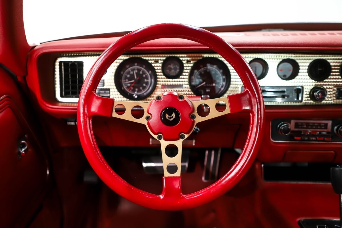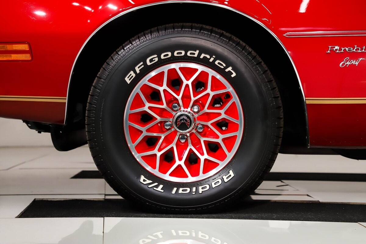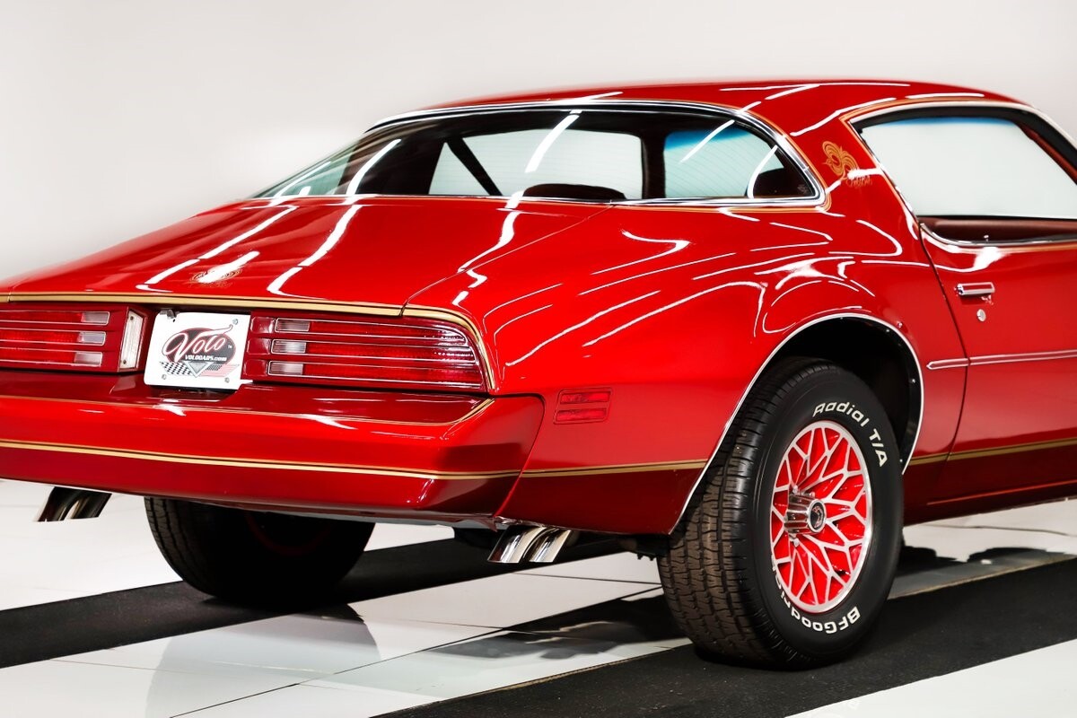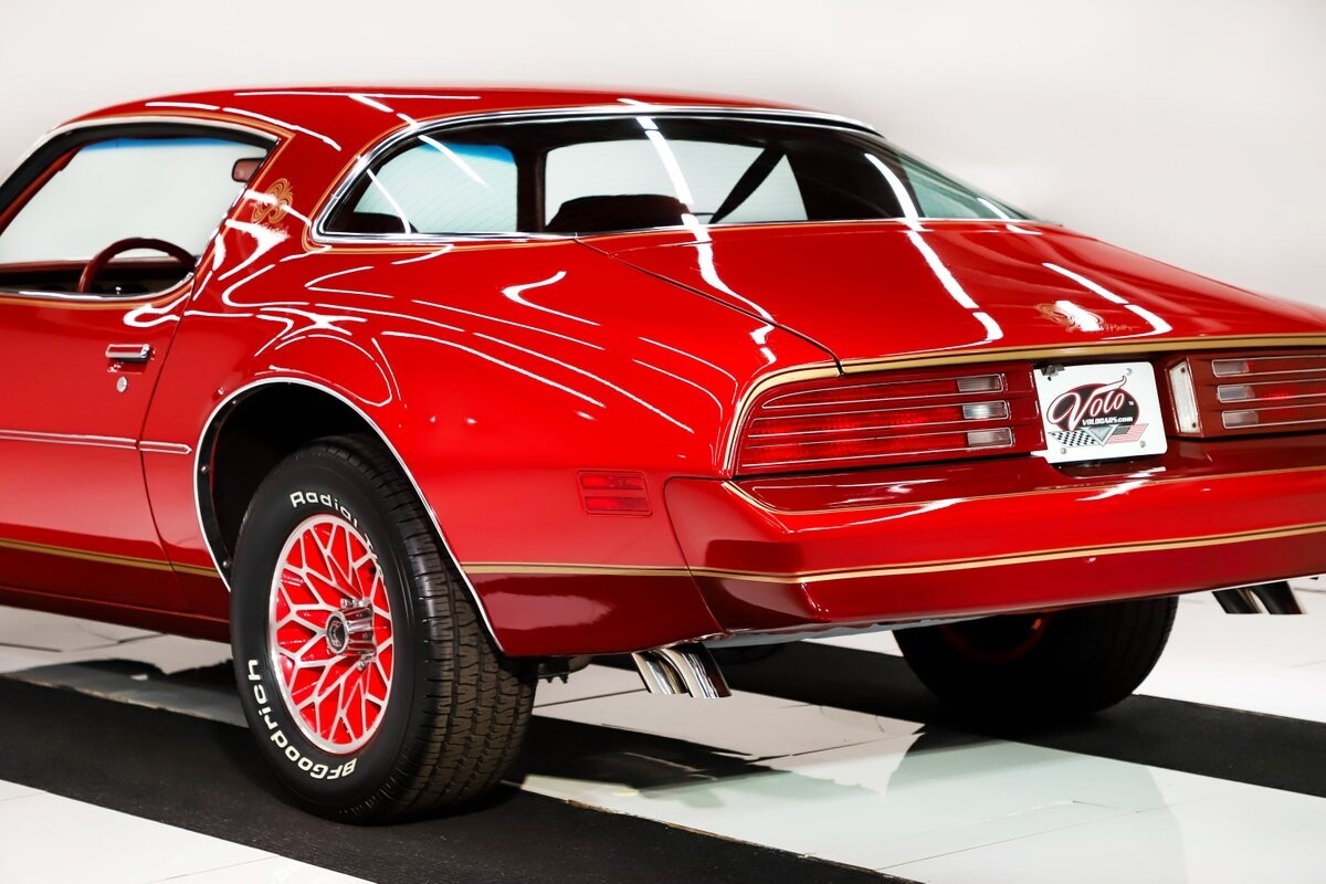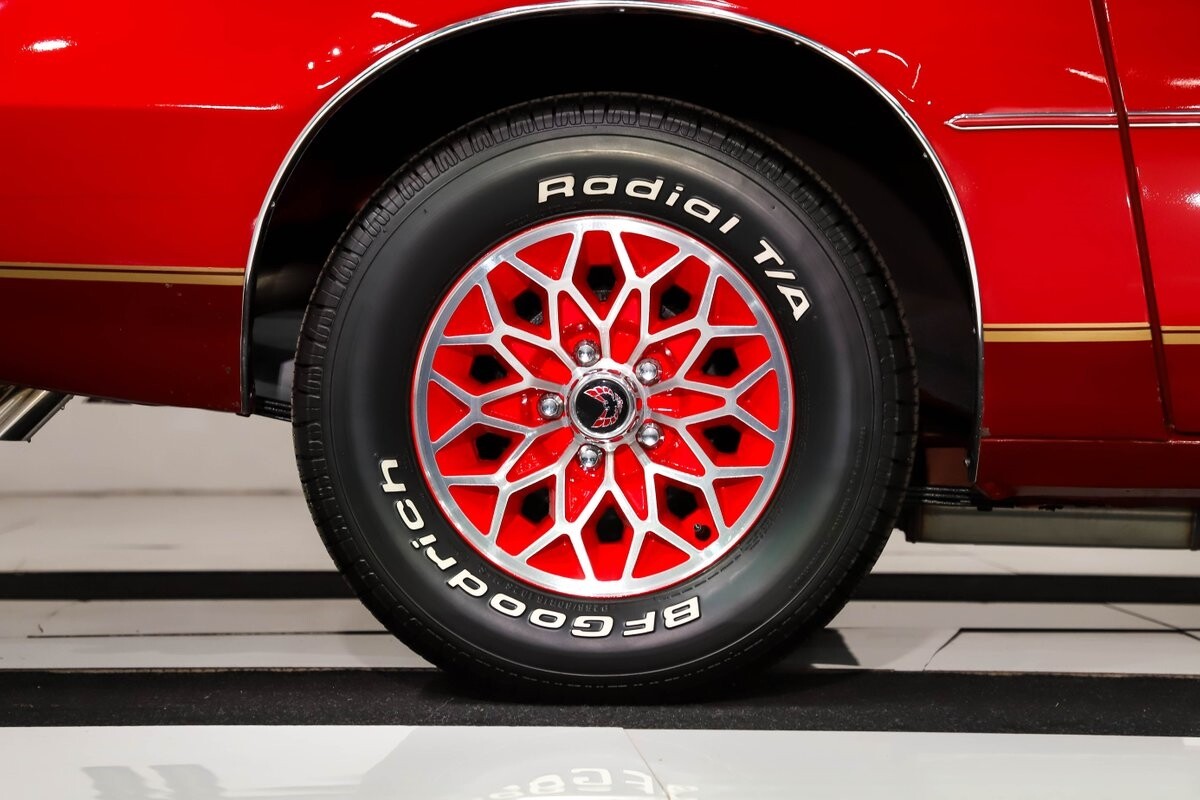 EXTERIOR: Redbird unique features: Roman Red (which wasn't available on any other 78 Firebird) with Redbird red lower accent. It also features gold striping, red grills and red snowflake wheels. The exterior of this car is great! It has all original sheet metal in place and is straight. The rubber bumpers are excellent. The doors do not sag and easily open and close like a new car. It is still wearing some original paint and some touch up. Overall, it looks beautiful, smooth, and glossy. It does have some mild checking on the 1/4s. The gold striping and graphics are in excellent shape. The original 15 inch snowflake rims have been professionally powder coated inside and out and are wrapped in virtually brand new BF Goodrich radial T/A tires. The original glass including the windshield is crystal clear. All the chrome, trim, lenses and weatherstrips are excellent. This survivor is sure to be adorned and respected by Pontiac enthusiasts wherever you go!