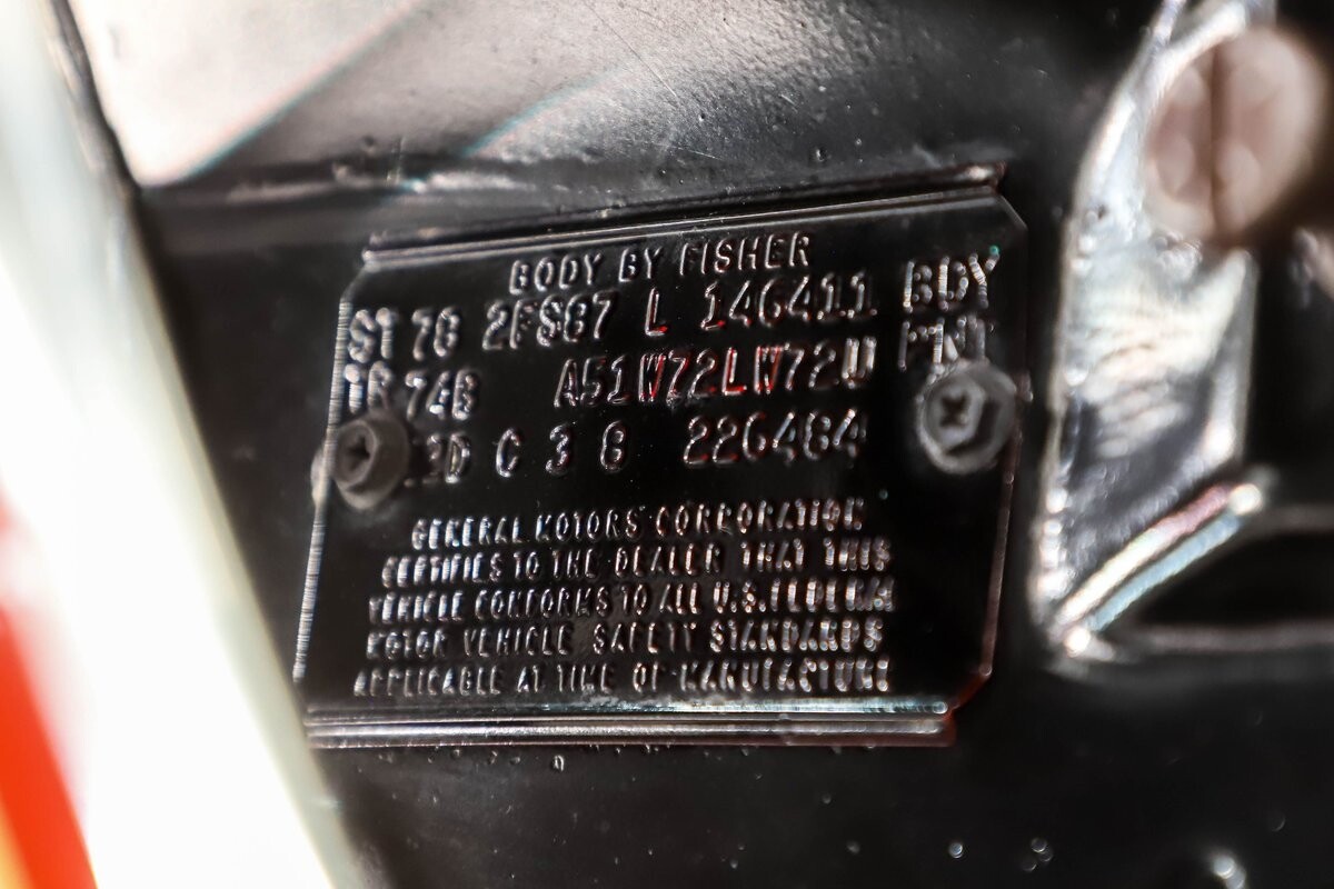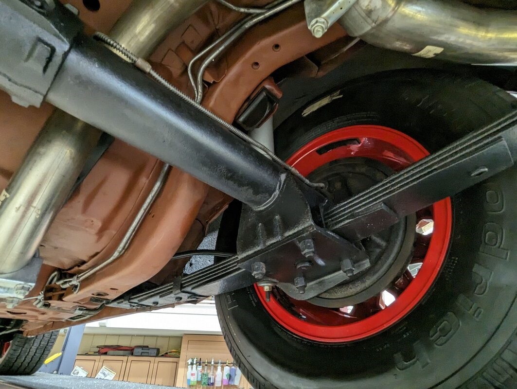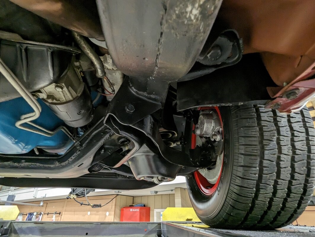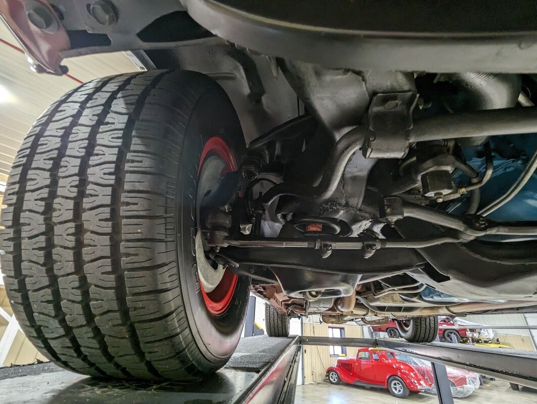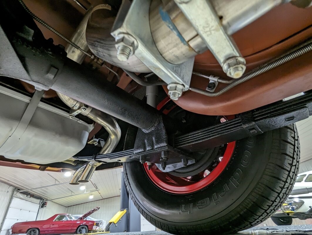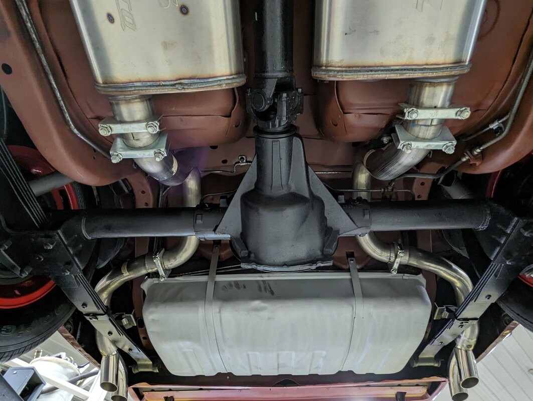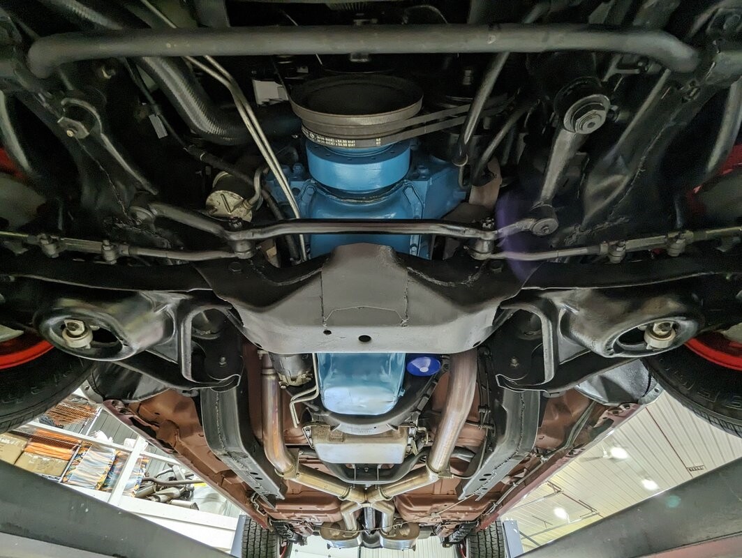 UNDERSIDE: Underneath looks like a rotisserie restoration. Actually, it is original with some maintenance and painstakingly careful detailing! All the steering and suspension is in excellent shape, the shocks have been replaced. It has disc in front, the calipers look to have been replaced. The lines and e-brake cables are clean. The exhaust system has recently been upgraded with a custom Pypes stainless dual exhaust that has an x-pipe and Turbo Pro mufflers. The exhaust exits behind the rear wheels through a pair of chrome splitter exhaust tips. The gas tank and fuel lines have a fresh look to them. Looking up at the motor and everything looks sharp with crisp blue paint and no visible leaks. The Turbo 350 transmission looks fantastic with no leaks as well. The 10 bolt rear end looks great with smooth black paint applied. The frame is solid and has been freshened up with satin black paint. The floors are solid and rust free, they were carefully freshened with a coat of factory style red oxide primer. What a great looking mostly original underbody!