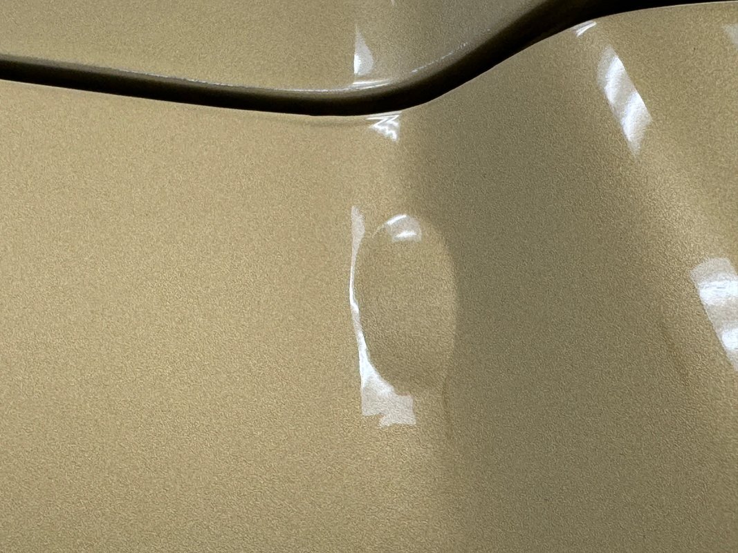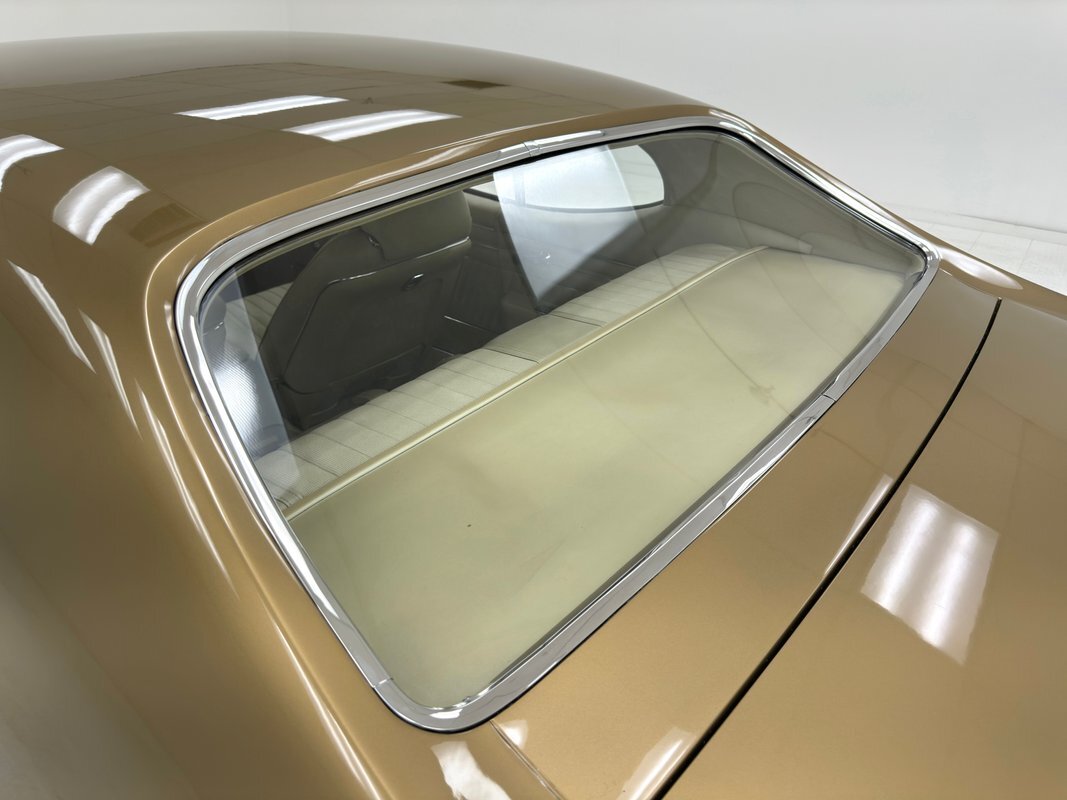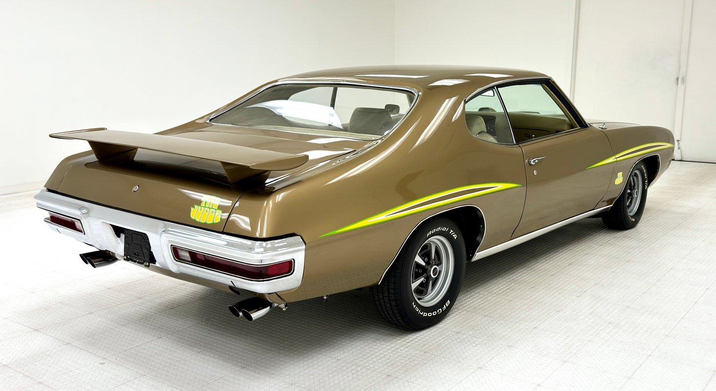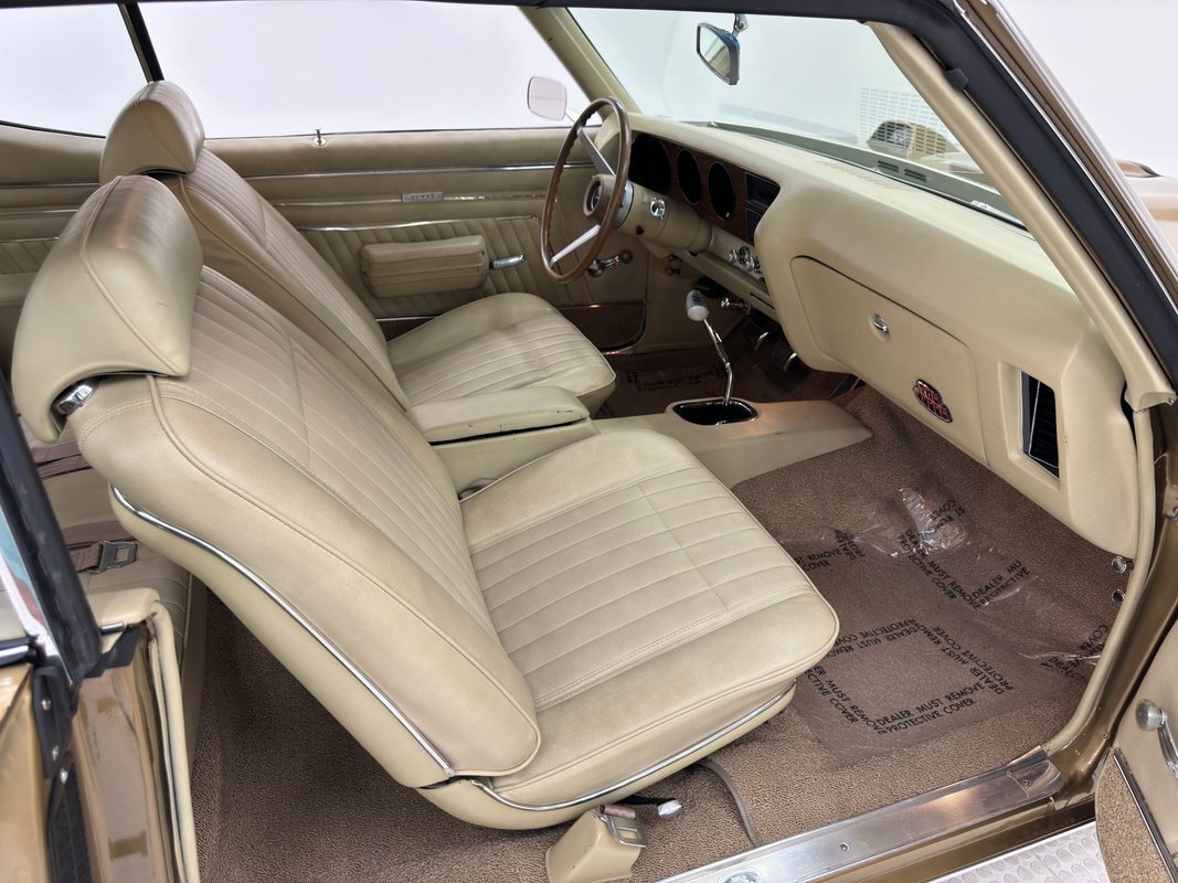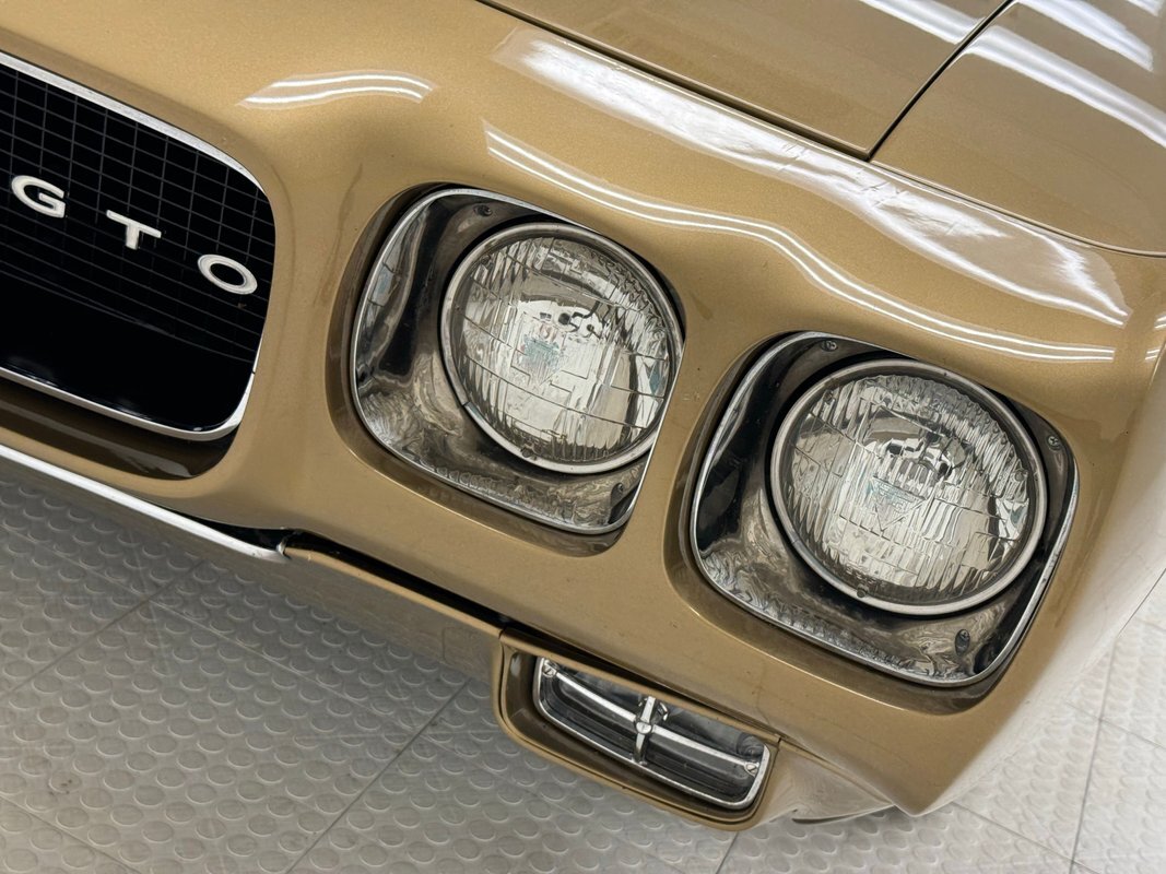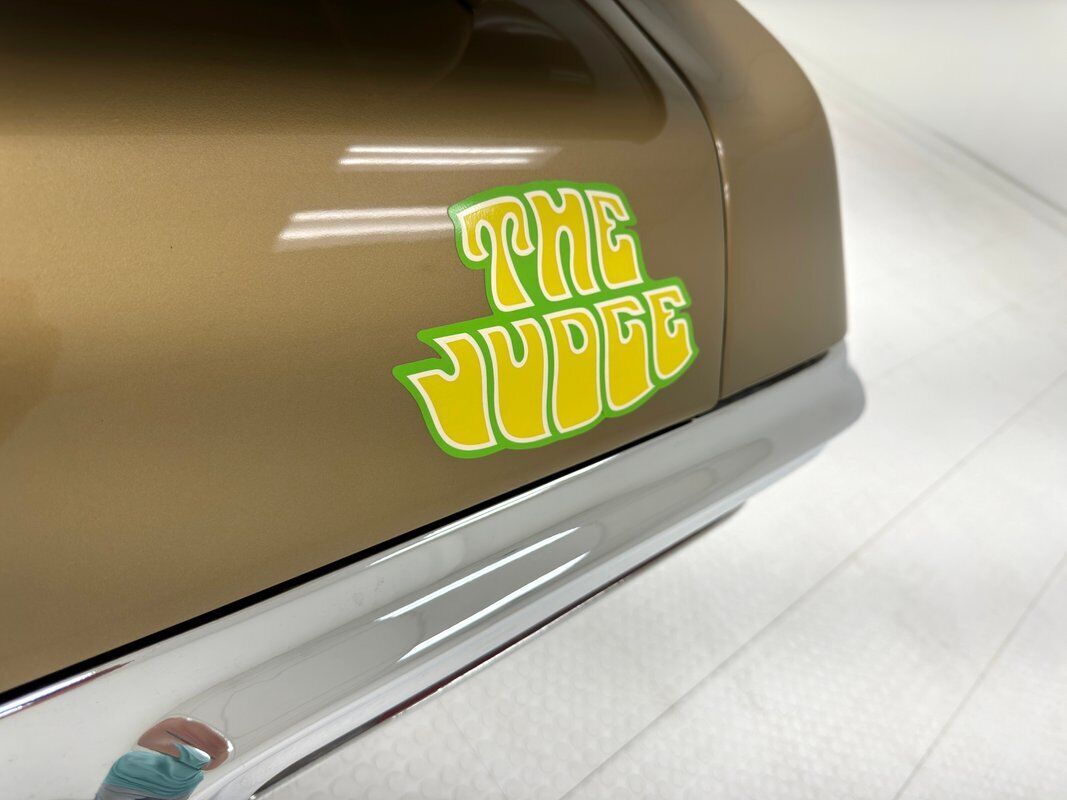 Now in two stage paint, Granada Gold adorns our car and has tinges of bronze and green undertones, which is likely why Pontiac selected green and yellow graphics for the decals that include Judge stripes along the fender side and cartoonish "The Judge" graphics on the front quarter panels and decklid. Coming straight at you, it's pure GTO with black tipped Ram Air nostrils and optional hood mounted tach, easily one of the most iconic exterior features from the muscle car era. The big rear wing is impressive as well and looks like it was borrowed from a Cessna, mounted over a chrome bumper with integrated taillights and twin splitter exhaust tips spitting fumed and singing tunes out back. 14-inch Rally II wheels carry 225/70R14 tires and wear the PMD branded center caps. Metalwork included the bumpers, trim, rocker panel, and hardware is in great condition and so is the paint with some imperfections we note. Long scratches exist on the lower body, a few paint bubbles in a curved section of the body, some wavy paint, and a rough edge on the decal at the driver's door gap.