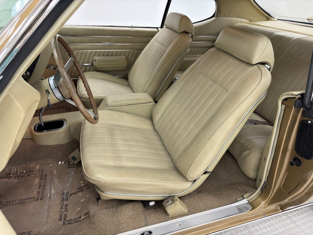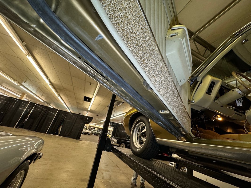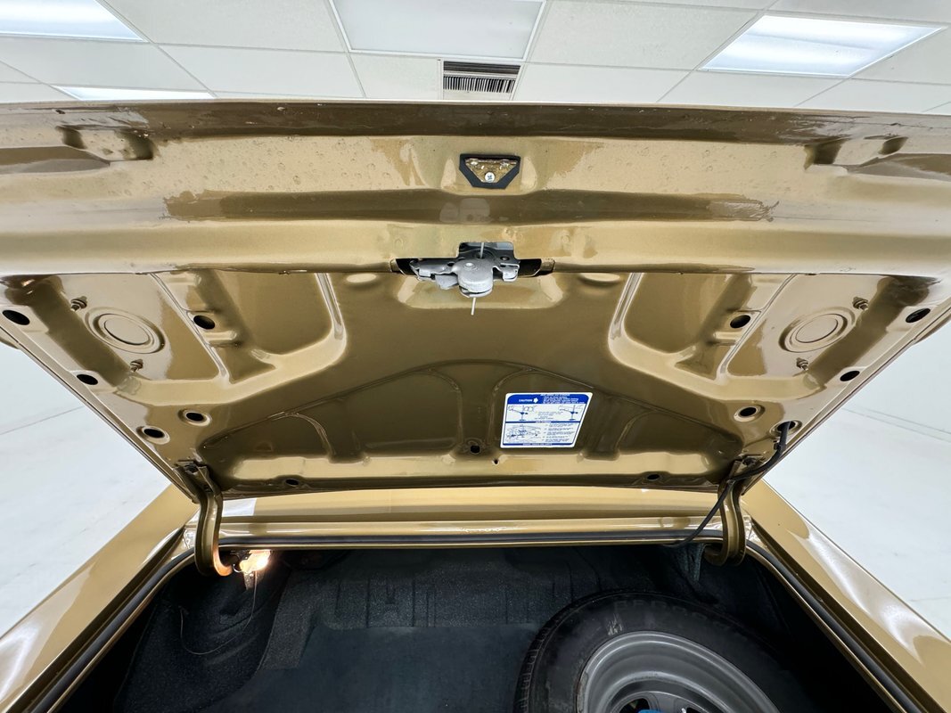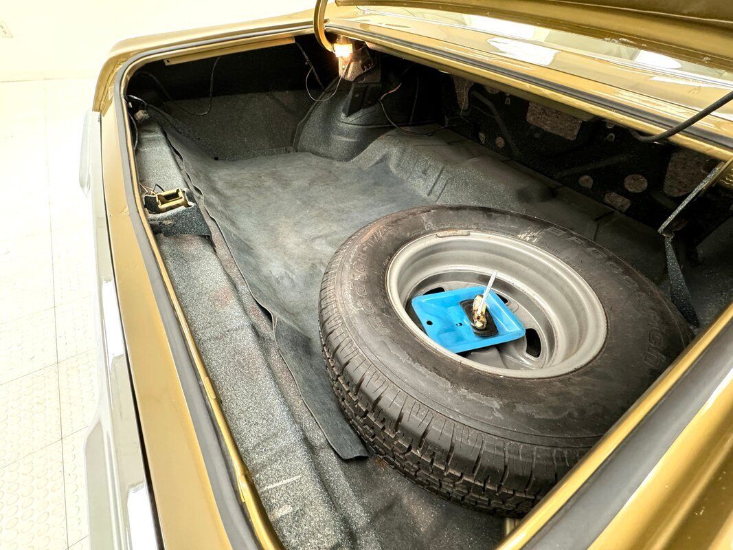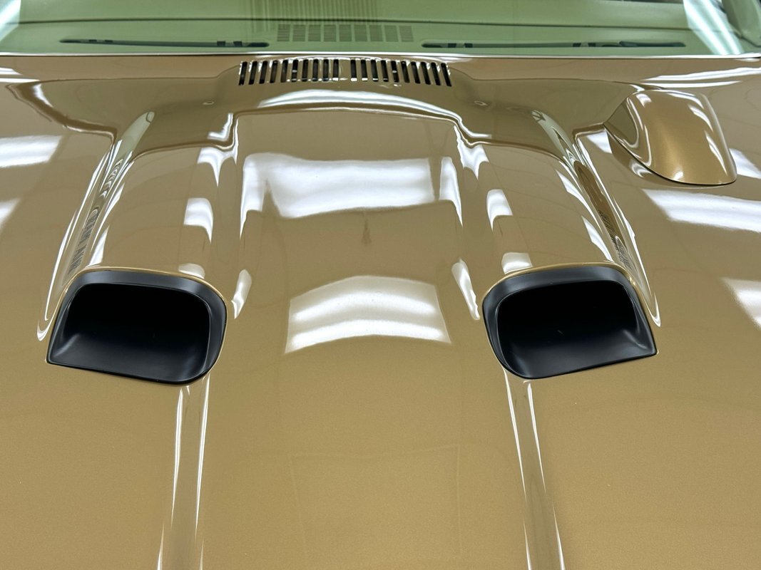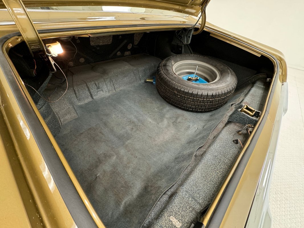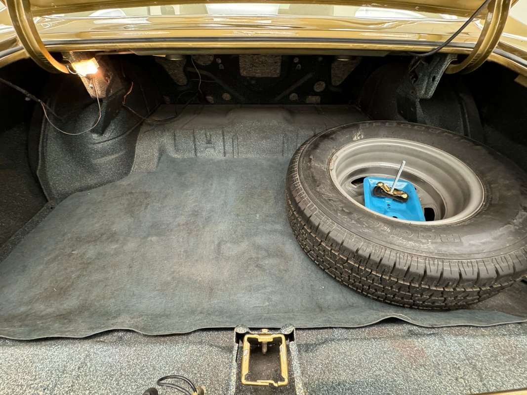 The Sandalwood interior starts with a beautifully designed and sculpted door panel with chrome trim, a slanted stitch insert and gold carpeted lower. The front bucket seats consist of vinyl construction, a plastic shell, and a fitted headrest and appear in excellent condition. Same goes for the rear bench and its three sets of brown seat belts and matching sidewall decor. The hard molded plastic steering wheel is rimmed in texturized brown with a plastic PMD center cap and three metal spokes. Warm faux wood applique surrounds the gauge cluster inside the sandalwood dashboard and surround three gauges over a turned metal band below. An AM radio and vent controls take up the middle section and the entire dash looks factory fresh including the passenger's side where a sandalwood glove box wears the coveted Judge badge. A very simple center console consists of a gaping abyss that houses the T-handle Hurst shifter and an armrest bin cover, showing a bit of wear with scratches, just about the only thing in the interior that distracts from the near mint condition. Gold loop carpet is the ideal choice for this car while the perforated sandalwood headliner and adherent shoulder harnesses are in great condition. A gray mat covers most of the trunk which is otherwise clean and contains a spare tire and jack.