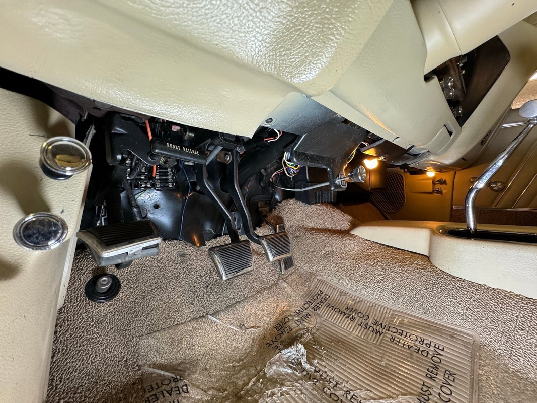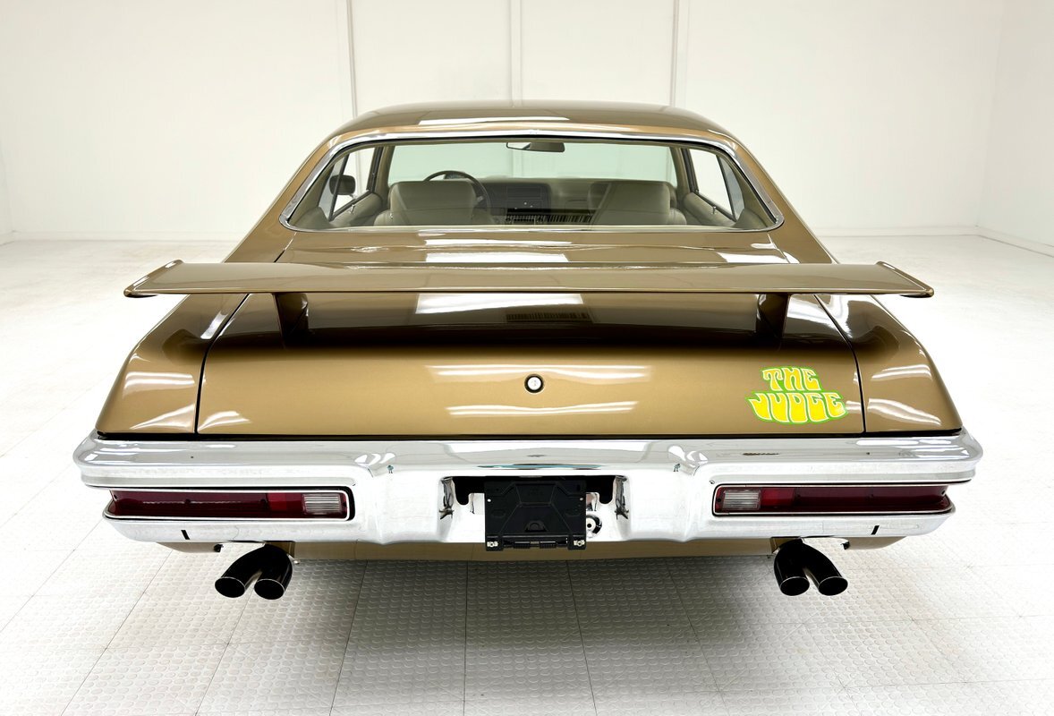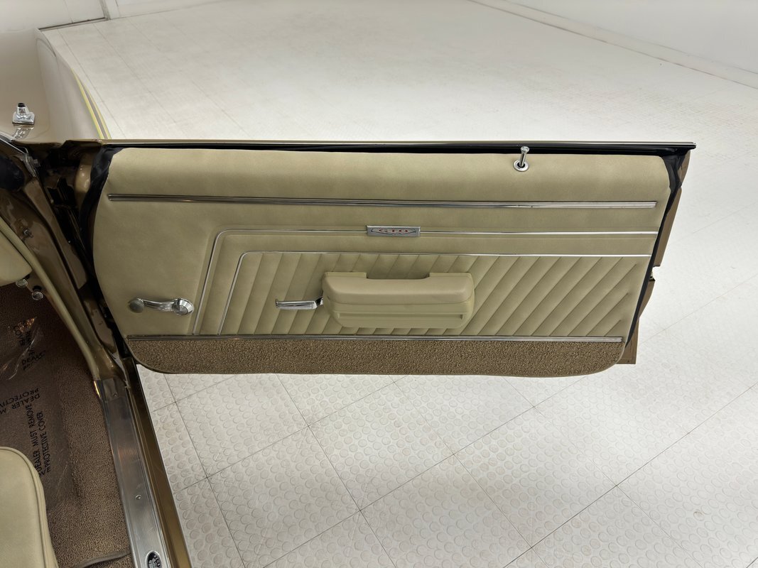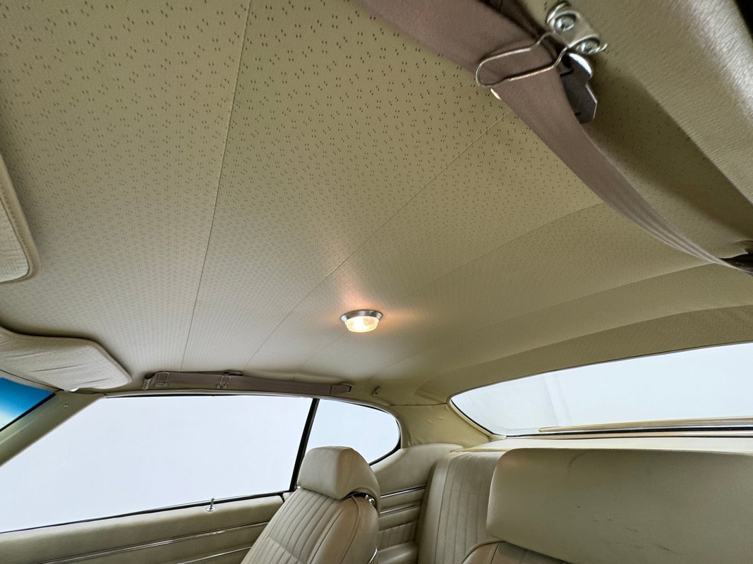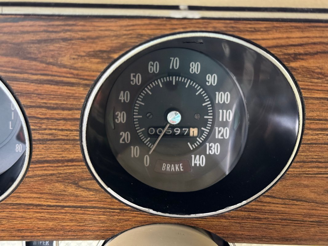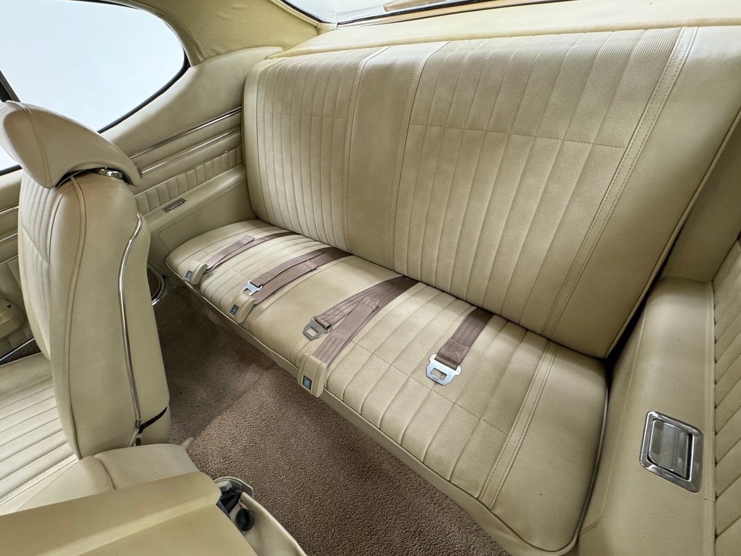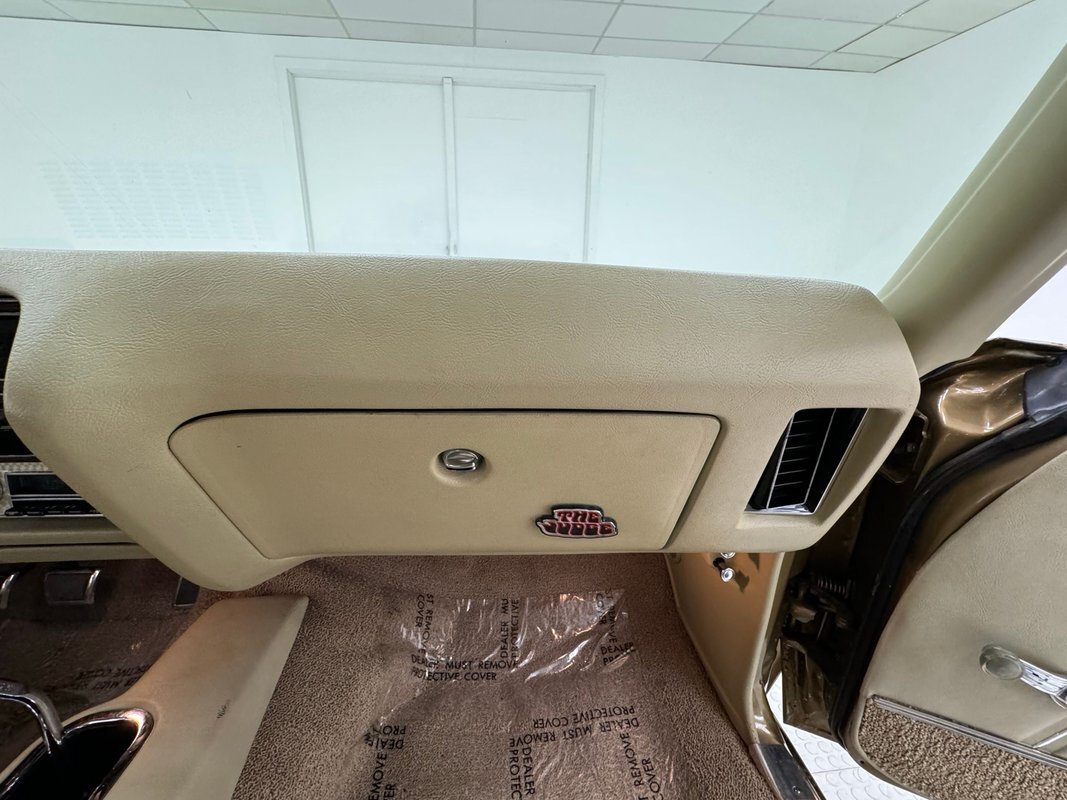 The Sandalwood interior starts with a beautifully designed and sculpted door panel with chrome trim, a slanted stitch insert and gold carpeted lower. The front bucket seats consist of vinyl construction, a plastic shell, and a fitted headrest and appear in excellent condition. Same goes for the rear bench and its three sets of brown seat belts and matching sidewall decor. The hard molded plastic steering wheel is rimmed in texturized brown with a plastic PMD center cap and three metal spokes. Warm faux wood applique surrounds the gauge cluster inside the sandalwood dashboard and surround three gauges over a turned metal band below. An AM radio and vent controls take up the middle section and the entire dash looks factory fresh including the passenger's side where a sandalwood glove box wears the coveted Judge badge. A very simple center console consists of a gaping abyss that houses the T-handle Hurst shifter and an armrest bin cover, showing a bit of wear with scratches, just about the only thing in the interior that distracts from the near mint condition. Gold loop carpet is the ideal choice for this car while the perforated sandalwood headliner and adherent shoulder harnesses are in great condition. A gray mat covers most of the trunk which is otherwise clean and contains a spare tire and jack.