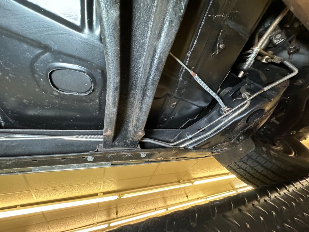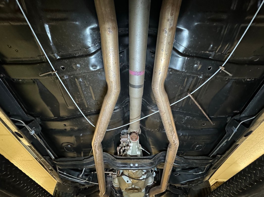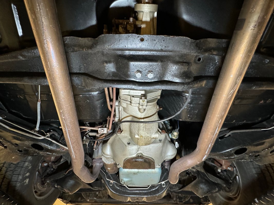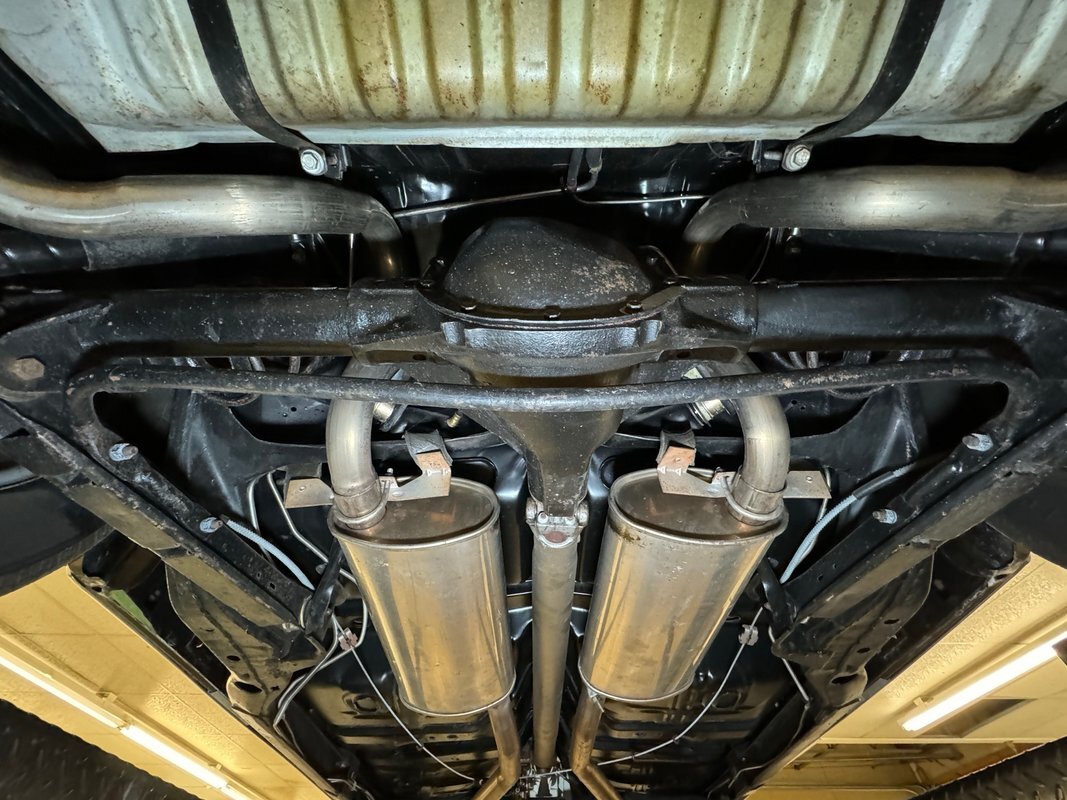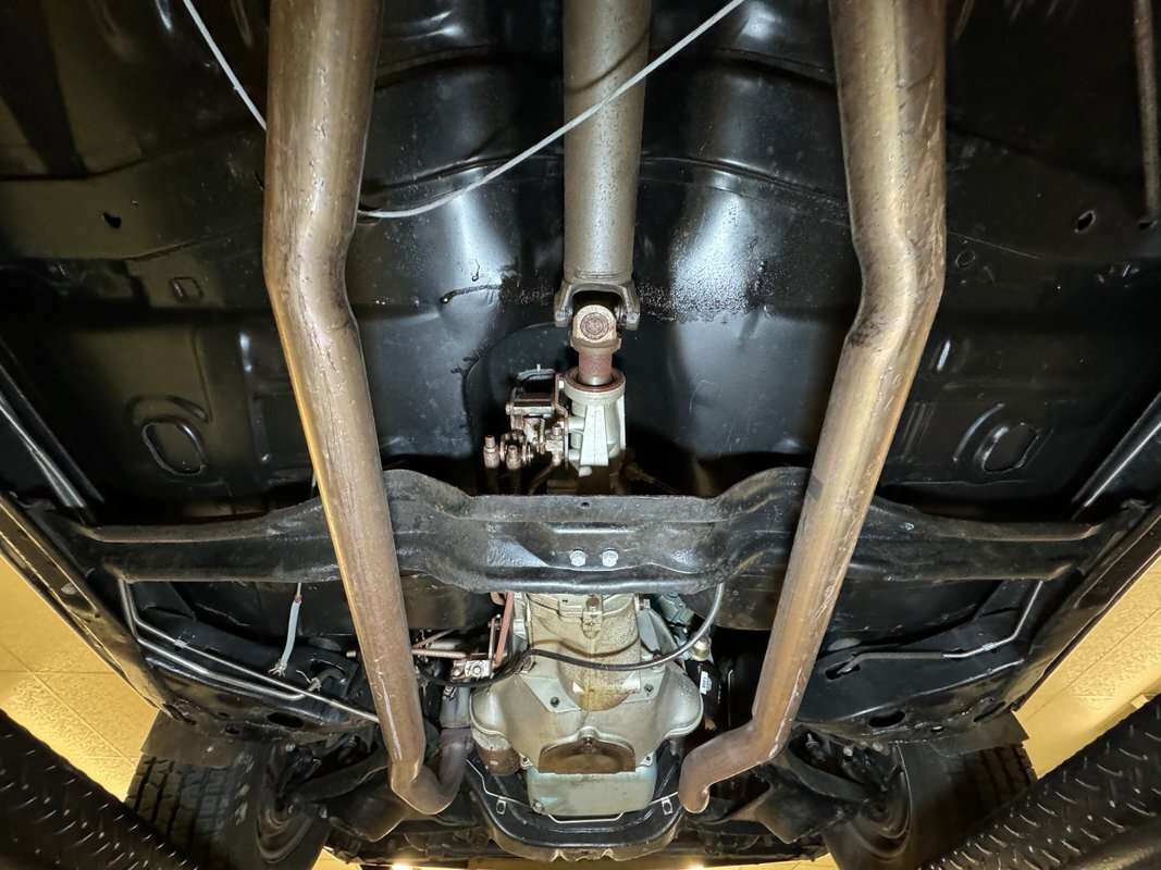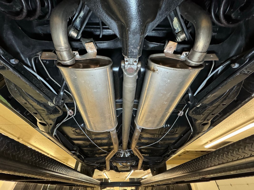 The clean underside is highlighted by the dual exhaust which includes a pair of stainless steel mufflers before snaking its way around the axle and out the back. There are sporadic spots of surface rust but very little, and no signs of leaks. Satin black paint covers most of the underside and presents cleanly. The suspension includes coil springs on the independent front and a 4 link with coil springs in the rear.