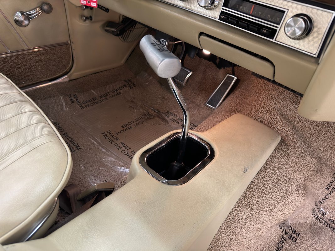 A date and stamping code correct but not original 400 cubic inch L74 Ram Air III V8 is show ready under the hood and is rated at a ground pounding 366 horsepower and fed by a correct Rochester Quadrajet 4-barrel carburetor. The numbers matching Muncie M20 4-speed manual backs the engine up and sends power to a non original 10-bolt axle with 3.55 gears and correct Saf-T-Track. Power disc brakes up front control the speed and are backed by power drums in the rear.