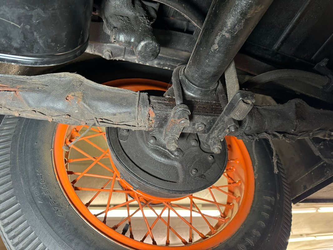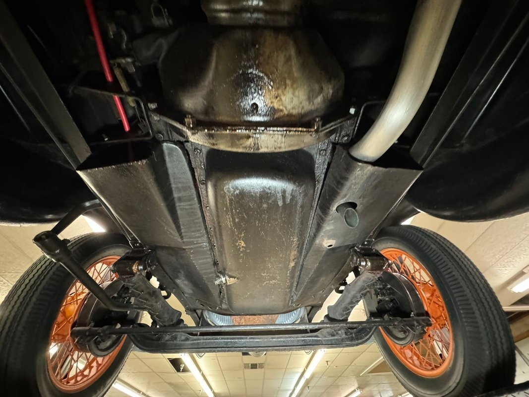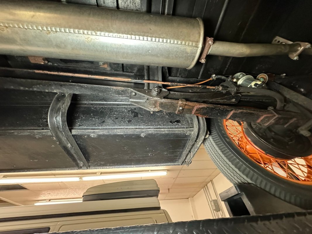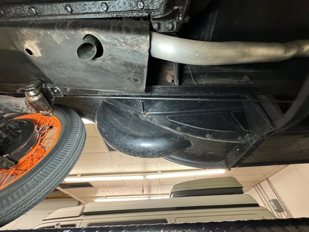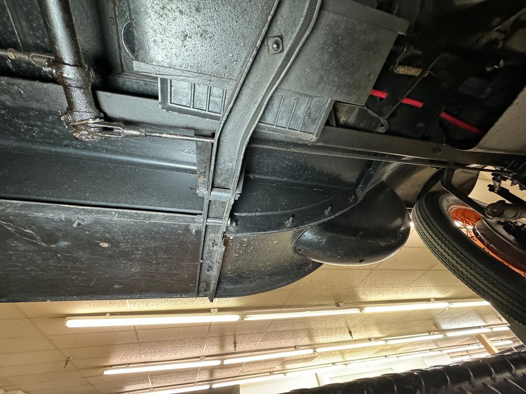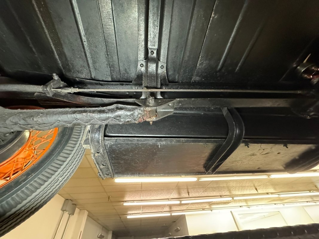 All these years of storage have been good for this car as we see black painted rust free framing and floor pans. No road dirt and a like new exhaust system. Body hangers are solid and running board bottoms are also rust free. Leaf springs provide the ride and mechanical drum brakes are on all 4 corners.