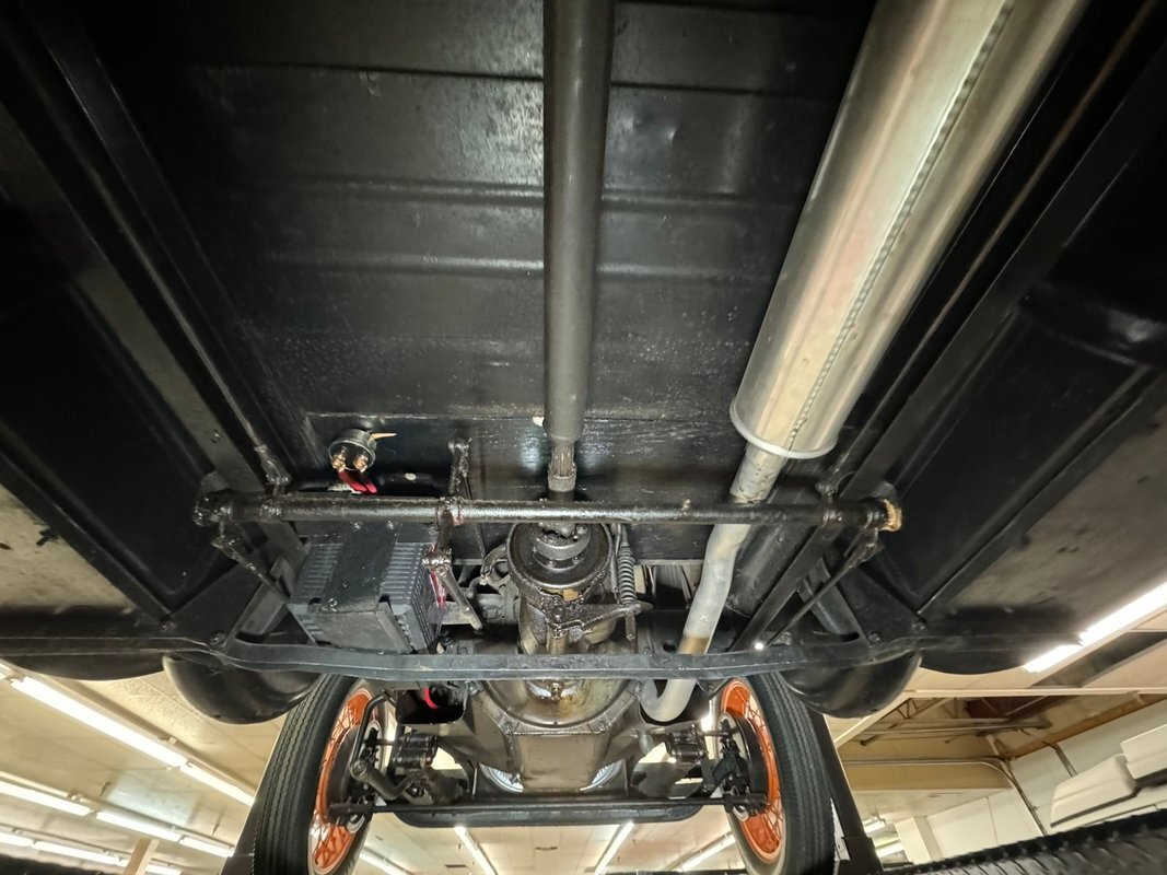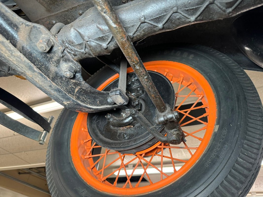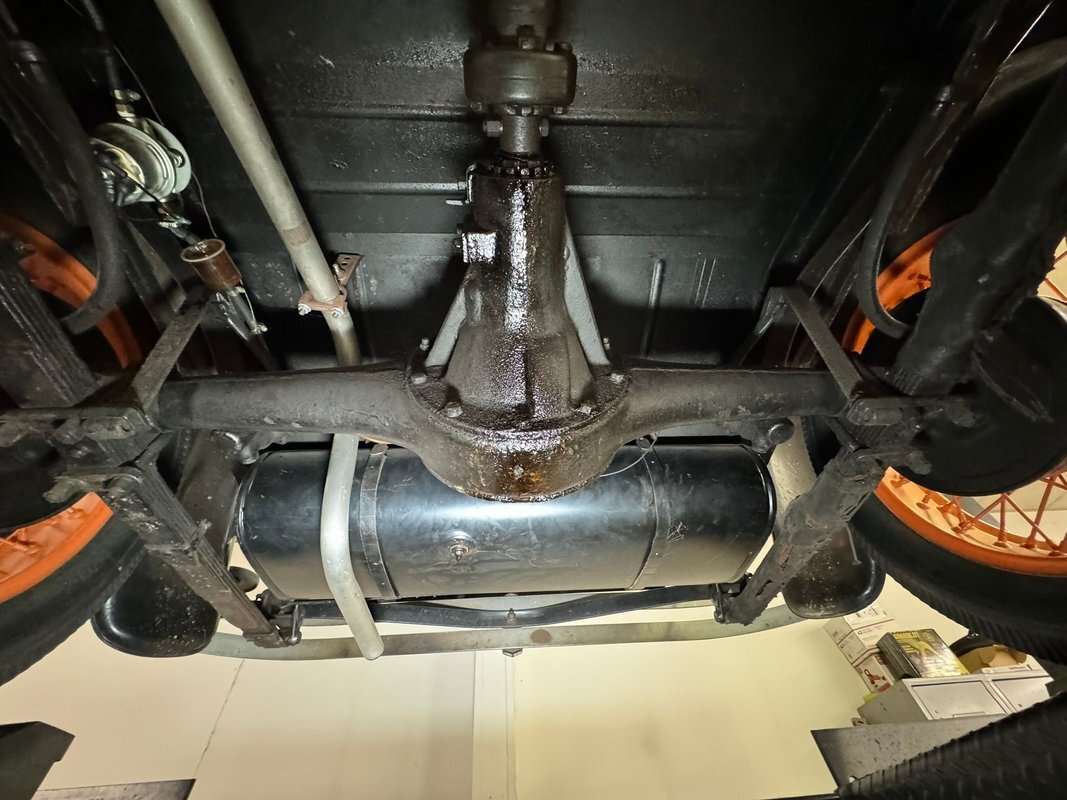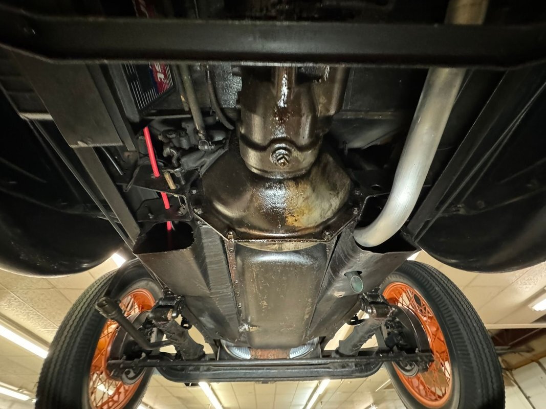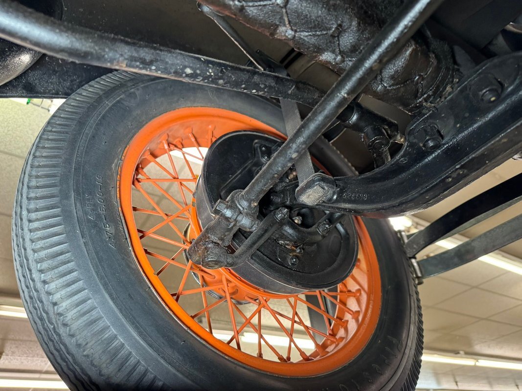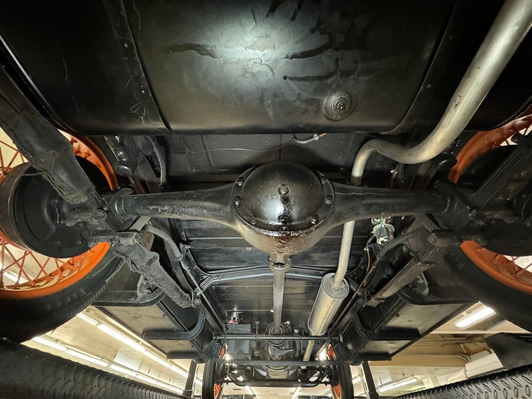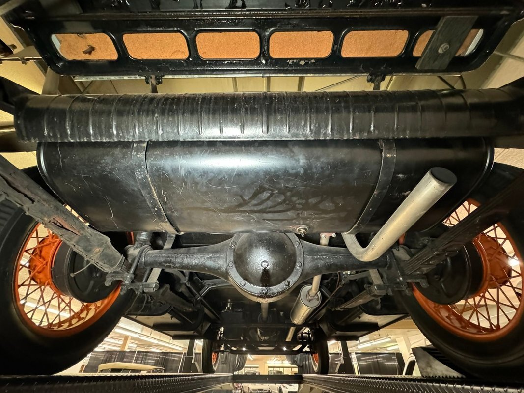 All these years of storage have been good for this car as we see black painted rust free framing and floor pans. No road dirt and a like new exhaust system. Body hangers are solid and running board bottoms are also rust free. Leaf springs provide the ride and mechanical drum brakes are on all 4 corners.