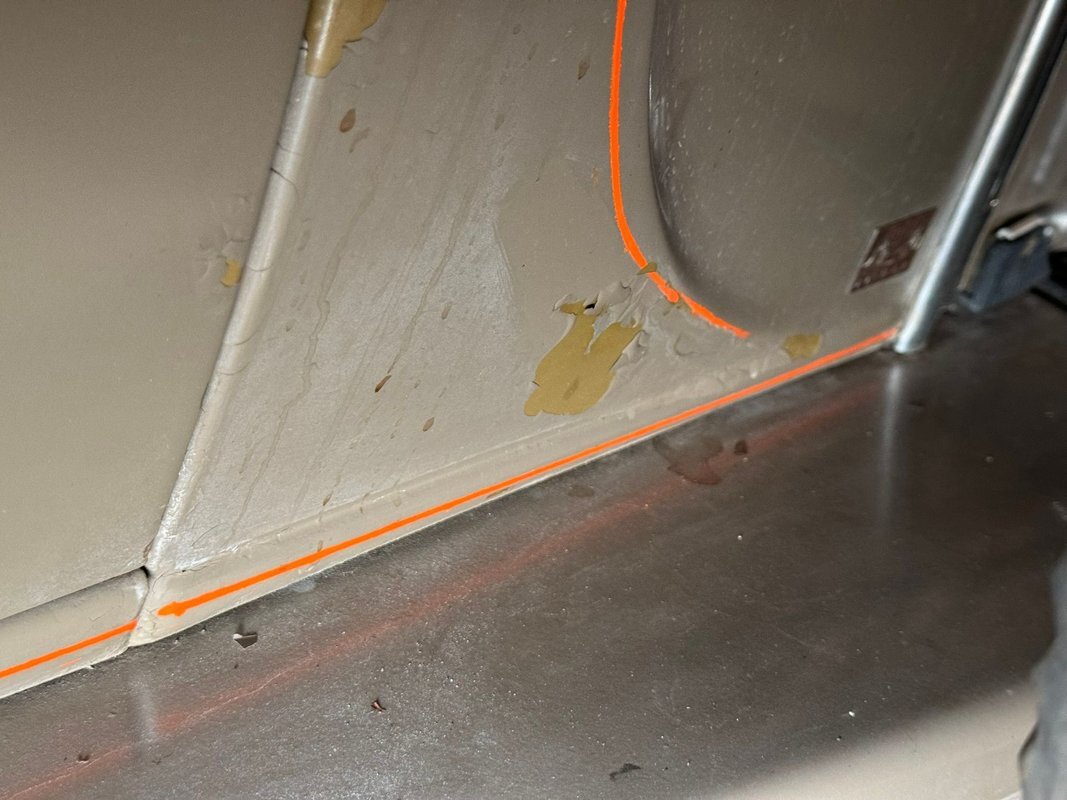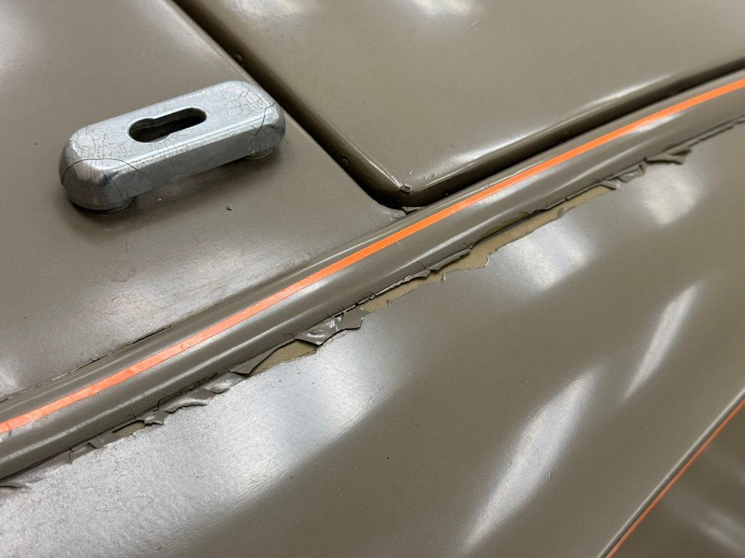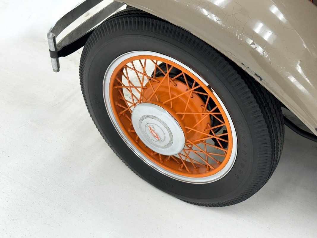 All steel mostly rust free is painted with Pilgrim Gray over a brown base coating. As with the design of most cars of the era, it has floating side fenders connected by a running board. These frame orange painted wire wheels which also have a spare on each side tucked into the front fender. A shiny radiator surround is looking good with its Pontiac chief radiator cap. Large chromed headlights flank the radiator on either side. Below, a dual bar bumper frames the bottom. A long cowled hood has some accenting side pinstripes on the vents on the side cowls. The paint shows some areas of chip off, cracking can crazing, and some opening in the edges near seams. A neat little 2 door coupe with a tan canvas convertible top which shows some minor water damage and has chromed landau bars on each side. A nice oval glass window is in the black and this leads our eye to the curved rumble seat with a large body matching trunk mounted to the back of the car just above the rear bumper. All glass is looking good and the car has straight body panels and nicely minded gaps despite the chip off and damage to the paint.