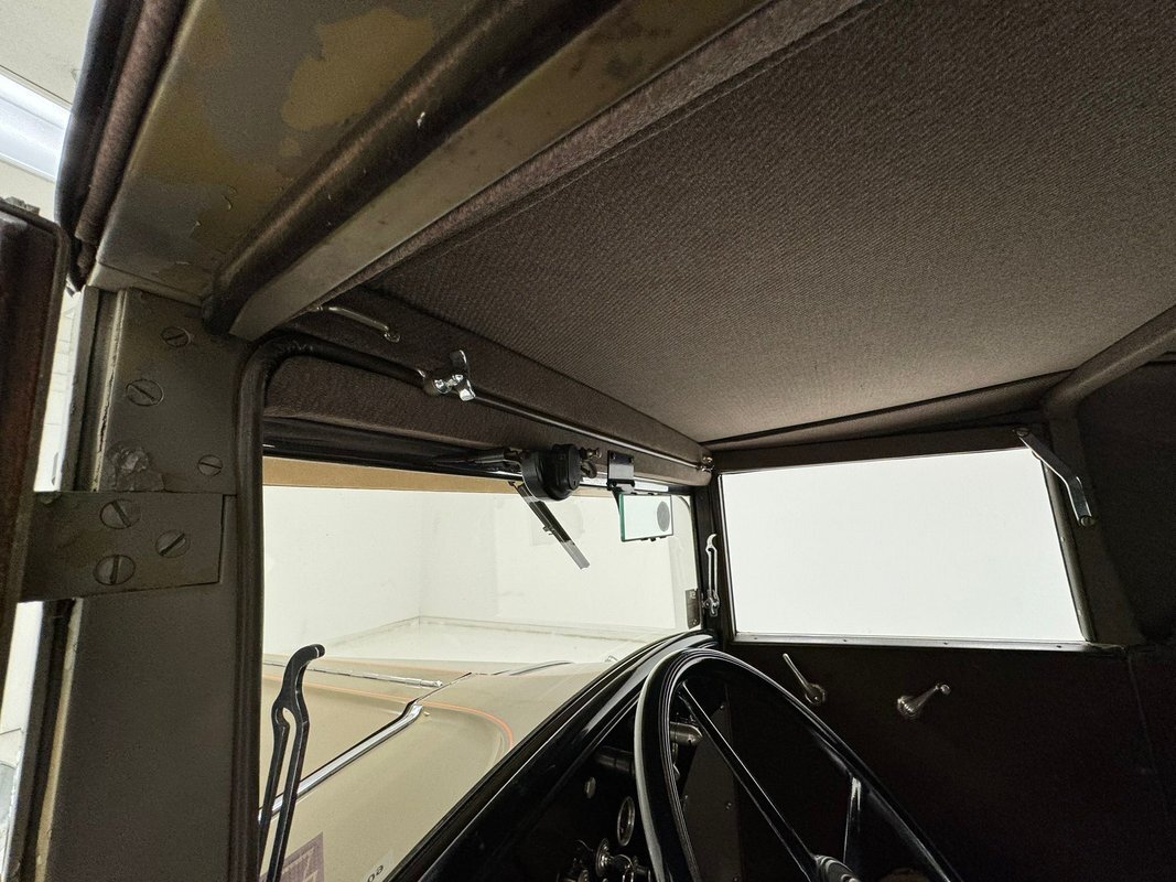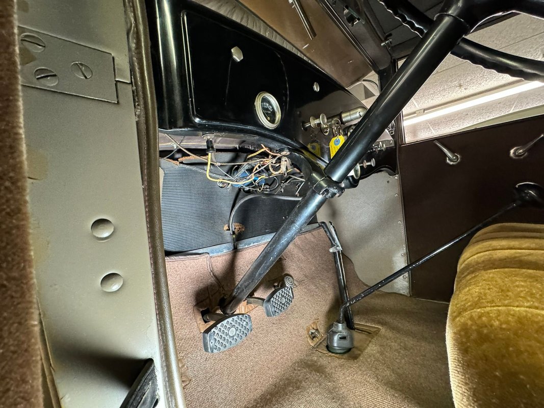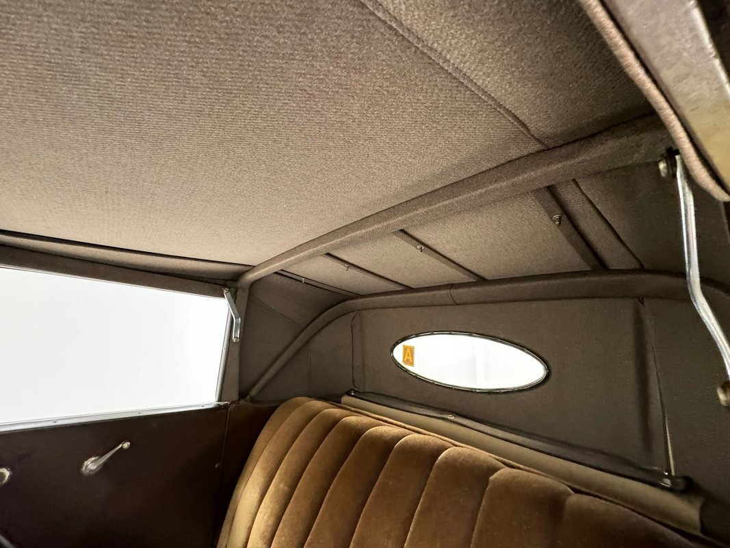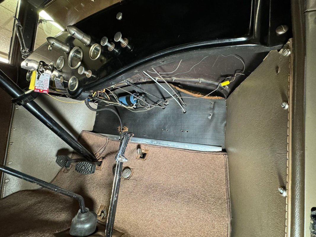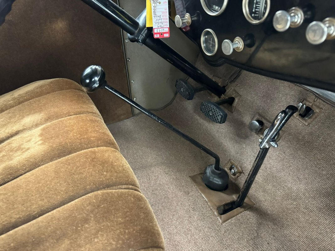 Brown velour covers the simple square door panels which have slightly dulled actuators and cranks. Inside, a large brown velour overstuffed bench has wide tuck and roll inserts and its sits in a brown velour tub. Upfront, the dash shows its factory black paint and has round gauges in blackface and white lettering and a few night lights to illuminate the gauges. Below is brown carpeting covering the floors and it's clean and not faded, looking fairly new. A large bakelite steering wheel fronts the dash, and a long armed shifter reaches for the driver. Above the inside of the canvas top is a brown corduroy and it too is looking very good. The rumble seat is black vinyl and also has some tuck and roll in its seat and back.