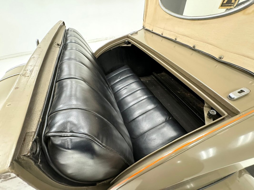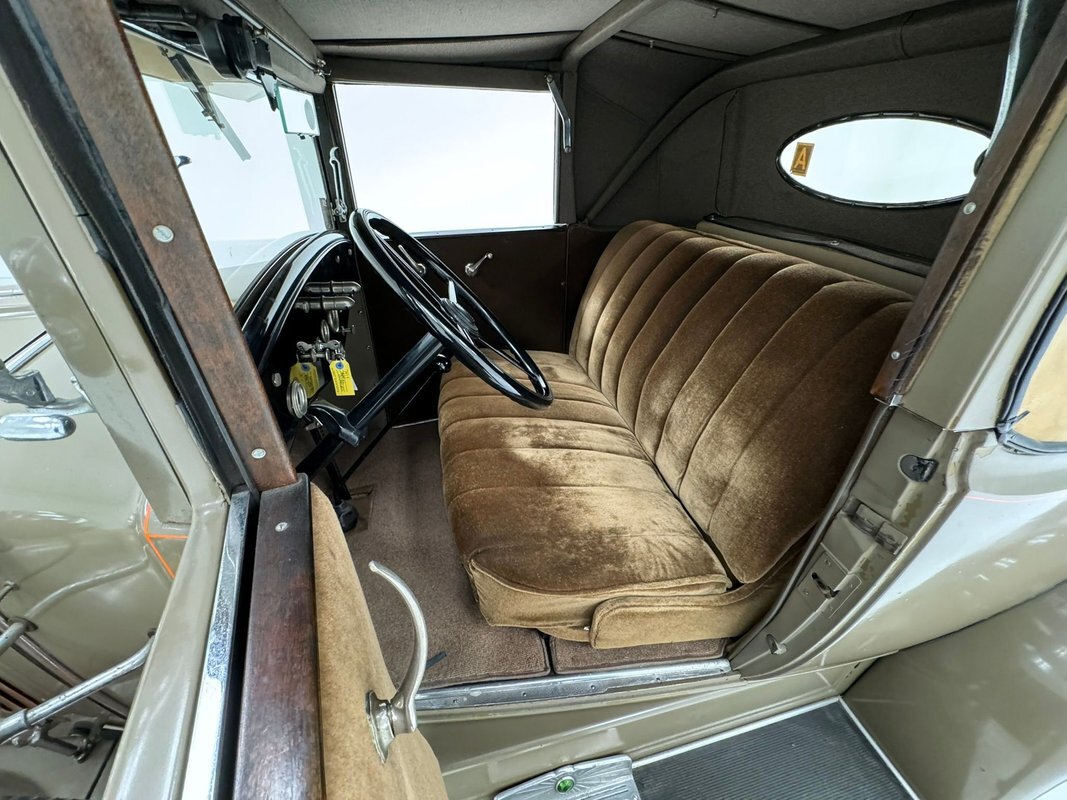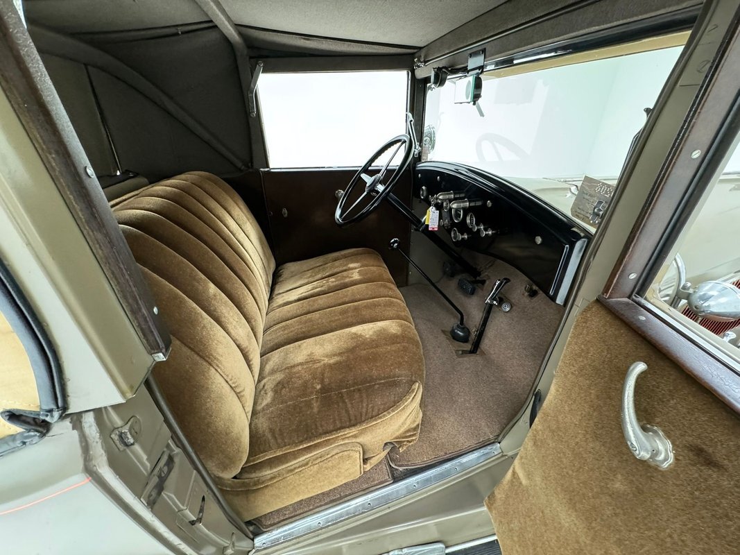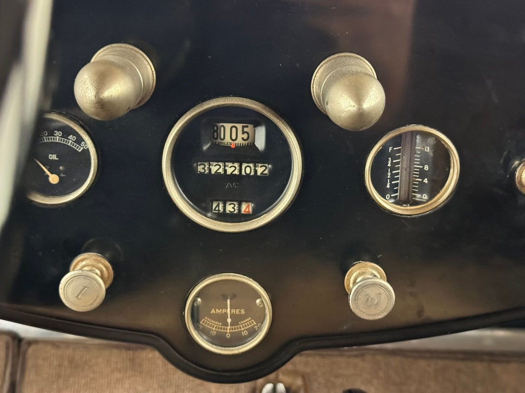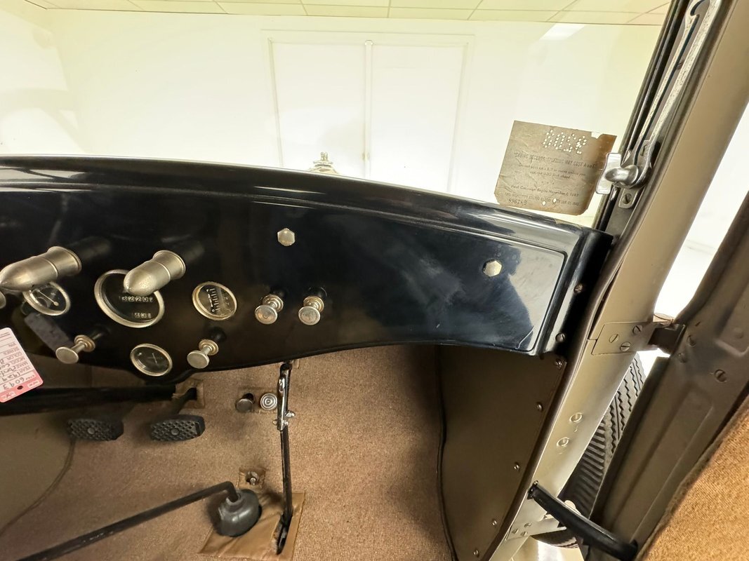 Brown velour covers the simple square door panels which have slightly dulled actuators and cranks. Inside, a large brown velour overstuffed bench has wide tuck and roll inserts and its sits in a brown velour tub. Upfront, the dash shows its factory black paint and has round gauges in blackface and white lettering and a few night lights to illuminate the gauges. Below is brown carpeting covering the floors and it's clean and not faded, looking fairly new. A large bakelite steering wheel fronts the dash, and a long armed shifter reaches for the driver. Above the inside of the canvas top is a brown corduroy and it too is looking very good. The rumble seat is black vinyl and also has some tuck and roll in its seat and back.