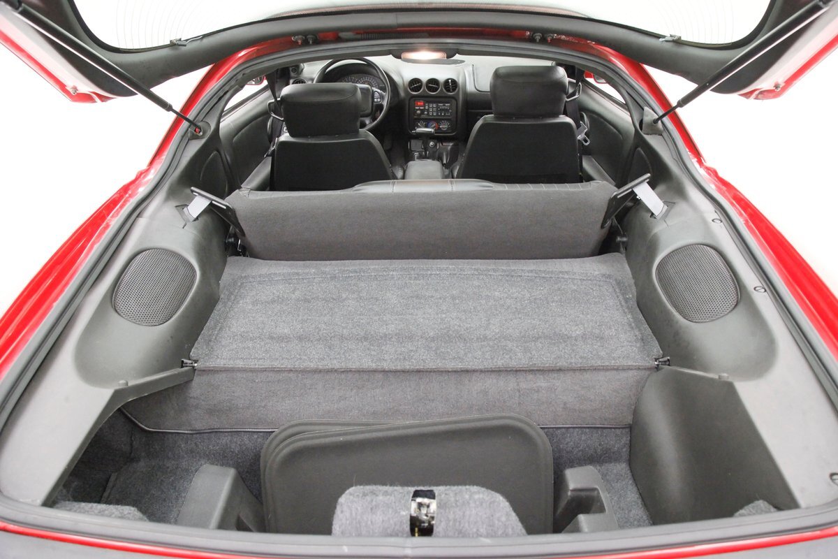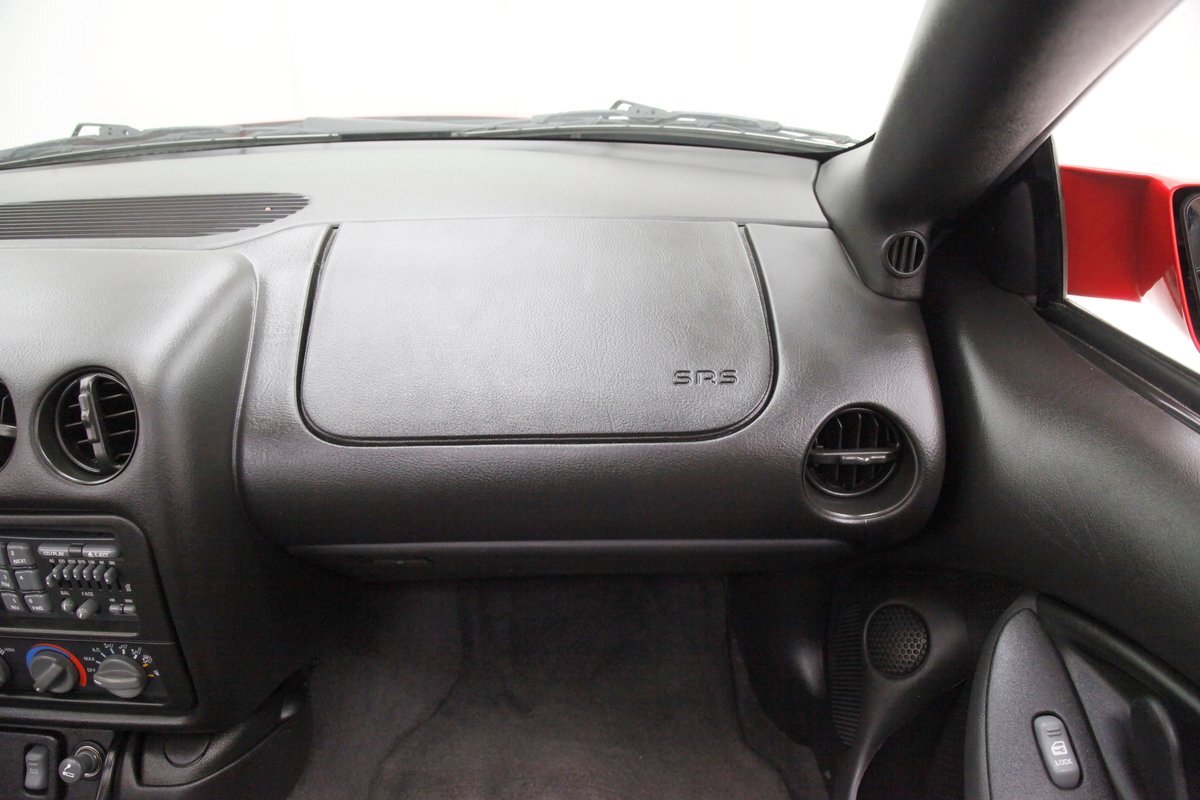 All dressed up in Bright Red, from the 2 bumps at the front of the fenders that magically turn into headlights, to the Ram Air intake cowling hood flanked by 2 front fender bumps, and more intake inlets on the quarter panels, we are in aerodynamic heaven. This styling continues to the severely raked windscreen, to the rear trunk lid that seems to go on forever as it becomes an integrated spoiler and all the bulbous contours of the body. All in nice condition, and an available T-top setup comes with this car. Honeycomb style wrap around tail lights bring up the tail end and hover above a Bright Red neoprene crash bumpers. Factory correct 16-inch wheels wearing 245/50ZR16 rubber are seen on all 4's.