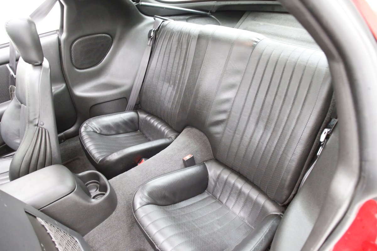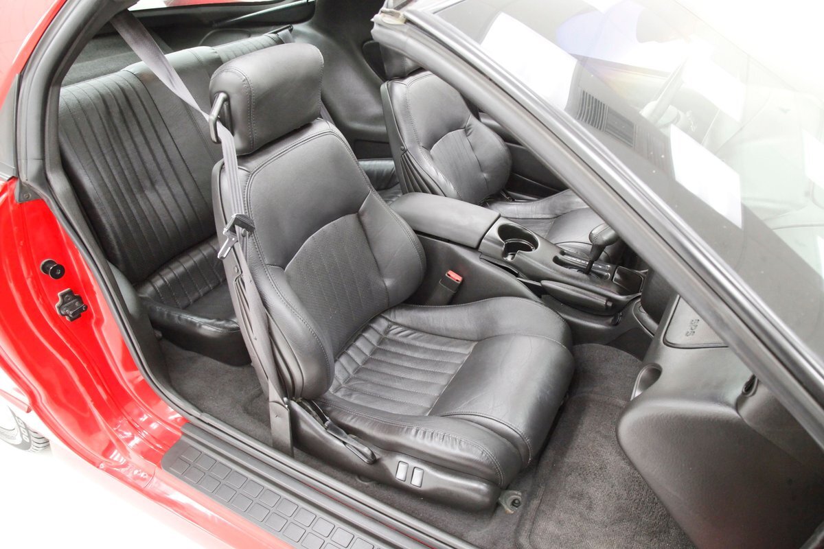 Ebony leather covers the two front power buckets, the rear 2+2 bench, and steering wheel, as well as gearshift. Leather is soft and supple, showing no folds or errors. This car has 6-way power seats on the driver's side and a manually adjustable seat on the passenger's side with power lumbar adjustments. A swooping center console is flanked by the buckets and makes its way to the dash while including a glove box/armrest, cup holder, gearshift, climate controls, and AM/FM/CD player. The normal cluster instruments are clean and bright and nice matching Ebony gray carpet floods the floor and up high hangs a felted headliner that frames the tinted glass T-tops perfectly.