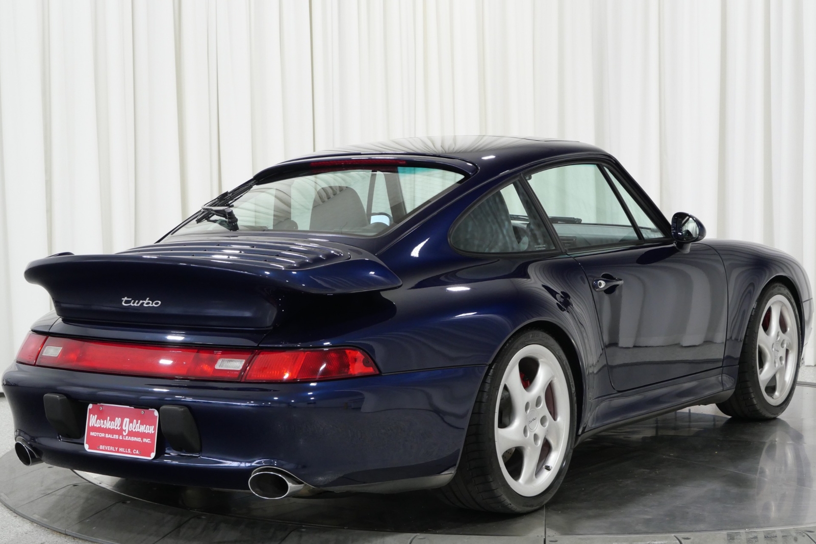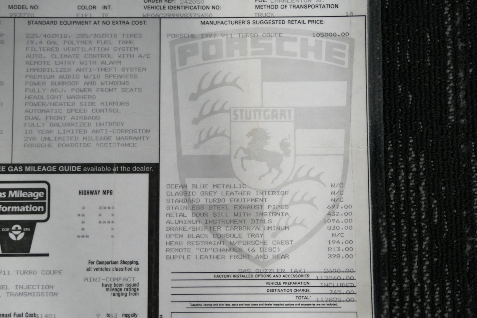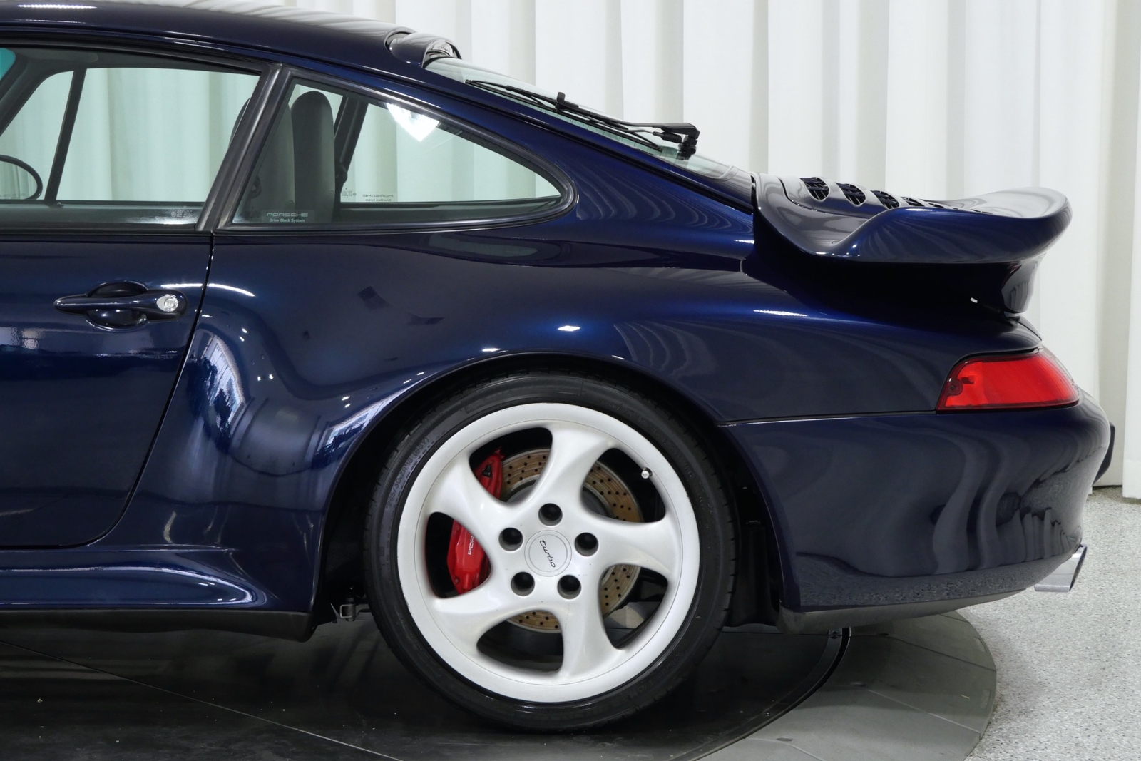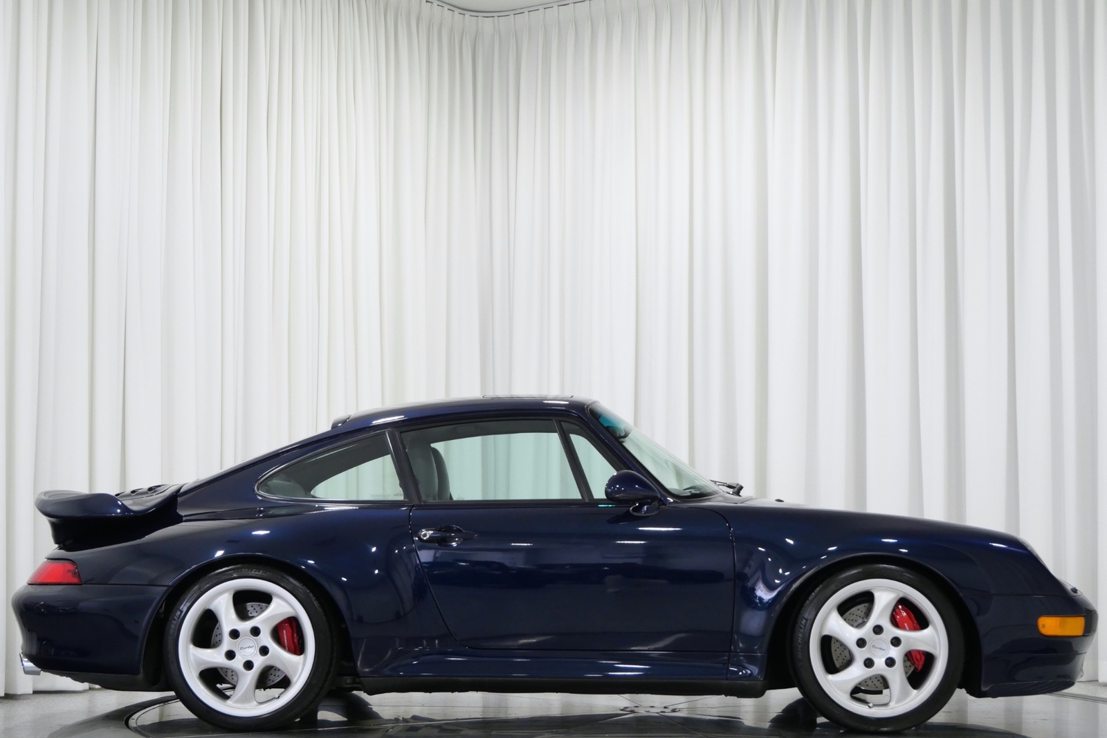 We have just added to our extensive exotic car inventory a beautiful 1997 Porsche 911 Turbo in Ocean Blue Metallic over Classic Grey leather with only 22,988 original miles. This Turbo is loaded with: 3.6L twin turbo flat six, 6 speed manual transmission, eight way seats left and right, aluminum shifter and handbrake handles, aluminum gauge faces, stainless steel sill plates, stainless steel oval exhaust tips, 6 CD changer, Porsche crests embossed in headrests, supple leather front and rear, sunroof, rear wiper, cruise control, floor mats, the window sticker, keys, books, tire inflator and much more. This is a very well cared for, low mile 993 with a stack of service records, a fresh dry ice blasting (check out the super clean chassis pics) in a great color!