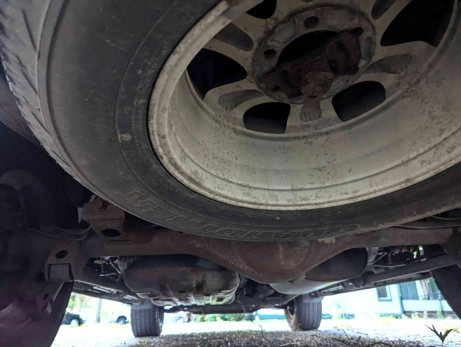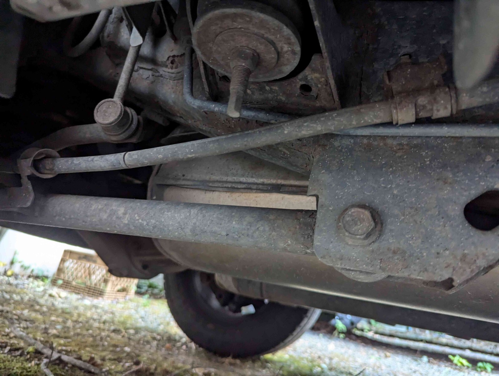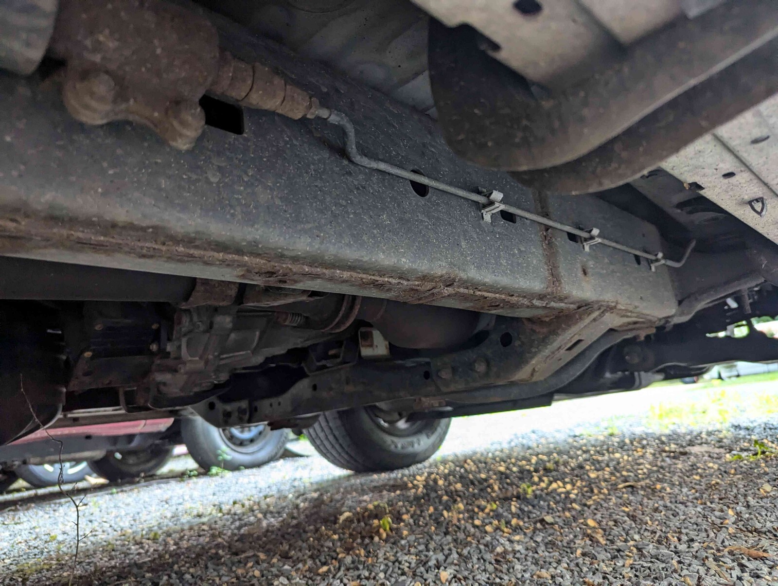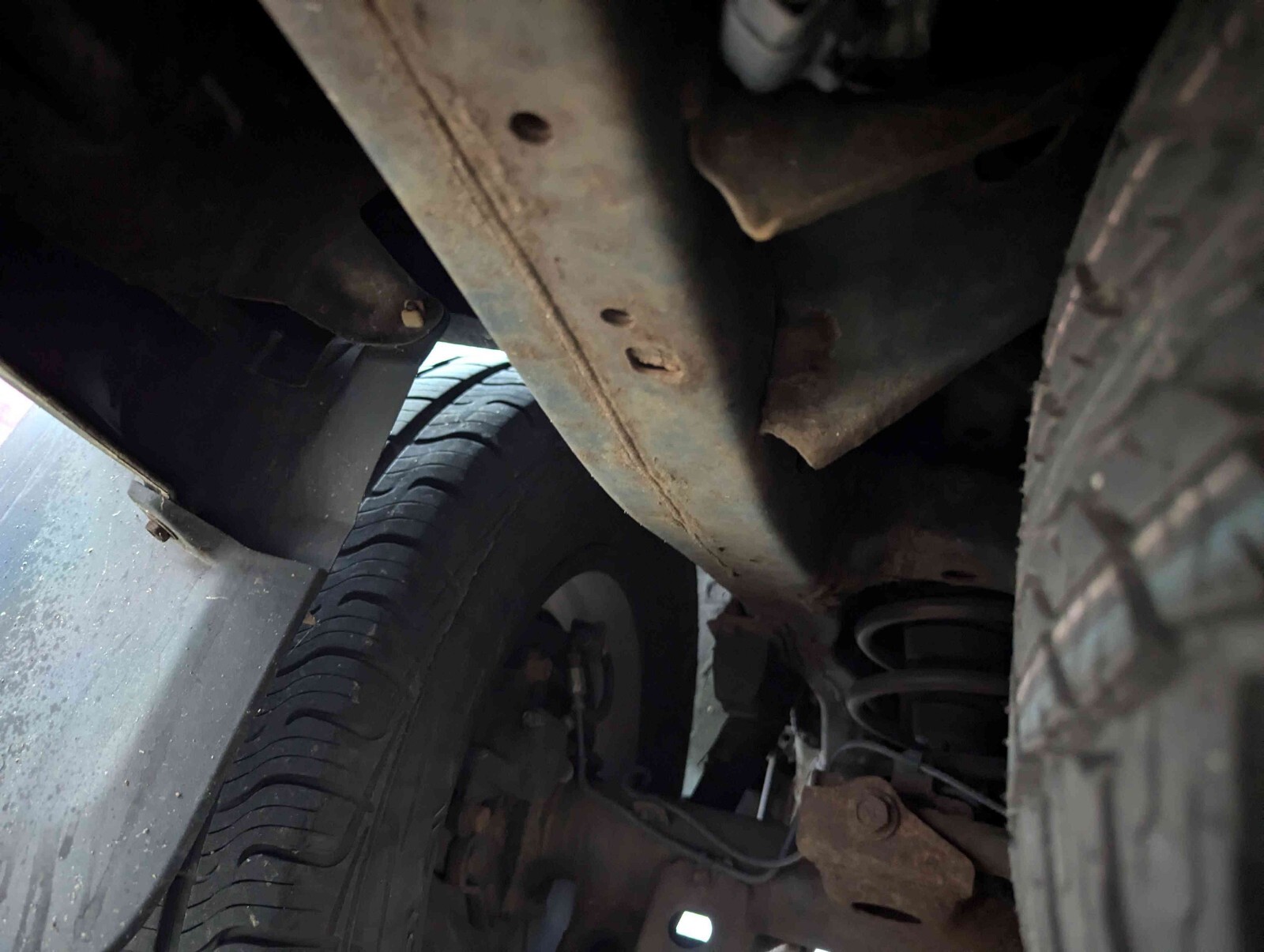 Very front of frame in picture stabilizer bar on right side broke off of frame radiator support rusty