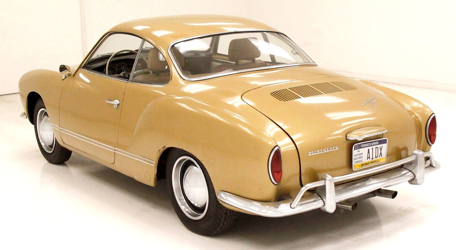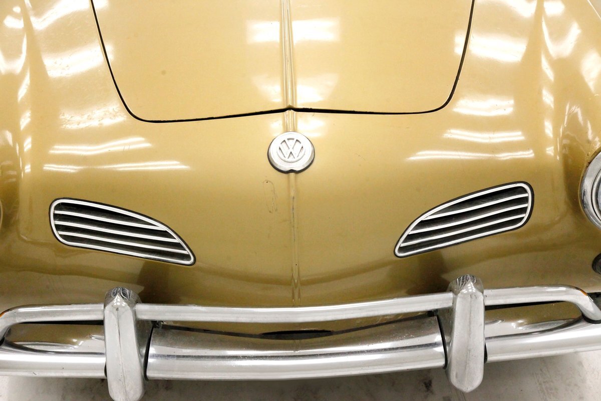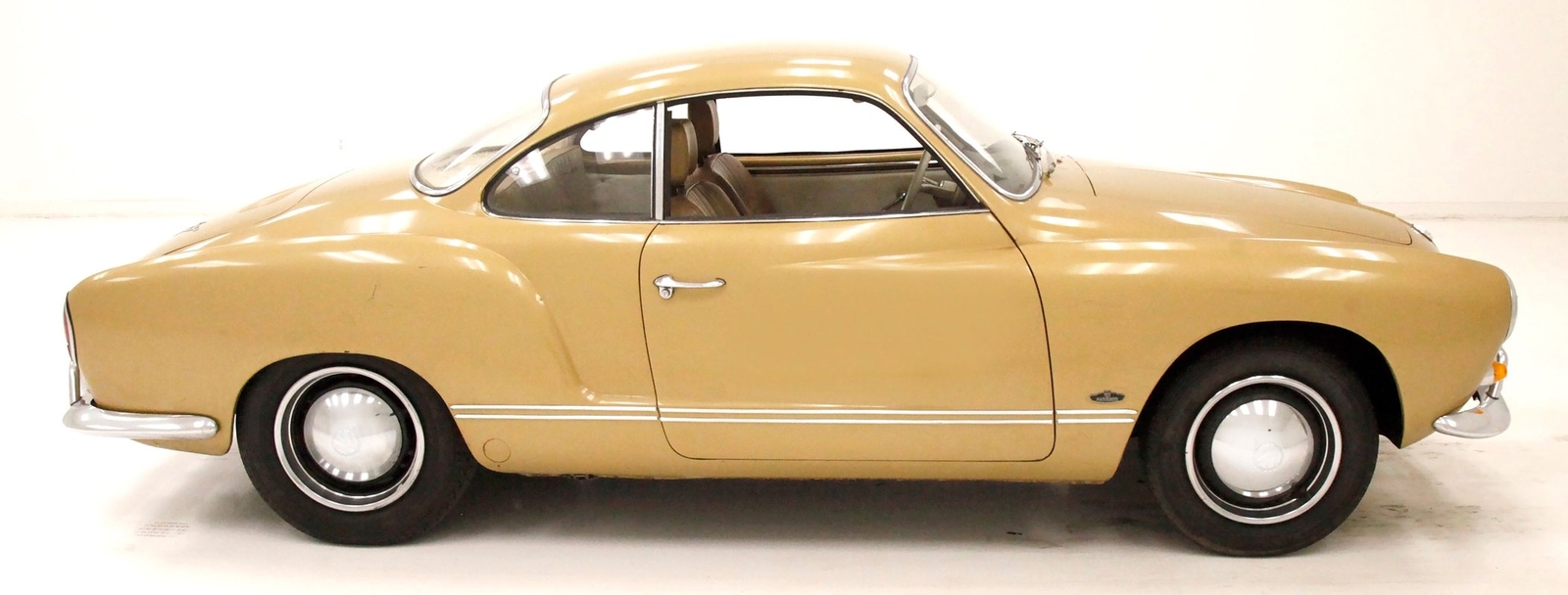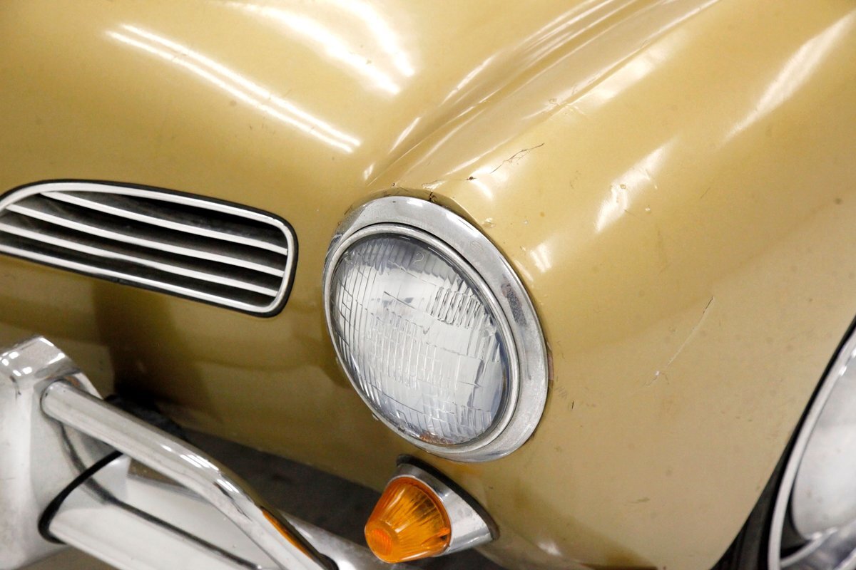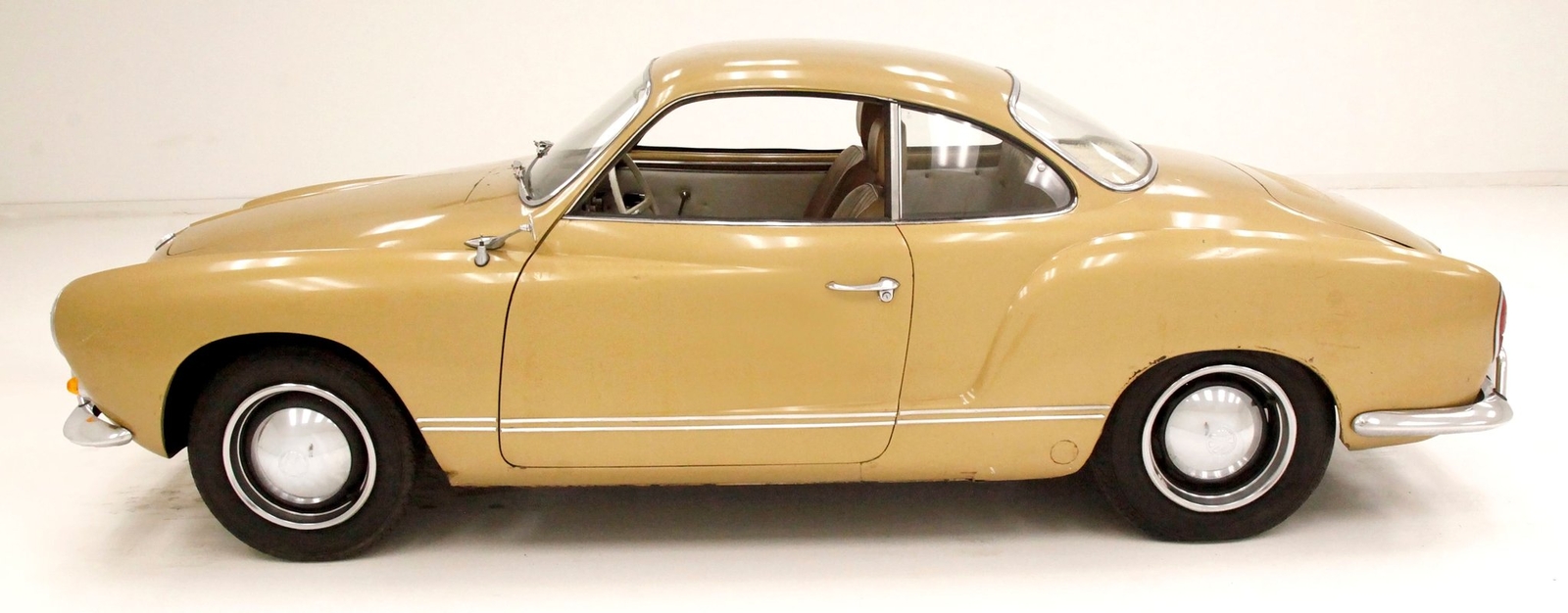 For consignment, a Karmann Ghia coupe right out of 1964. Presenting well as a garage/barn find and was previously owned by our consignor's uncle who had the car painted gold, had a crate engine installed as well as performing the beginnings of a 12 volt conversion after the 6 volt generator died. At that point, the uncle's health started to fail and the car sat in a garage until a few weeks ago when it was unearthed. This sports car version from Volkswagen comes to our Hallowed Halls as a running and driving project, but will need work to be roadworthy. Break out your toolbox and with some hard work and sweat equity you'll have a VW at its best with the sports car genre ready for the taking, just fall in love, pay the price and...auf wiedersehen!