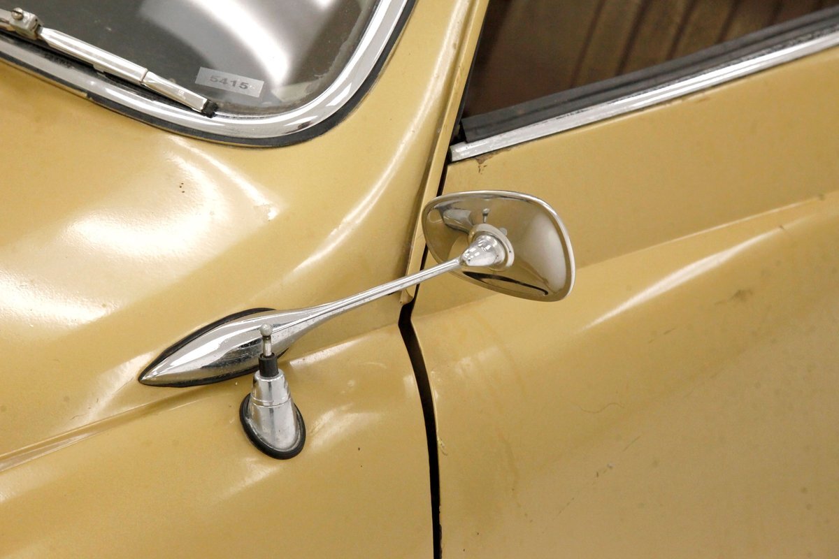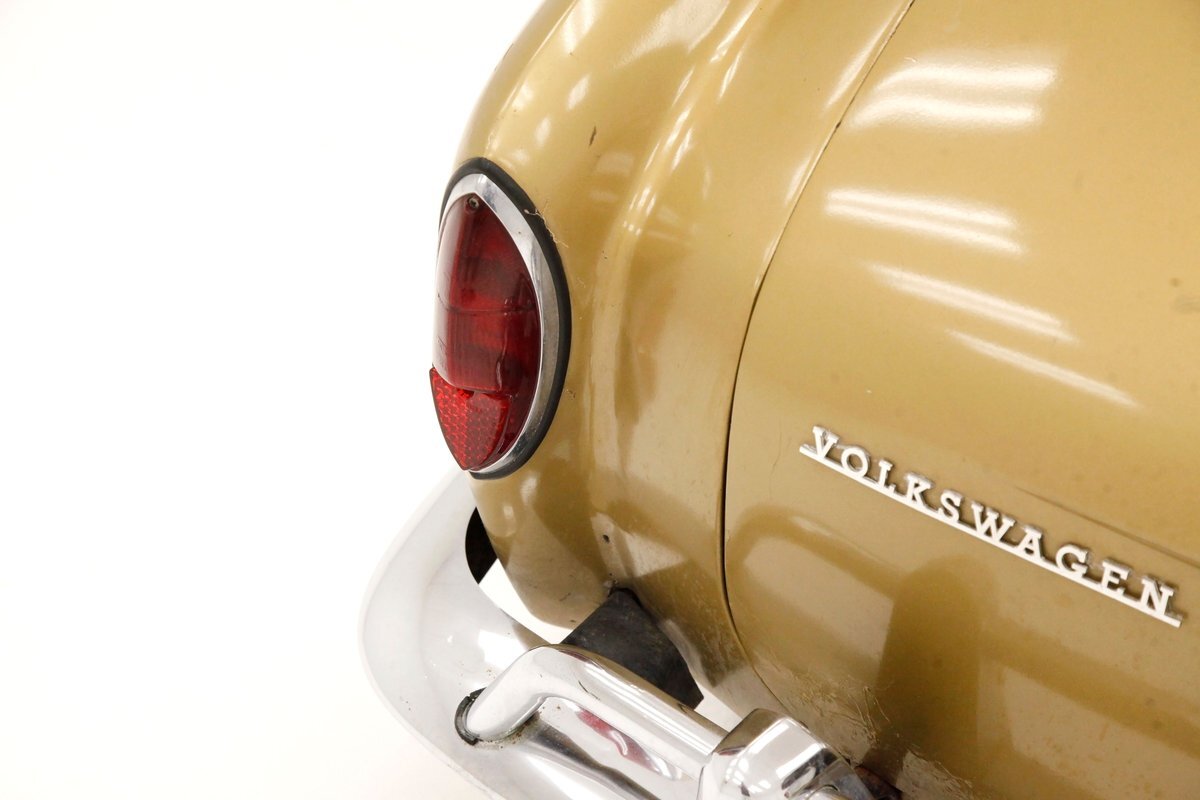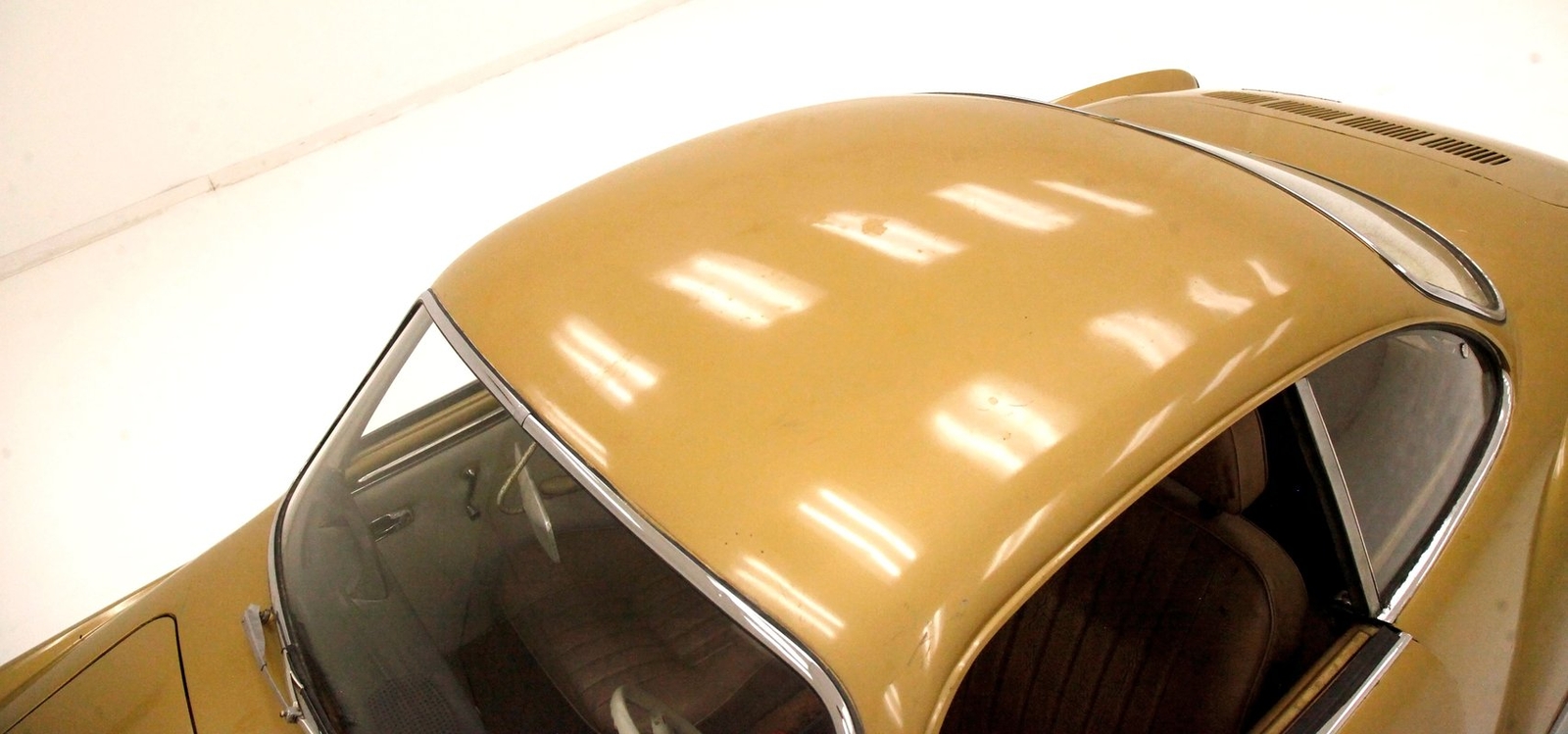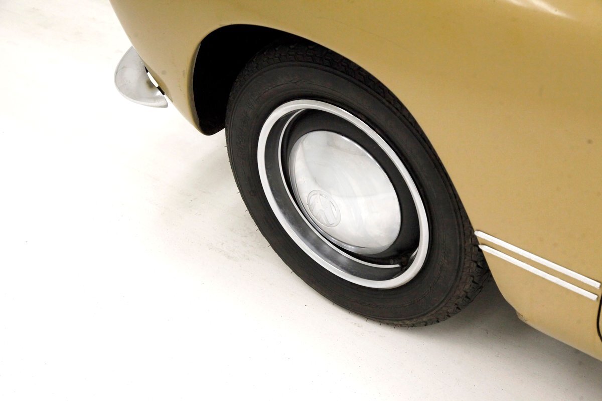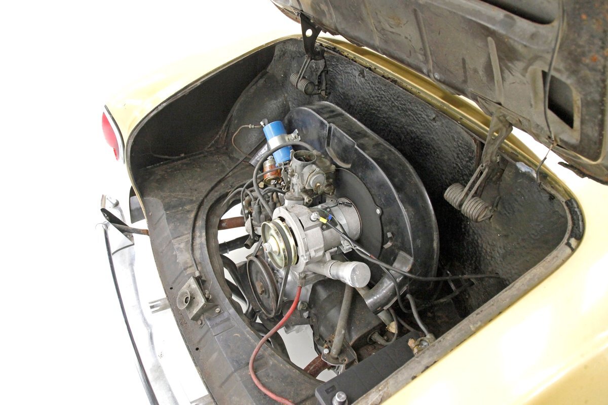 The closest thing you can get to a Porsche 356, and actually it's handmade from the factory due to the body being made entirely of one piece. Yes, save for the doors, hood and trunk lid, all panels were shaped then welded together then hand sanded down to the shape you see. This one is painted in a Chevrolet gold and the door gaps are straight, however we do note some invasive rust, body filler and repairs in the lower sections all around. These repairs have started to show through with some cracking, blistering and the worst being the lower rear quarters and rockers that are now showing bubbling, but the overall shape of the car and metal is just smooth curves. Lightly tarnished chromed accenting for the bumpers, bumperettes, bedrail guards, badging, small grille openings, and a dual lower trim strip, but all still retaining a shiny finish. Black and stainless surrounds are noted for the windows and the glass is excellent and all clear. Black steel wheels are all around and are topped with VW badged moon caps and trim rings. Schnell! Schnell!