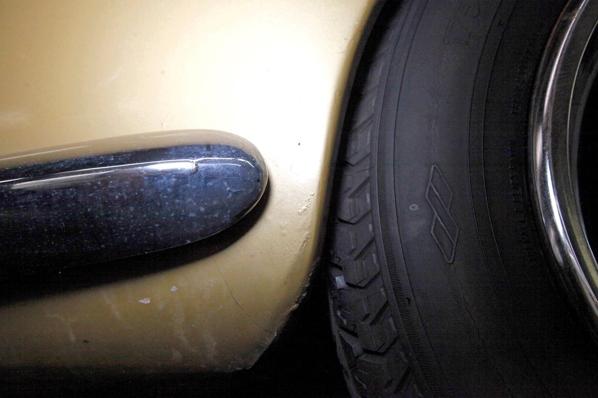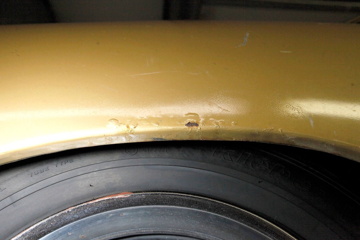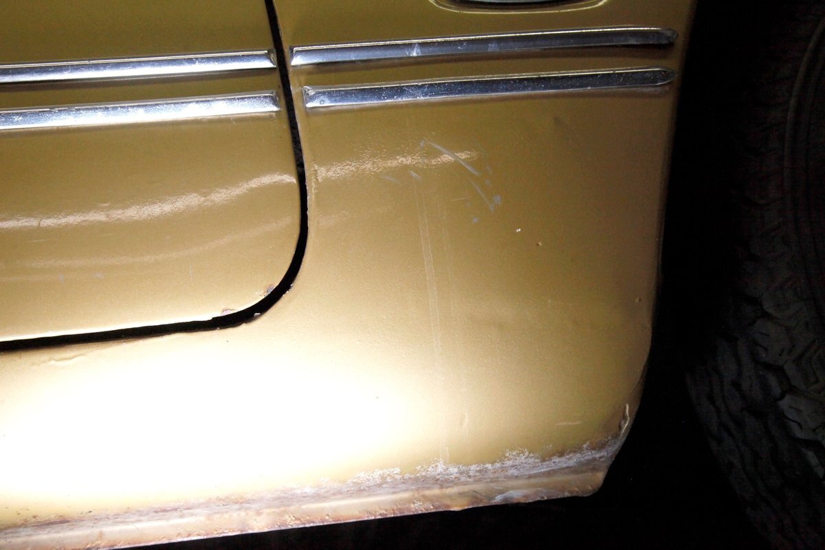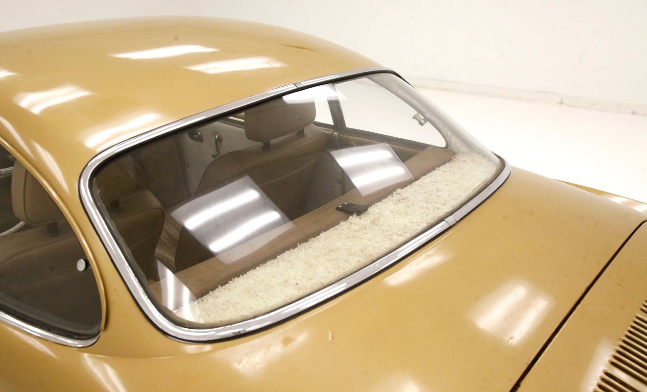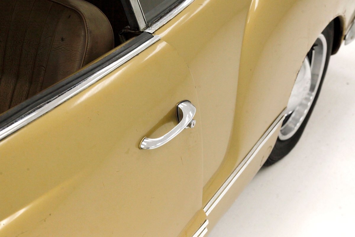 The closest thing you can get to a Porsche 356, and actually it's handmade from the factory due to the body being made entirely of one piece. Yes, save for the doors, hood and trunk lid, all panels were shaped then welded together then hand sanded down to the shape you see. This one is painted in a Chevrolet gold and the door gaps are straight, however we do note some invasive rust, body filler and repairs in the lower sections all around. These repairs have started to show through with some cracking, blistering and the worst being the lower rear quarters and rockers that are now showing bubbling, but the overall shape of the car and metal is just smooth curves. Lightly tarnished chromed accenting for the bumpers, bumperettes, bedrail guards, badging, small grille openings, and a dual lower trim strip, but all still retaining a shiny finish. Black and stainless surrounds are noted for the windows and the glass is excellent and all clear. Black steel wheels are all around and are topped with VW badged moon caps and trim rings. Schnell! Schnell!