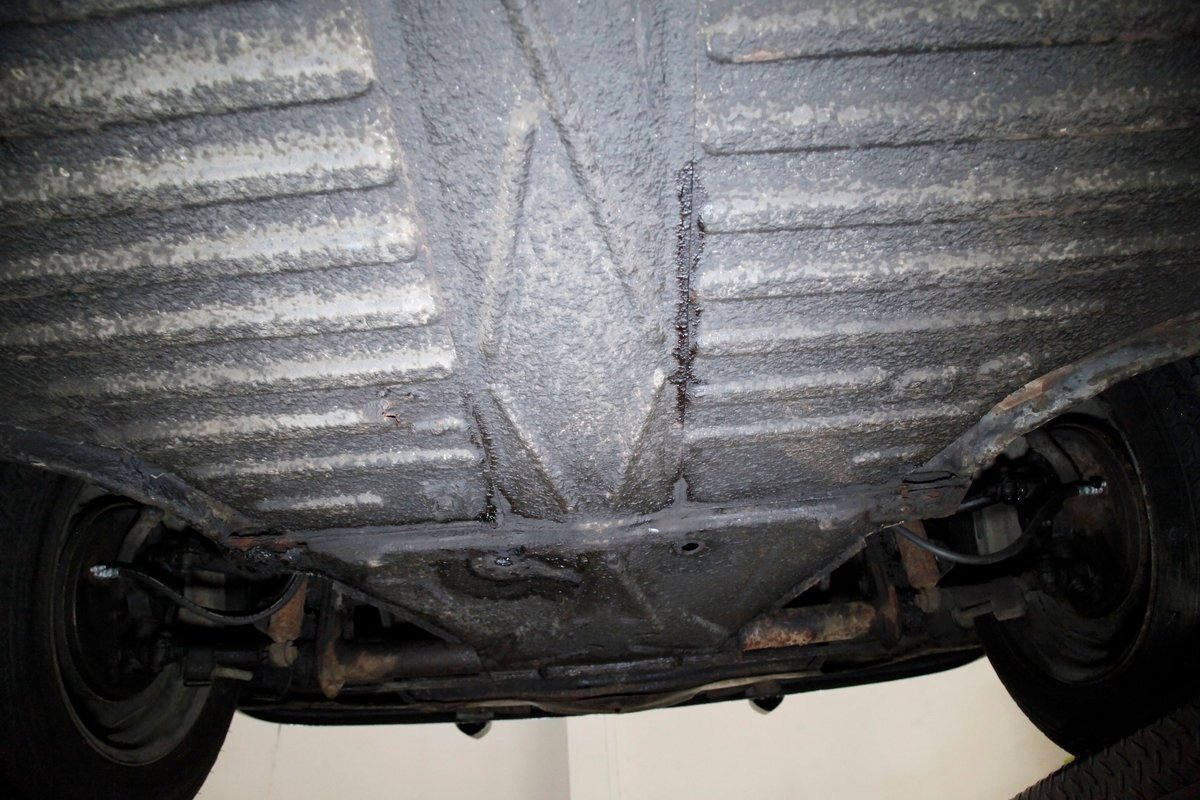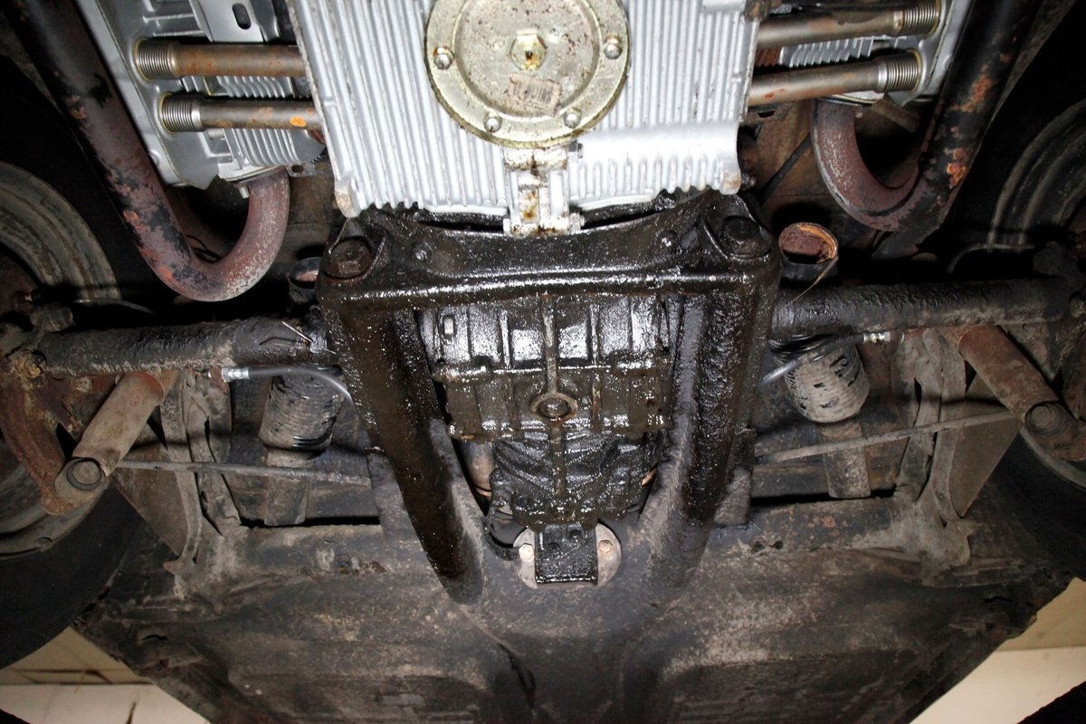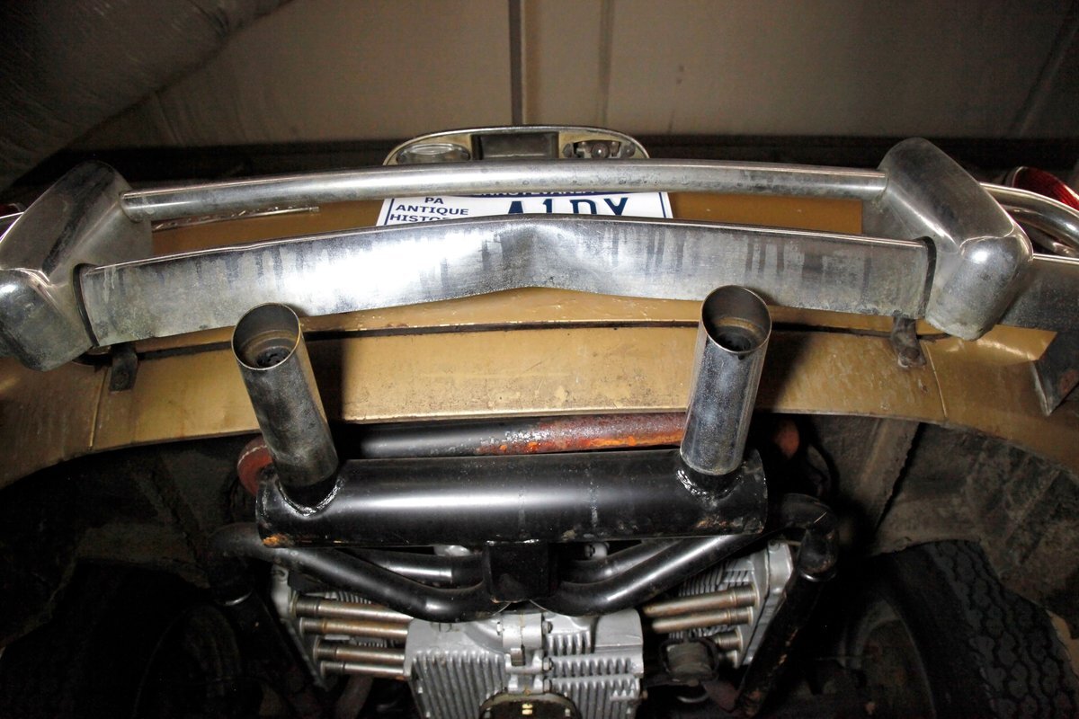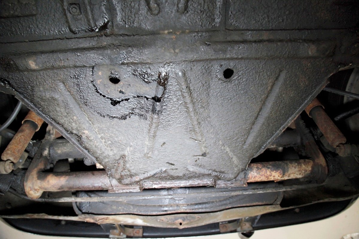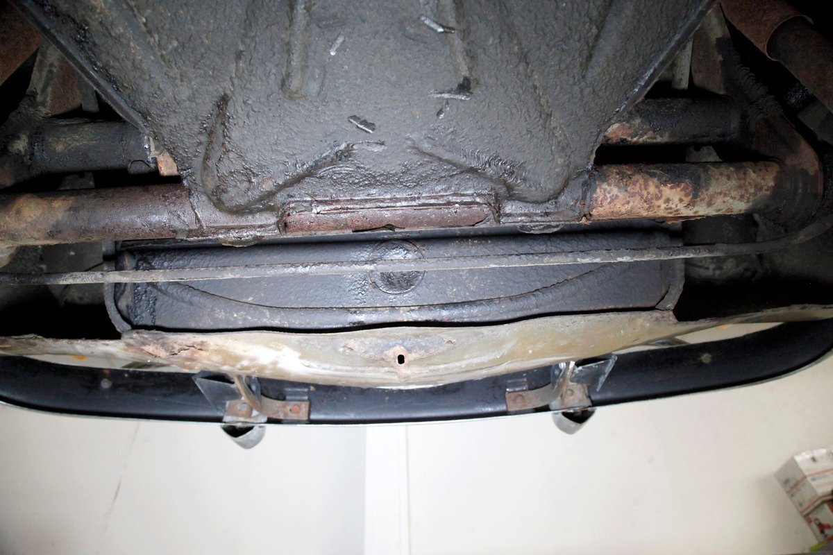 Still well intact with no rust is the unibody frame which uses the floor pans and central panel along with some steel tubing as the structure, and it is all solid. We do note some scale rust on the pinch weld of the rocker panels but all else is just perfectly patinaed black steel. Various under the engine parts are fairly clean and oil free; we note a stock style exhaust system with dual chrome tips. Independent transverse torsion bars for the front, and independent semi trailing arms for the rear suspension provides the ride and handling. Drum brakes with newer hoses are all around to provide the stopping power.