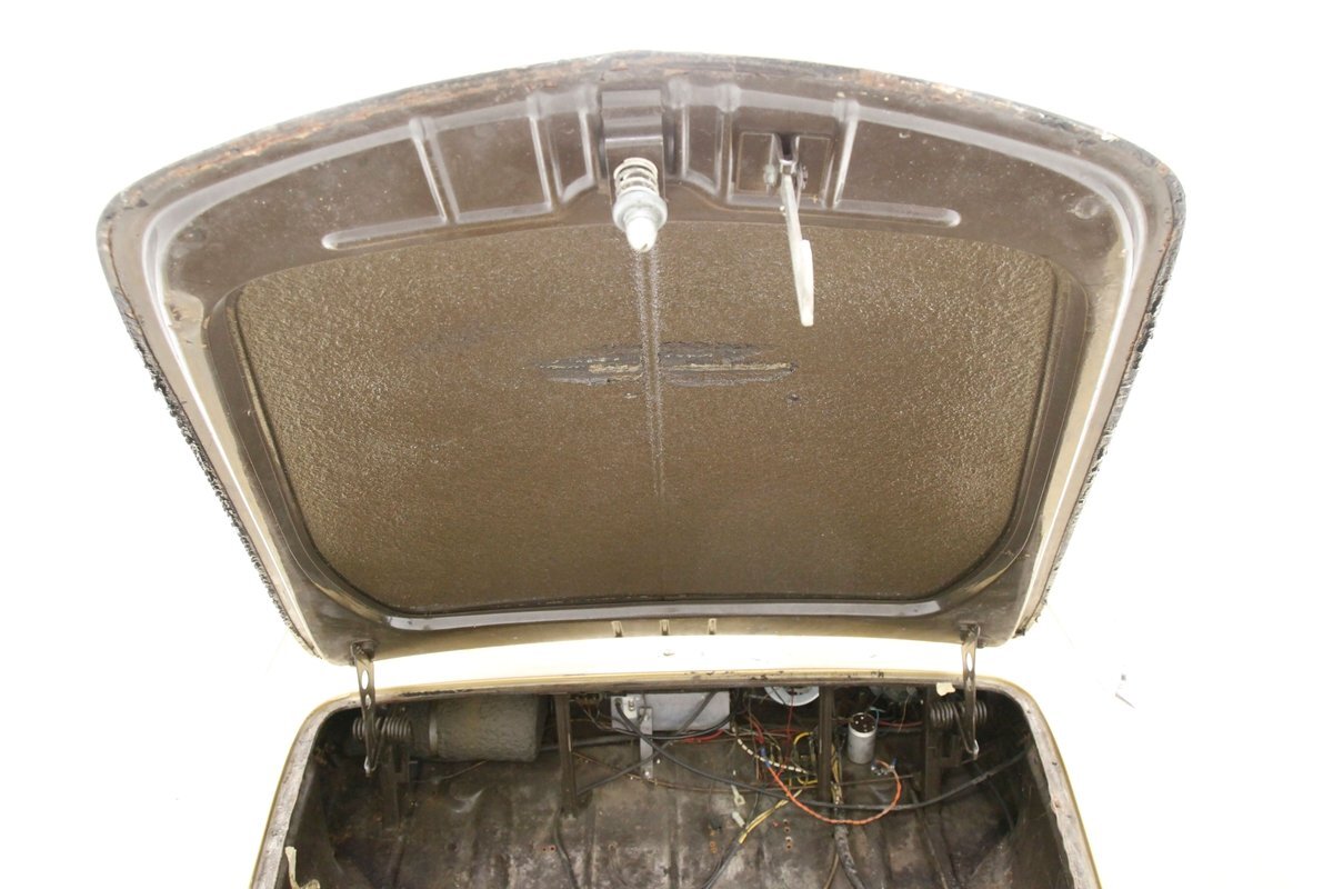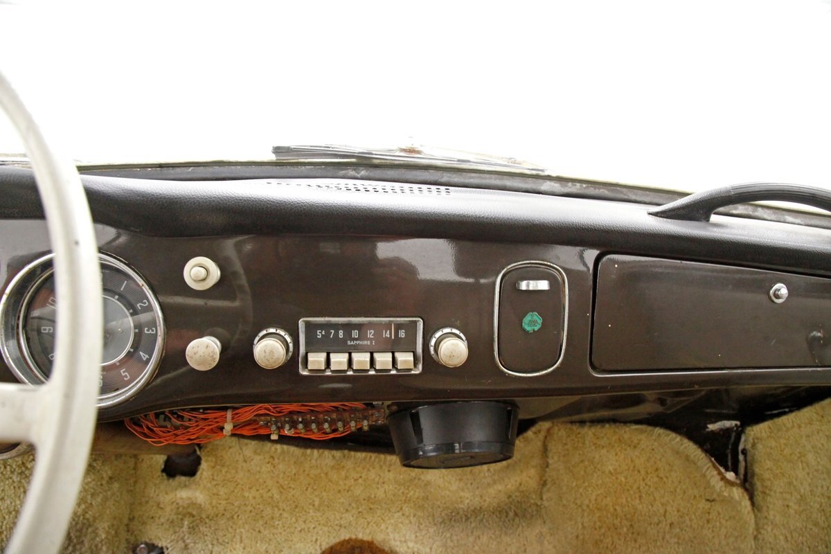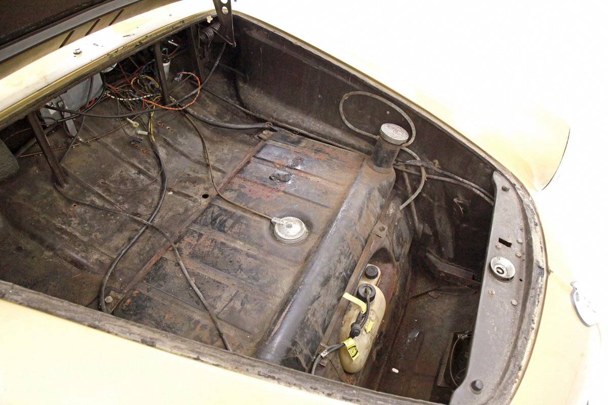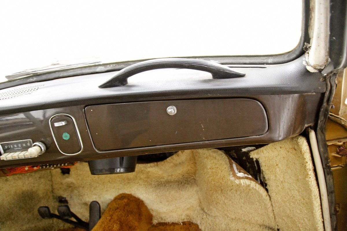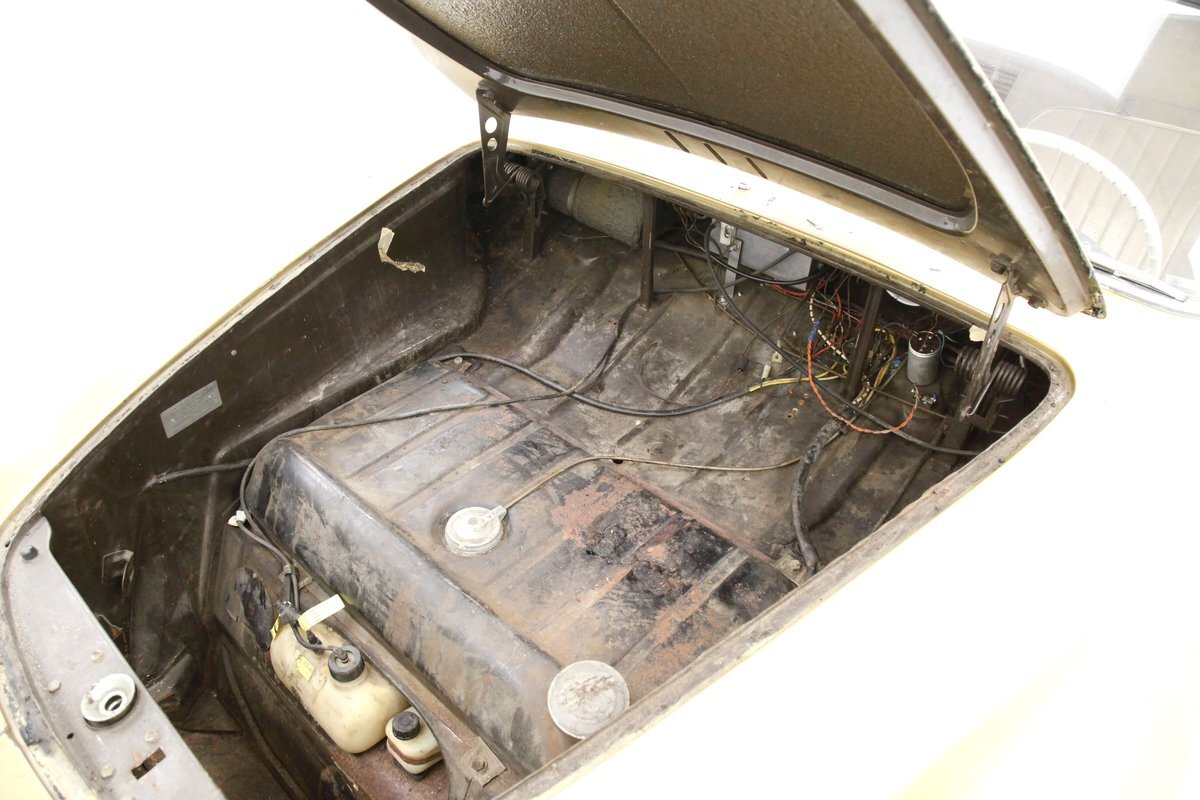 The interior follows the barn/garage find theme with an overall aged, but complete appearance. This is in the form of a light beige and brown household carpet that floats the sporty but simple interior and meanders under the curved brown steel dash above. Speaking of the dash, the brown steel front is very nice, as are all the inserts, gauges, knobs, lights, factory Sapphire I AM radio, all with just a hint of age and tarnishing. A small black padded dash top is seen above, and is also very nice, no cracks or fading. Fronting this wonderful dash is a white rimmed steering wheel with the Wolfsberg castle emblem in the center. Lightly soiled tan vinyl seats are in bucket form upfront, and a bench in the rear and are framed by nice white vinyl covered simplistic door panels and rear side panels with just a touch of wrinkling. A tight but lightly stained perforated vinyl headliner is seen above and is near perfection.