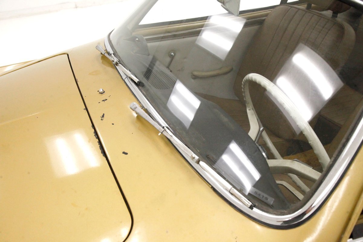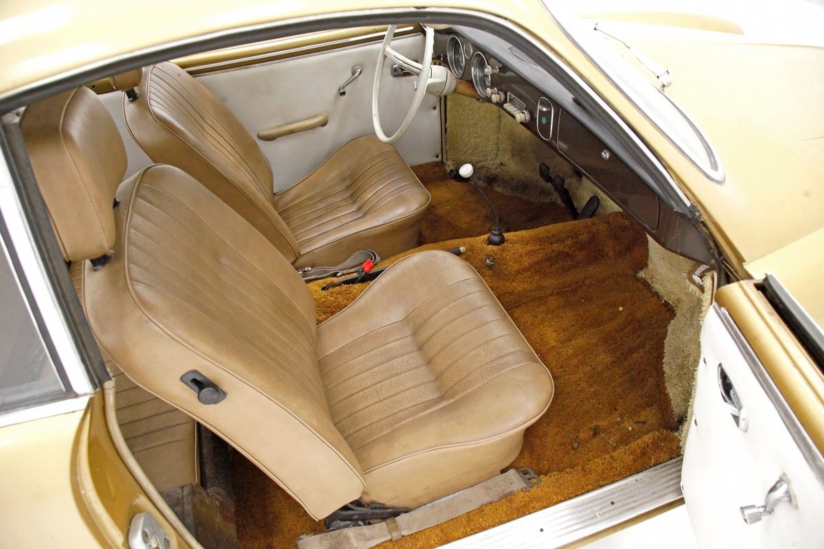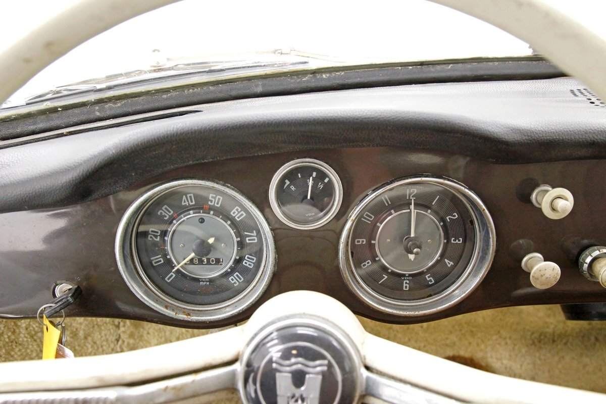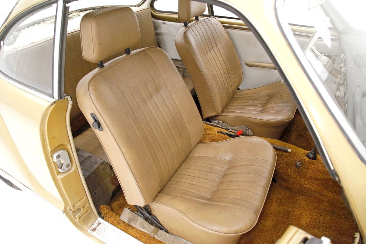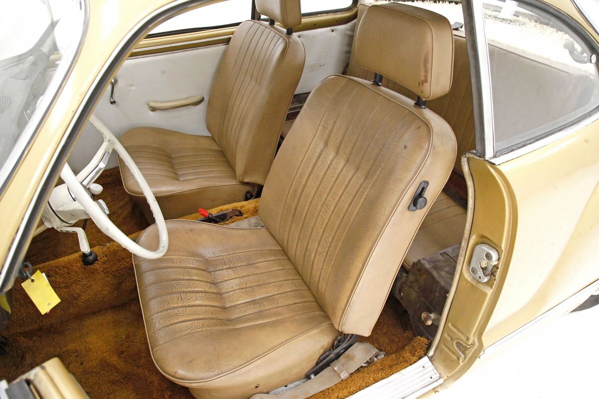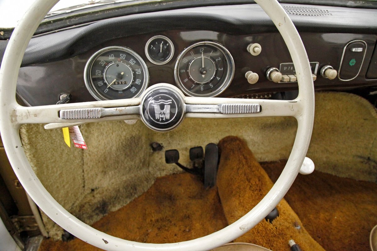 The interior follows the barn/garage find theme with an overall aged, but complete appearance. This is in the form of a light beige and brown household carpet that floats the sporty but simple interior and meanders under the curved brown steel dash above. Speaking of the dash, the brown steel front is very nice, as are all the inserts, gauges, knobs, lights, factory Sapphire I AM radio, all with just a hint of age and tarnishing. A small black padded dash top is seen above, and is also very nice, no cracks or fading. Fronting this wonderful dash is a white rimmed steering wheel with the Wolfsberg castle emblem in the center. Lightly soiled tan vinyl seats are in bucket form upfront, and a bench in the rear and are framed by nice white vinyl covered simplistic door panels and rear side panels with just a touch of wrinkling. A tight but lightly stained perforated vinyl headliner is seen above and is near perfection.