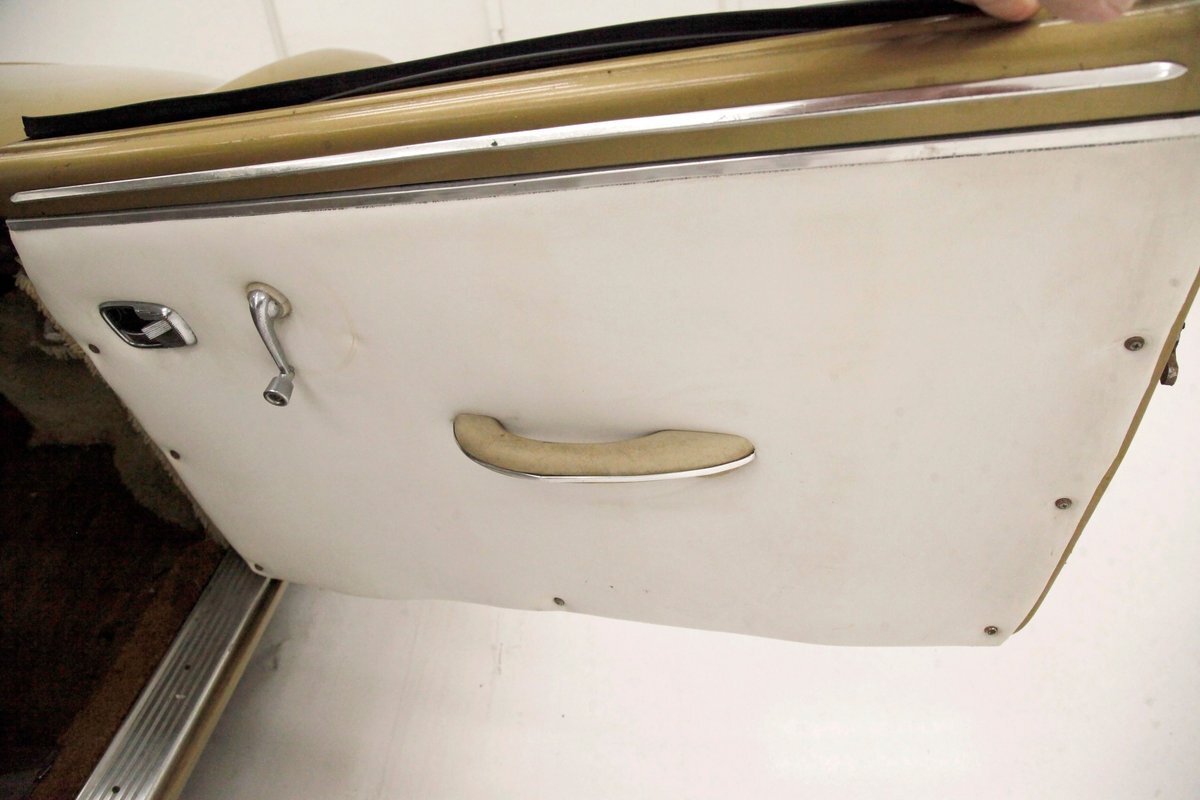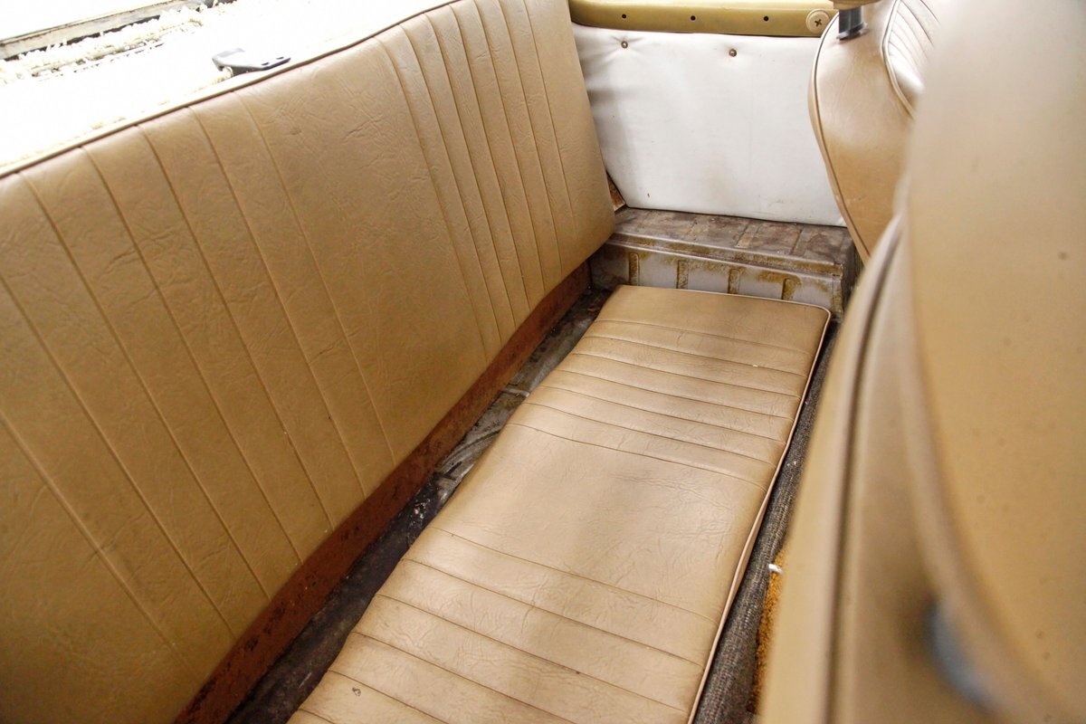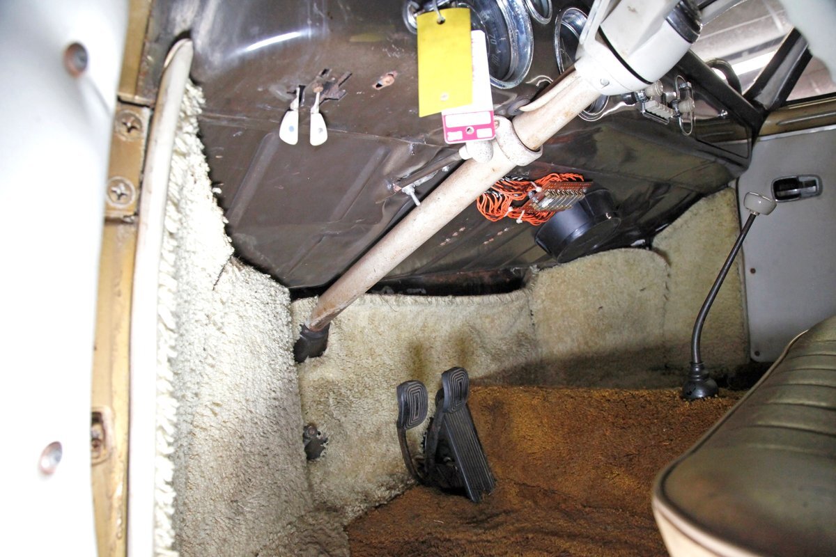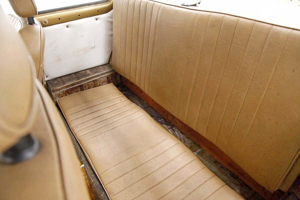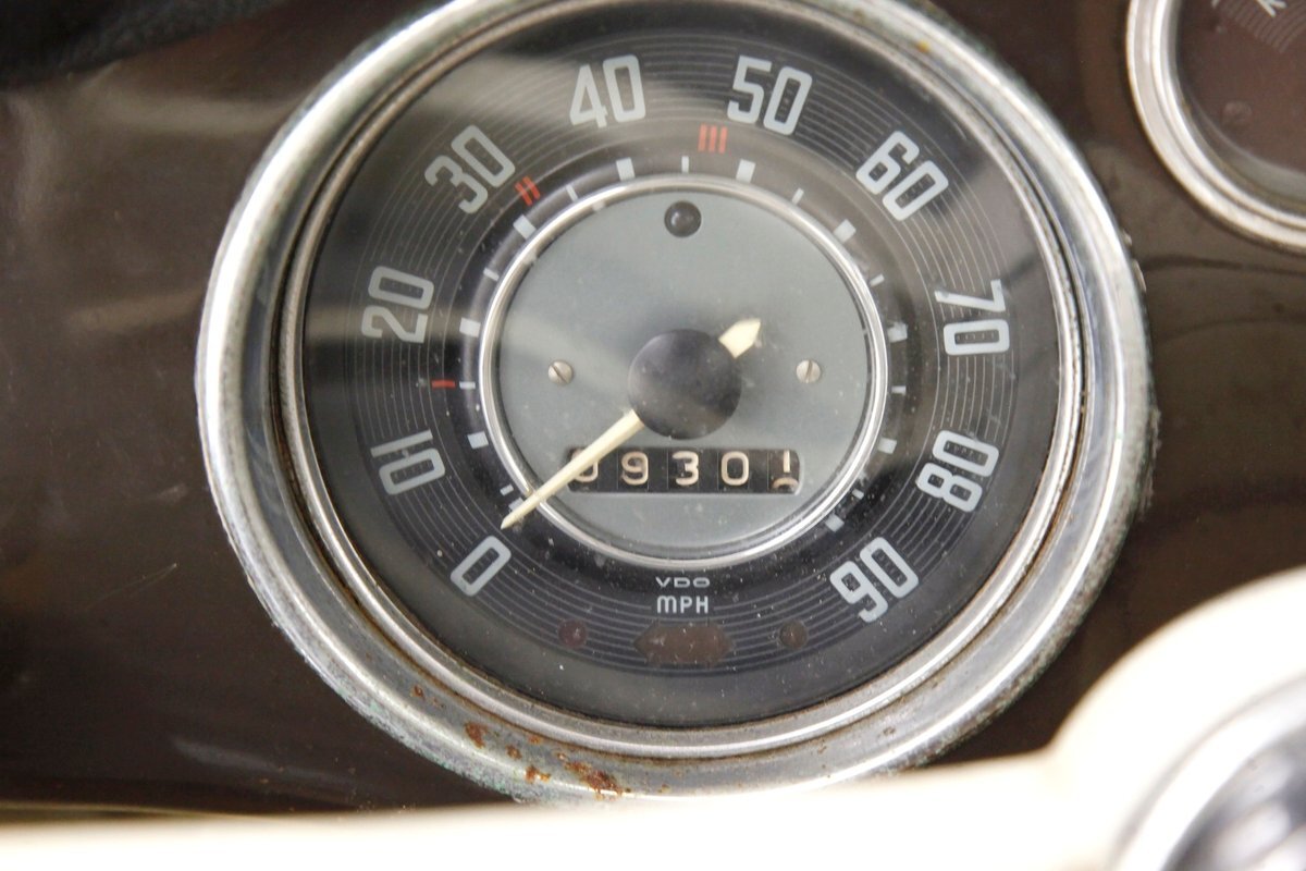The interior follows the barn/garage find theme with an overall aged, but complete appearance. This is in the form of a light beige and brown household carpet that floats the sporty but simple interior and meanders under the curved brown steel dash above. Speaking of the dash, the brown steel front is very nice, as are all the inserts, gauges, knobs, lights, factory Sapphire I AM radio, all with just a hint of age and tarnishing. A small black padded dash top is seen above, and is also very nice, no cracks or fading. Fronting this wonderful dash is a white rimmed steering wheel with the Wolfsberg castle emblem in the center. Lightly soiled tan vinyl seats are in bucket form upfront, and a bench in the rear and are framed by nice white vinyl covered simplistic door panels and rear side panels with just a touch of wrinkling. A tight but lightly stained perforated vinyl headliner is seen above and is near perfection.