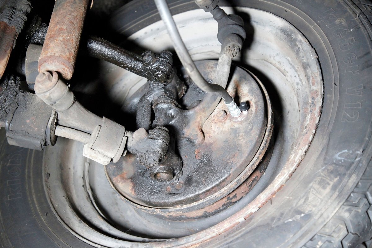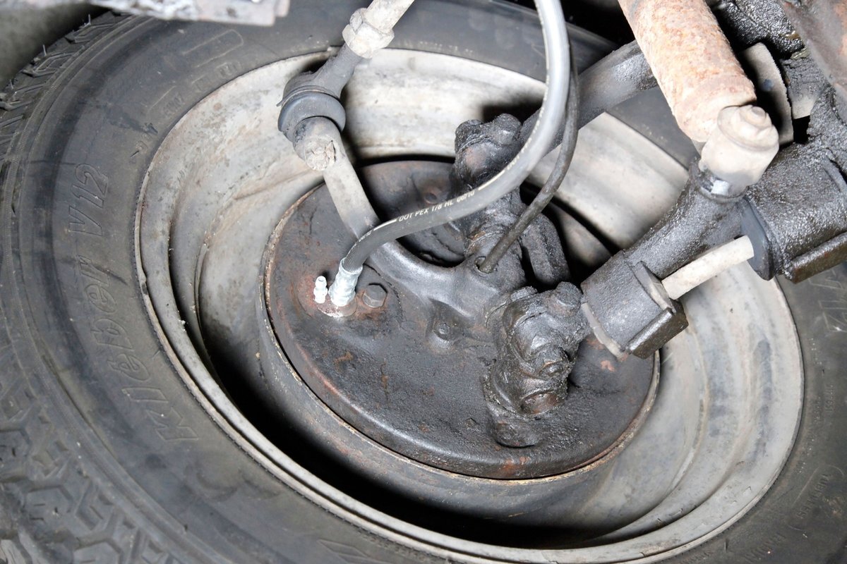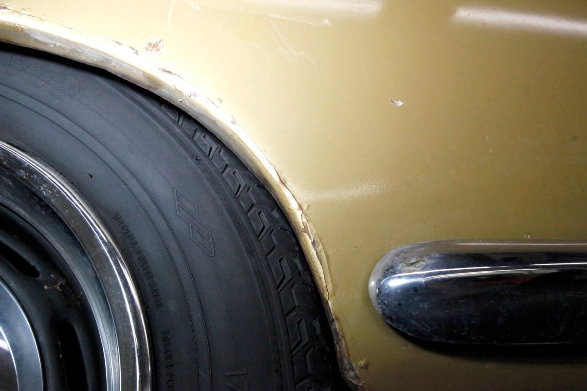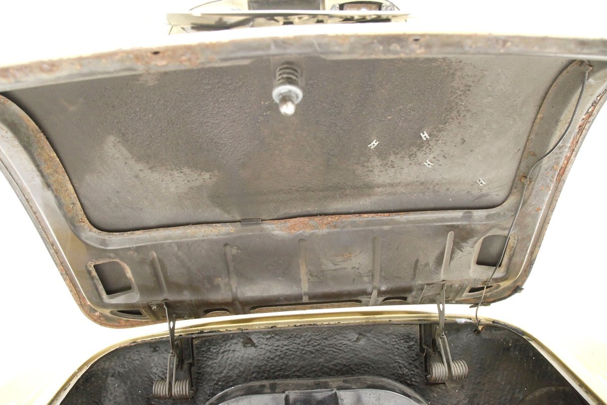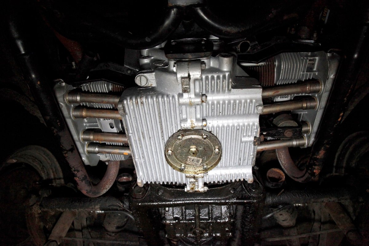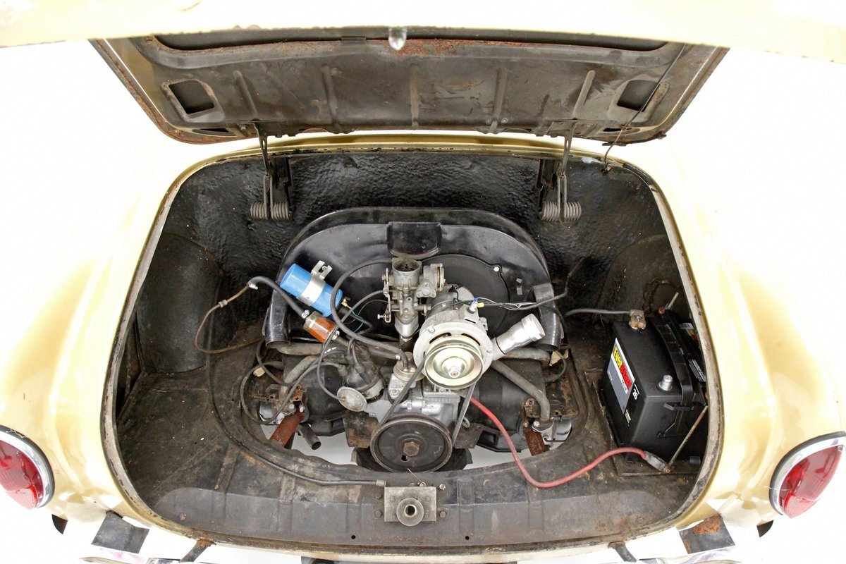 As with any VW you need to pop the boot to see the power plant, so we did! Here we were met with a low mileage 1200c 4-cylinder air cooled crate engine. Very little corrosion, and a light coating of dust back here along with a light patina and some surface rust all working with each other on the parts. A rebuilt 1-barrel Solex carburetor is feeding the 4 cylinders, and power goes to a 4-speed manual transmission A 4.12 rear axle ratio is noted for this drivetrain.